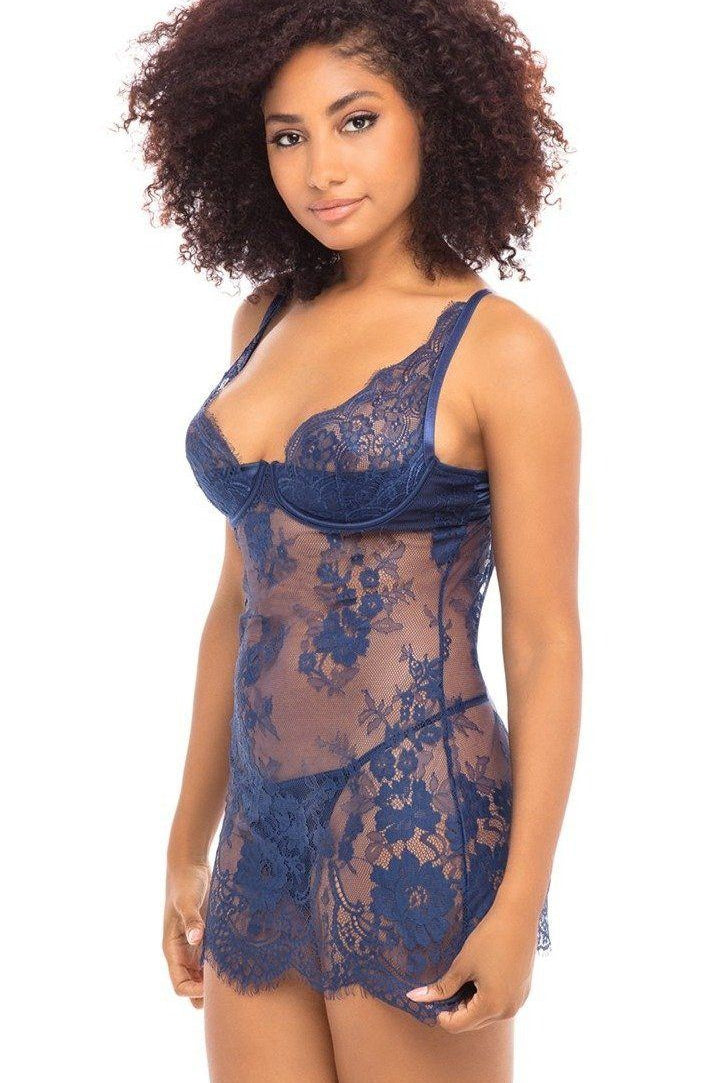 Eng anliegendes Babydoll mit durchgehender Spitze, gepolsterten Satin-Cups und G-String
