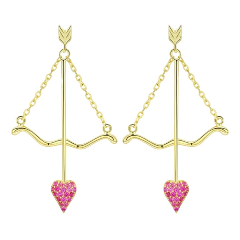 Design: Silberne Schleife an einer Kette und herzförmige, baumelnde Ohrringe mit Pfeilmotiv.