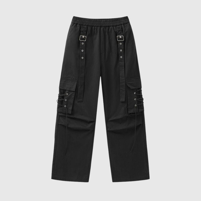 Eigenschaften: Hose. Cargohose. Weites Bein. Einfarbig. Knopfband-Design. Kordelzug-Taschendekoration. Elastischer Bund. Gerades Bein . Lockere Passform . Unisex. Paar-Outfits.