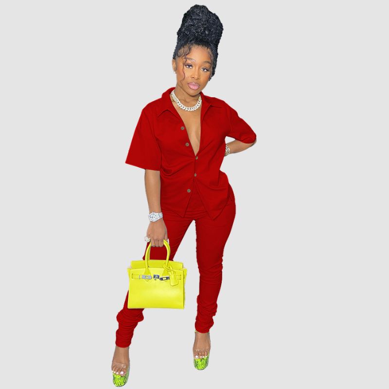 Eigenschaften: Set. Hosen. V-Ausschnitt. Hemden. Revers. Lange Hosen. Einfarbig. Kurze Ärmel. Hohe Taille. Eng.