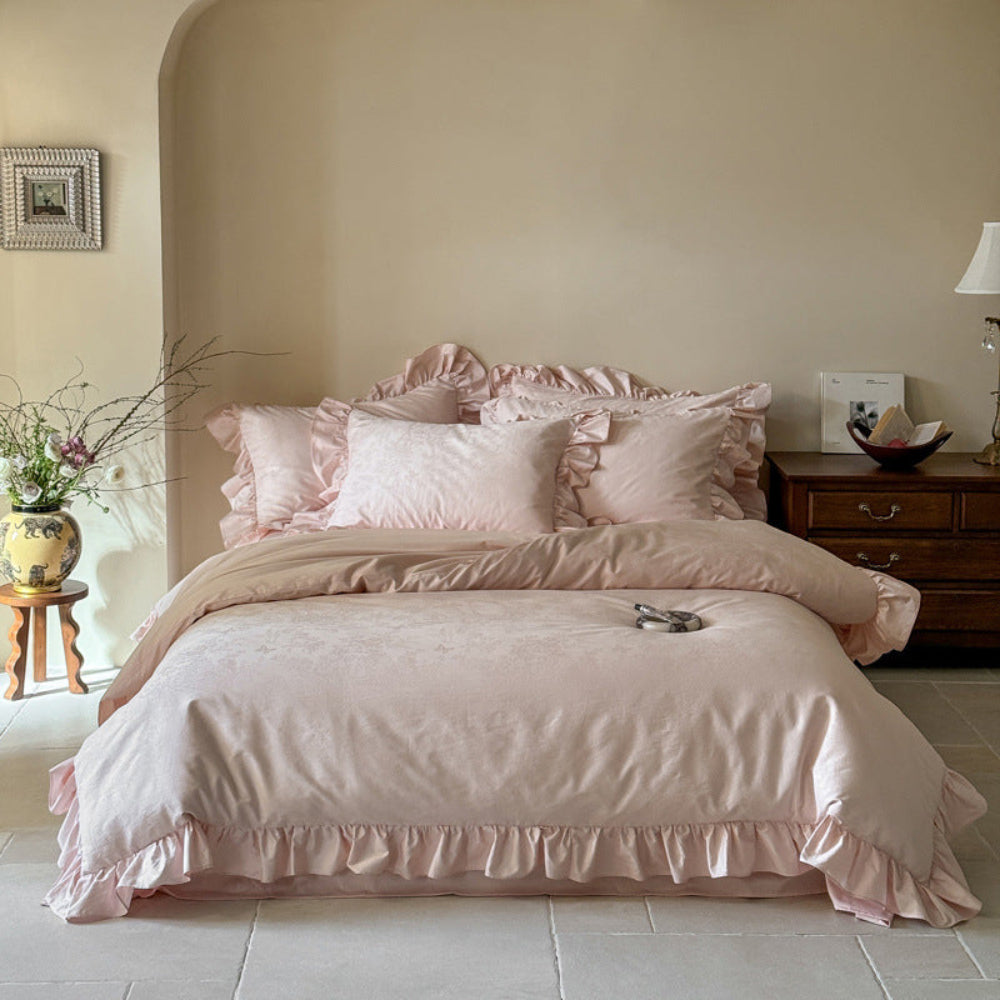 Elevate your bedroom with the graceful elegance of the Elise French Lace Jacquard Satin Bedding Set by Magchic. Featuring a smooth. luminous satin finish and delicate French lace accents. this set blends classic charm with luxurious comfort. The intricate jacquard pattern adds texture and sophistication. while corner ties and a hidden zipper provide a secure. tailored fit. A perfect choice for creating a romantic and refined retreat.