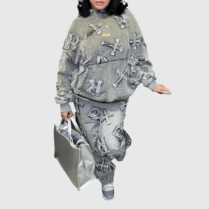 Denim-Kapuzenpullover-Set mit Buchstabenstickerei