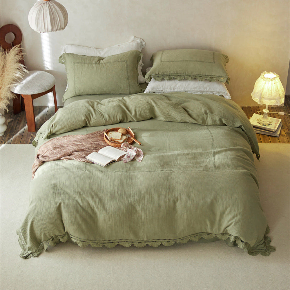 Gracefully designed for serene nights. the Magchic's Isadora Lace Ruffle Double Gauze Bedding Set blends elegance with unmatched softness. Crafted from breathable double gauze fabric. it drapes lightly for a relaxed yet refined feel. Lace detailing and gentle ruffles elevate its timeless charm. while the duvet cover includes corner ties and a hidden zipper to keep everything secure and perfectly in place. A beautiful choice for an effortlessly elegant bedroom.