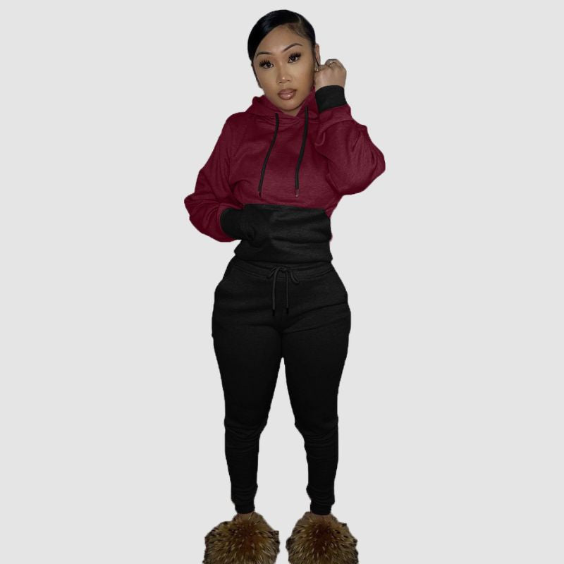 Eigenschaften: Set. Hosen. Kapuzenpullover. Lange Ärmel. Lange Hosen. Figurbetont. Patchwork-Design. Farbkontrast. Kordelzug in der Taille. Hohe Taille.