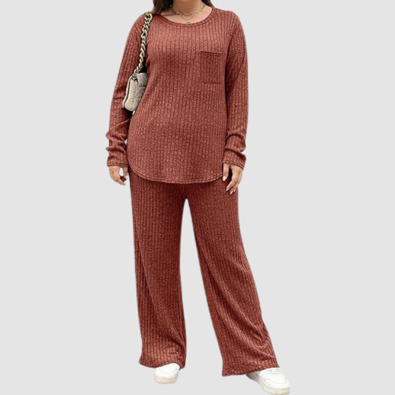 Eigenschaften: Set. Hose. Pullover. Strick. Langarm. Rundhalsausschnitt. Taschenaufnäher-Design. Rippenstrick. Einfarbig. Warm. Lockere Passform .