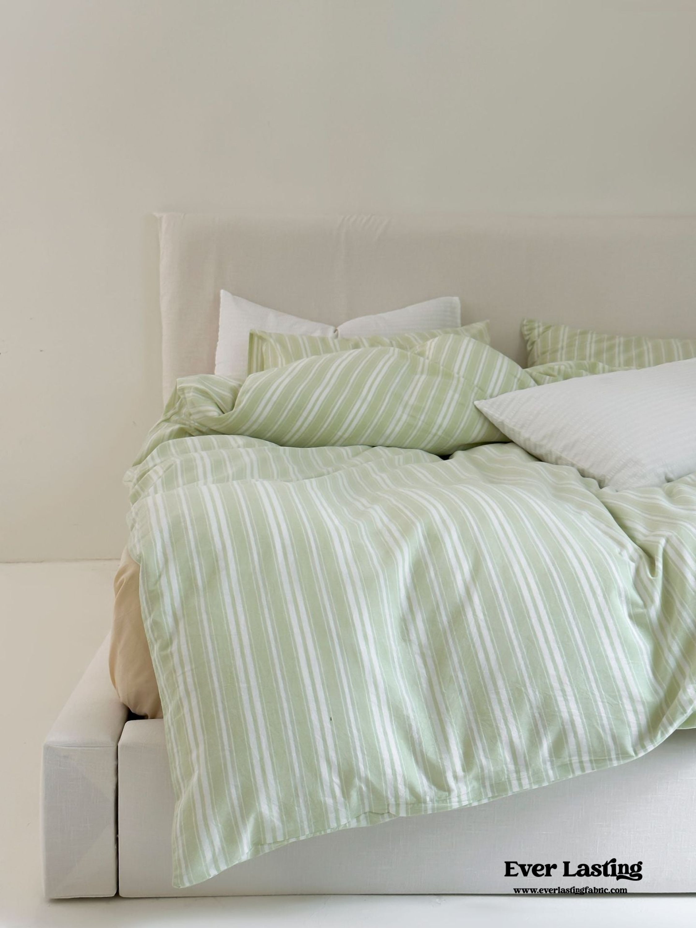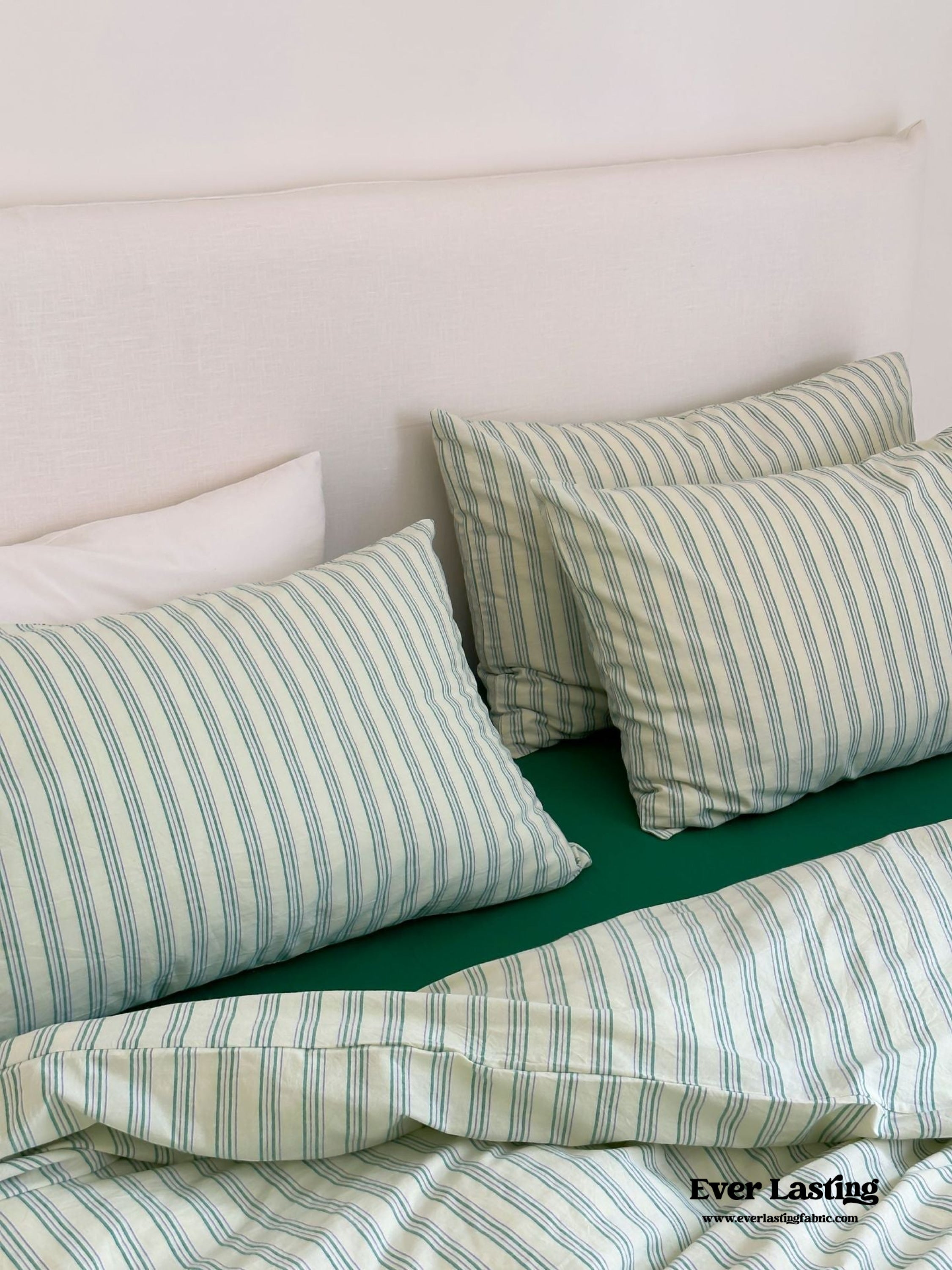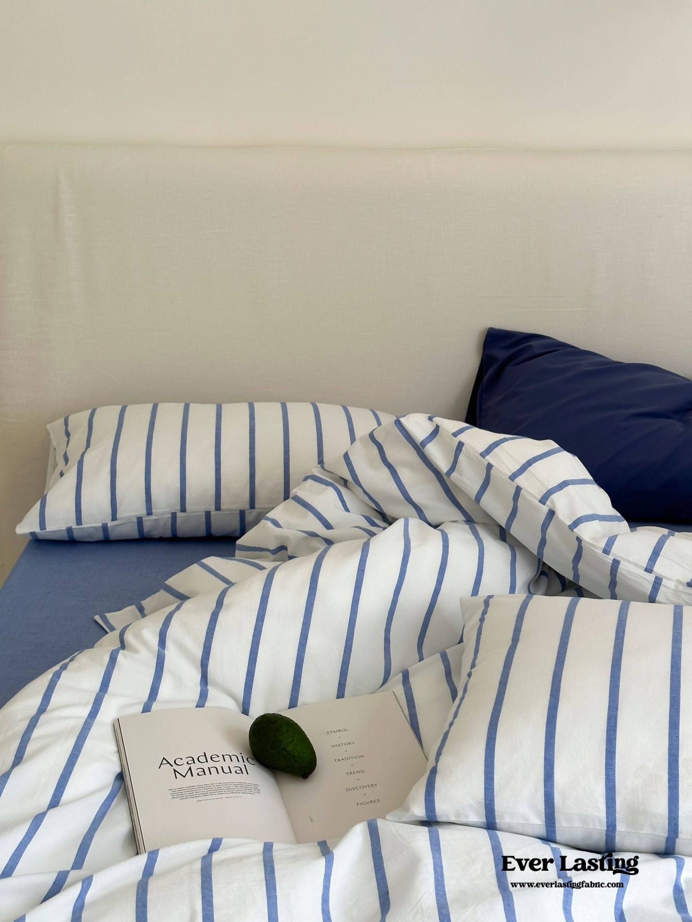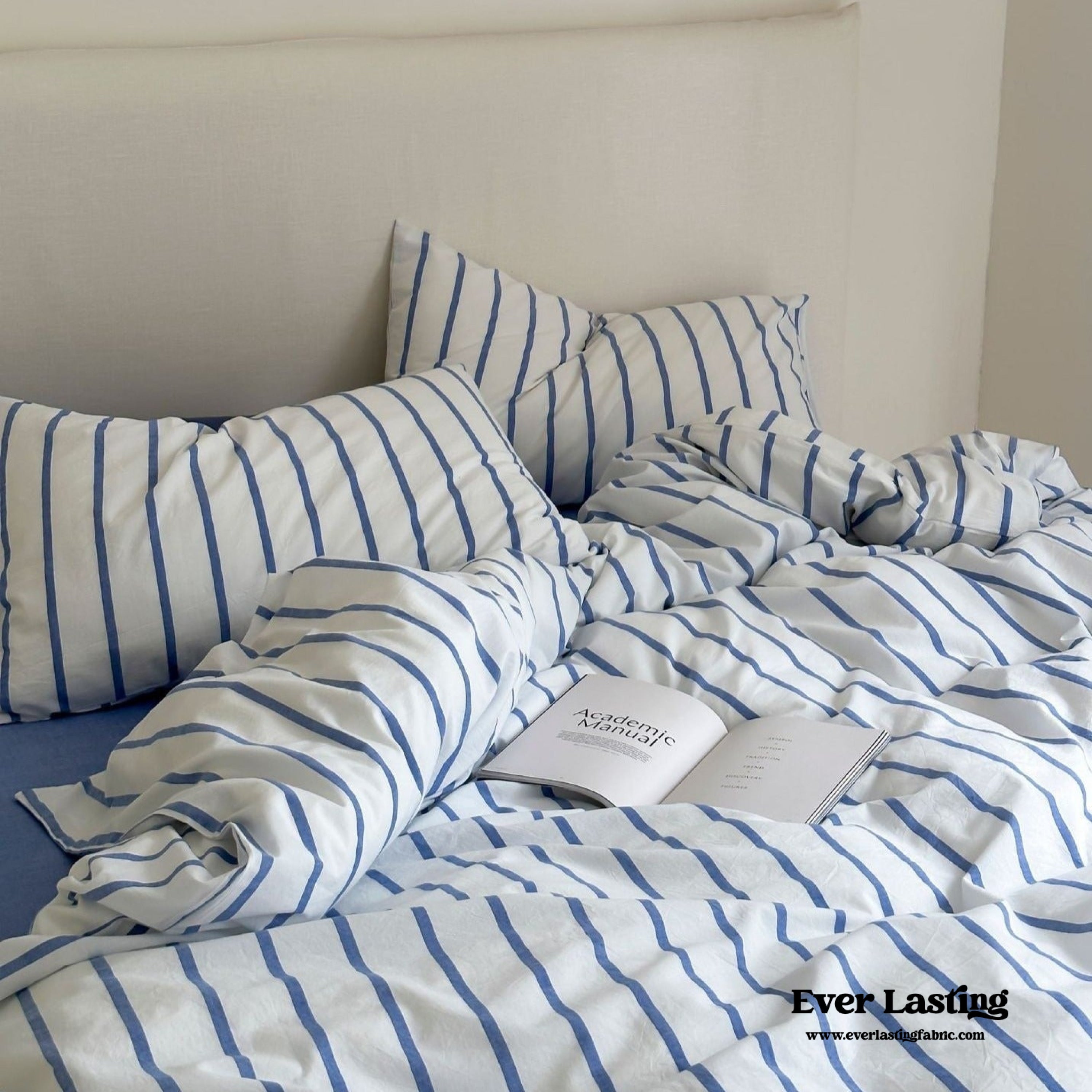 Elevate your sleep experience with our Refreshing Washed Cotton Stripe Bedding Set. Crafted from 100% washed cotton. this set offers a combination of casual elegance and ultimate comfort. The timeless stripe pattern adds a touch of sophistication to your bedroom decor. Each duvet cover comes with corner ties and a high-quality invisible zipper for easy use and a secure fit. Complete with a sheet. duvet cover. and pillowcases. our Washed Cotton Stripe Bedding Set offers a cohesive and inviting look. Transform your sleep space into a casual oasis of relaxation and style with this exceptional bedding set.