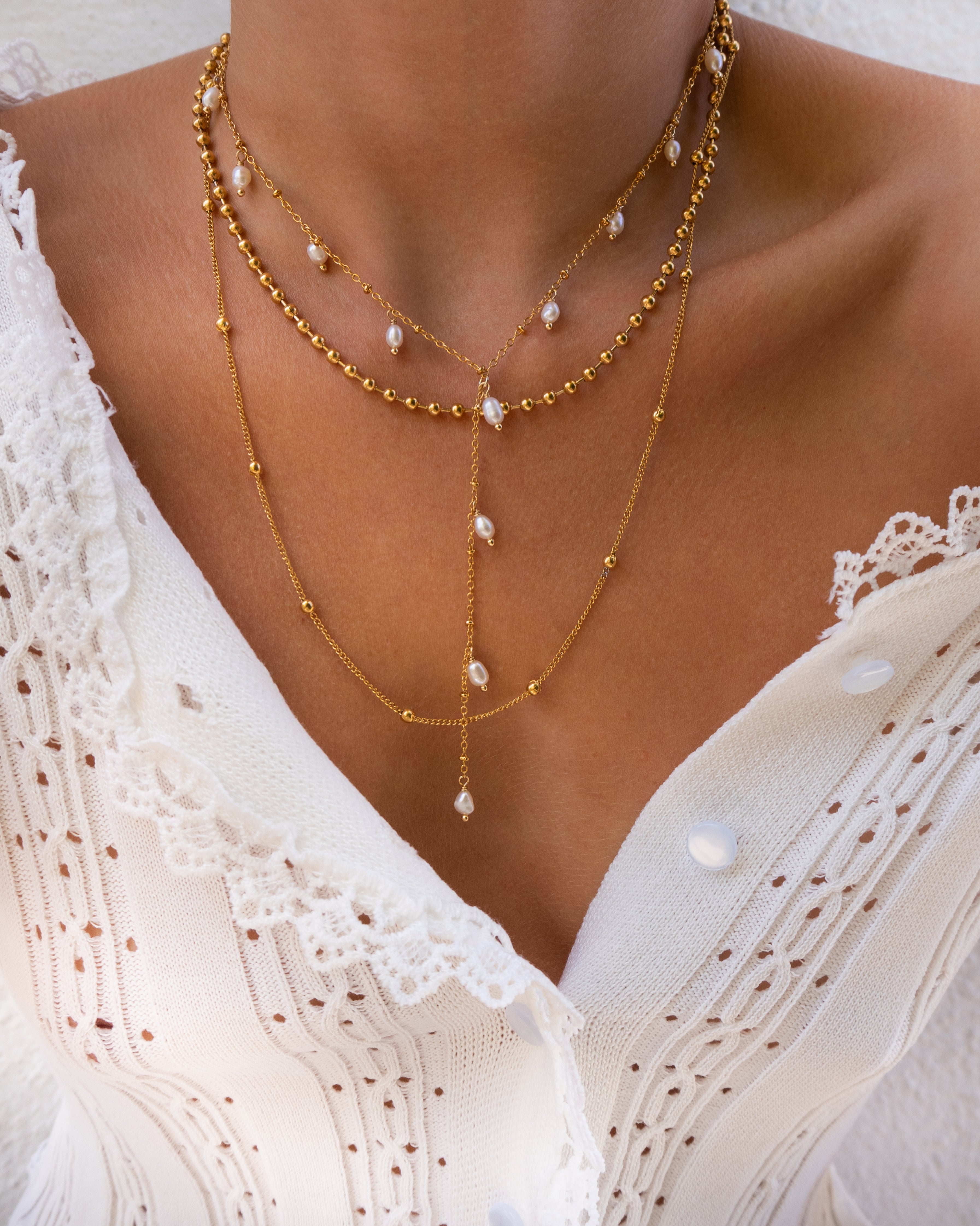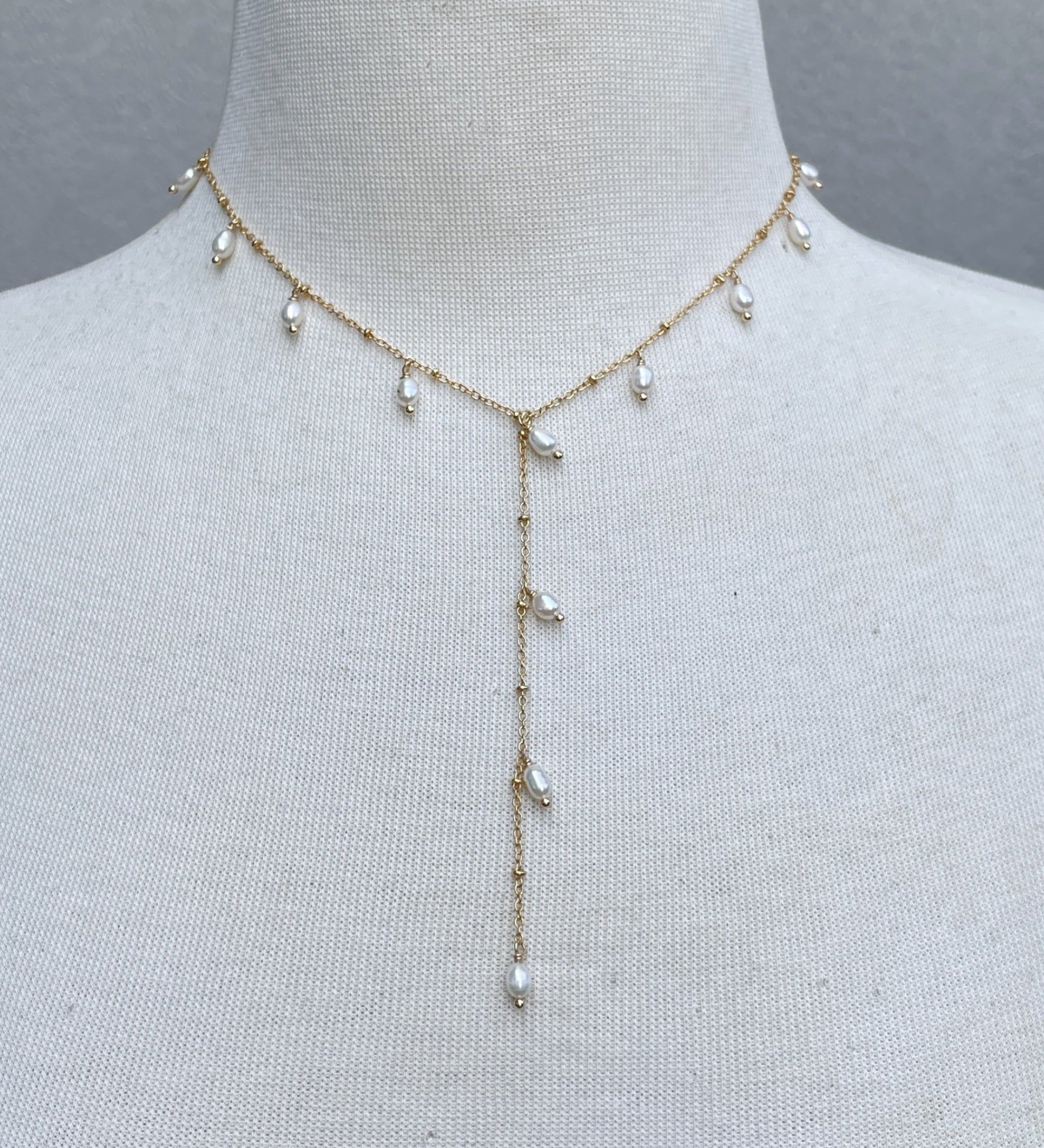 Weiße Süßwasserperlen-Halskette mit baumelnder Goldkette und Y-Lasso