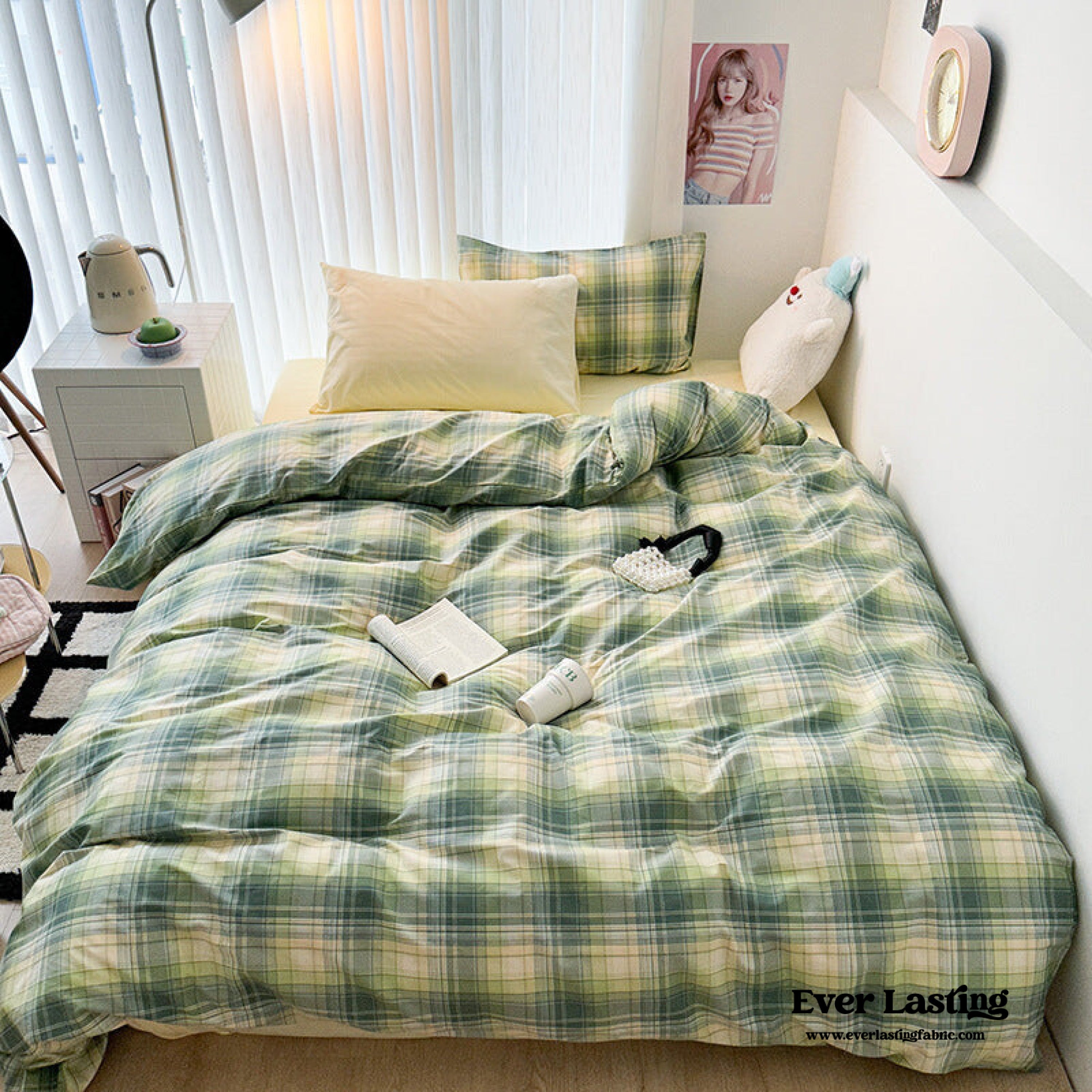 Effortlessly beautiful. Our Soft Plaid Bedding Set is the perfect combination of colors and patterns. This styled set comes with a plaid duvet cover. pillowcases and a solid color bed sheet. Made with 100% cotton material. enjoy the set as it gets softer with every use!
