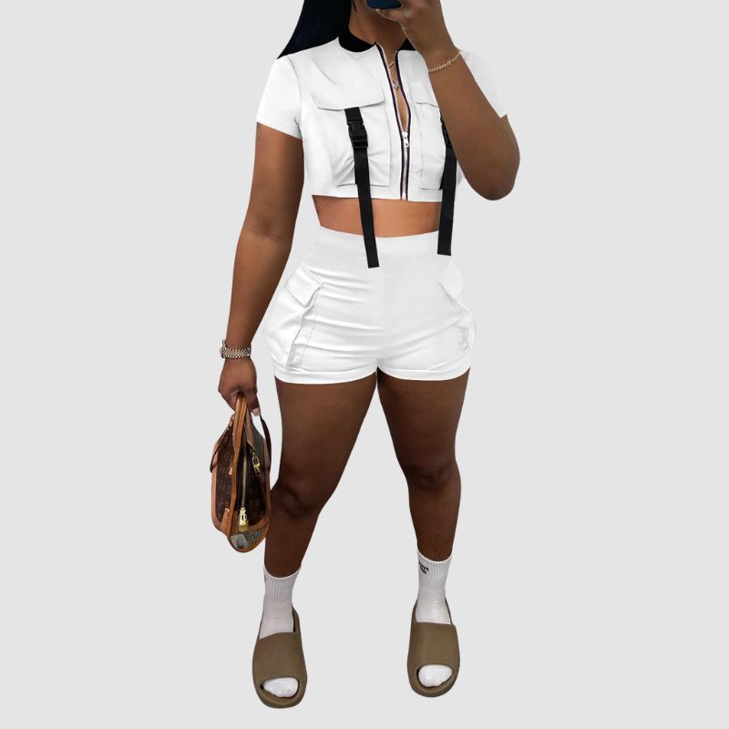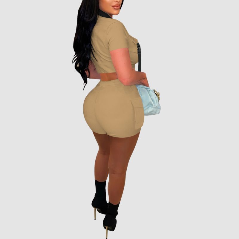 Eigenschaften: Set. Shorts. bauchfreies Top. Cargo. Kurzarm. V-Ausschnitt. Reißverschluss. einfarbig. figurbetont. hohe Taille. Taschenaufnäher.