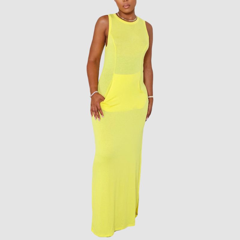 Merkmale: Kleider. Ärmellos. Rundhalsausschnitt. Einfarbig. Aufgesetzte Tasche. Seitenschlitz. Maxikleider.