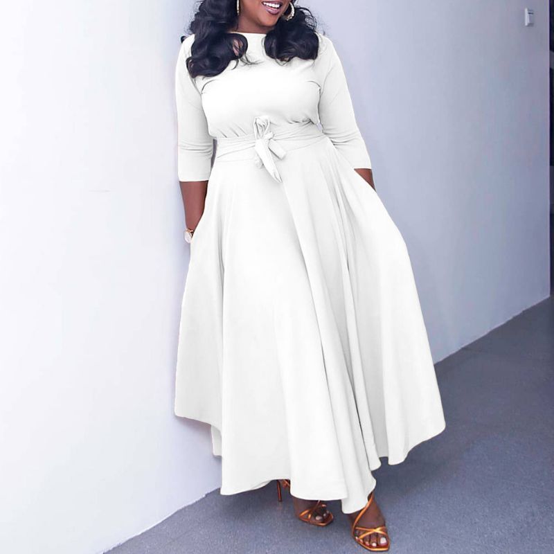 Merkmale: Kleid. Rundhalsausschnitt. Eingefasste Taille. Hohe Taille. Dreiviertelärmel. Seitentasche. Einfarbig. Zum Binden. Locker.