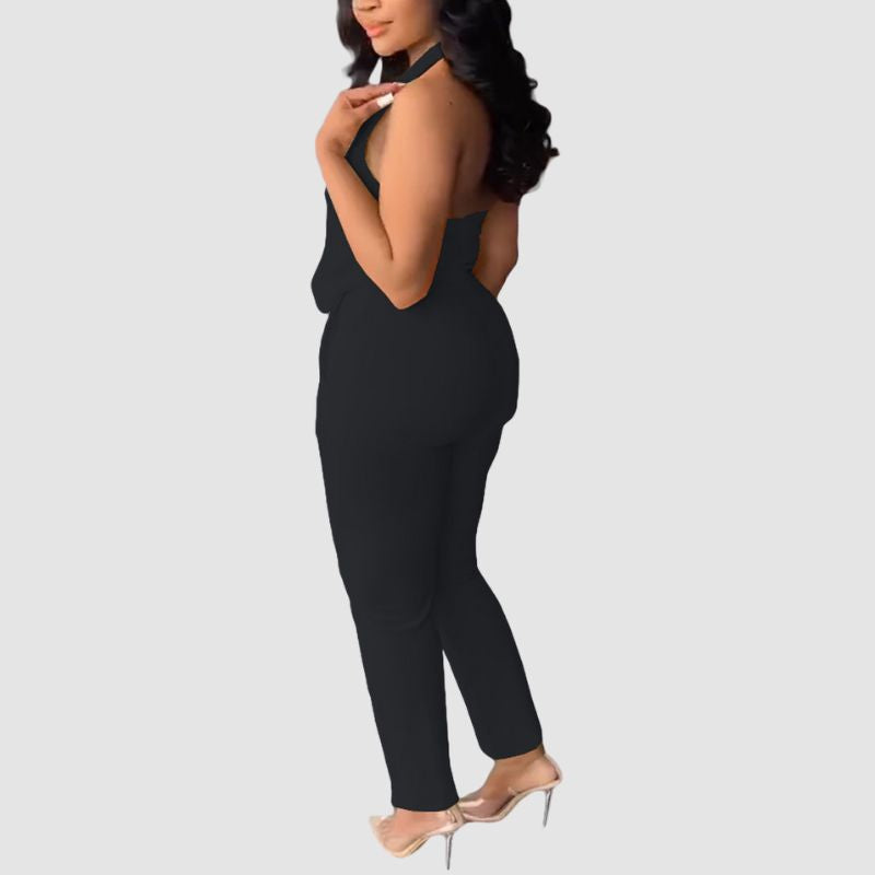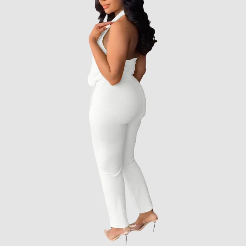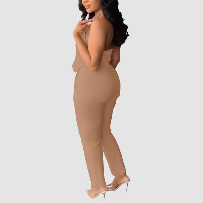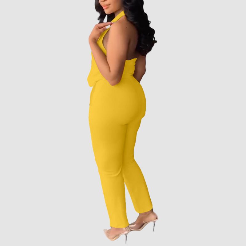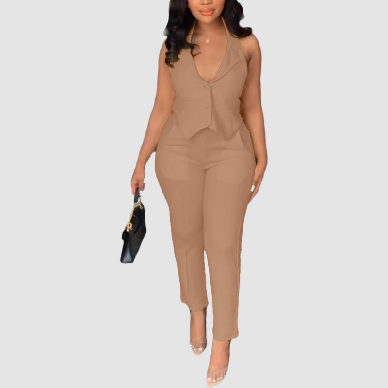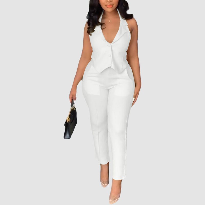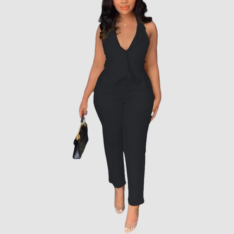 Eigenschaften: Set. Hose. Weste. schulterfrei. hohe Taille. ärmellos. lange Hose. figurbetont. Neckholder. Revers. rückenfrei .