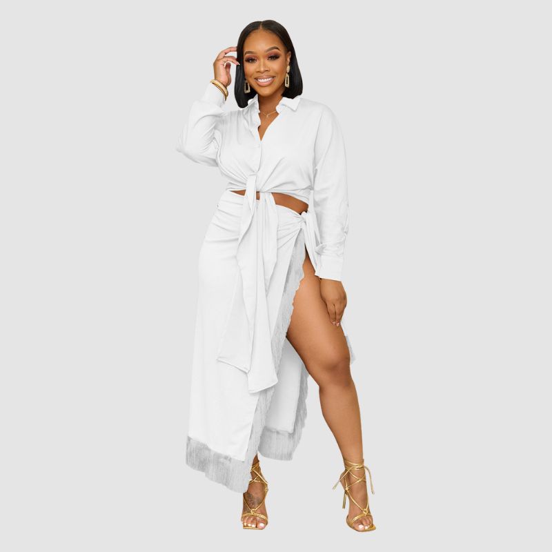 Eigenschaften: Set. Lange Röcke. Revers. Kurzes Top. Langarm. Hemd. Schnürung. Quaste. Schlitz. Hohe Taille. Einfarbig.