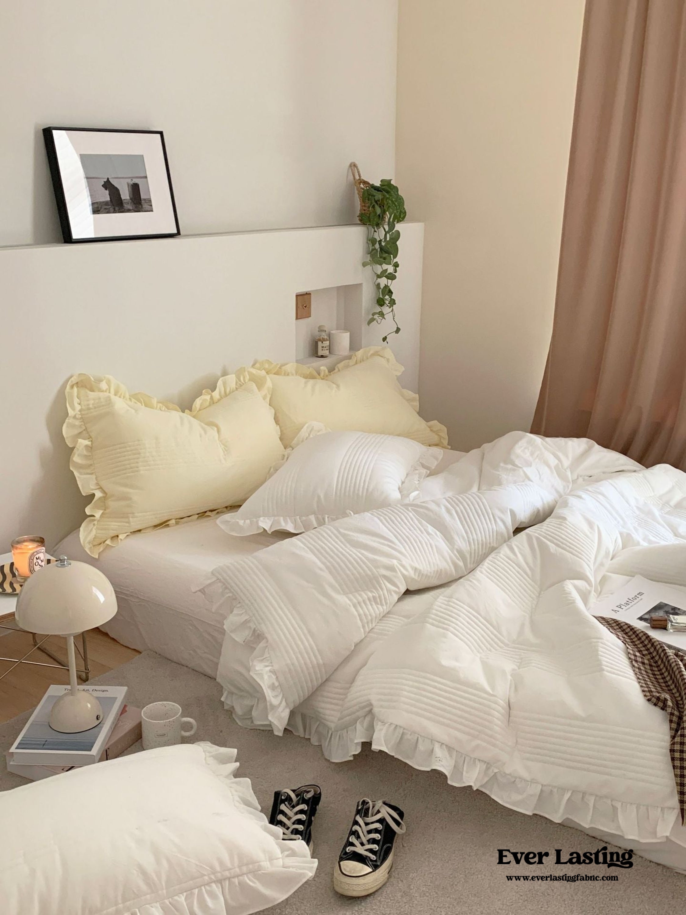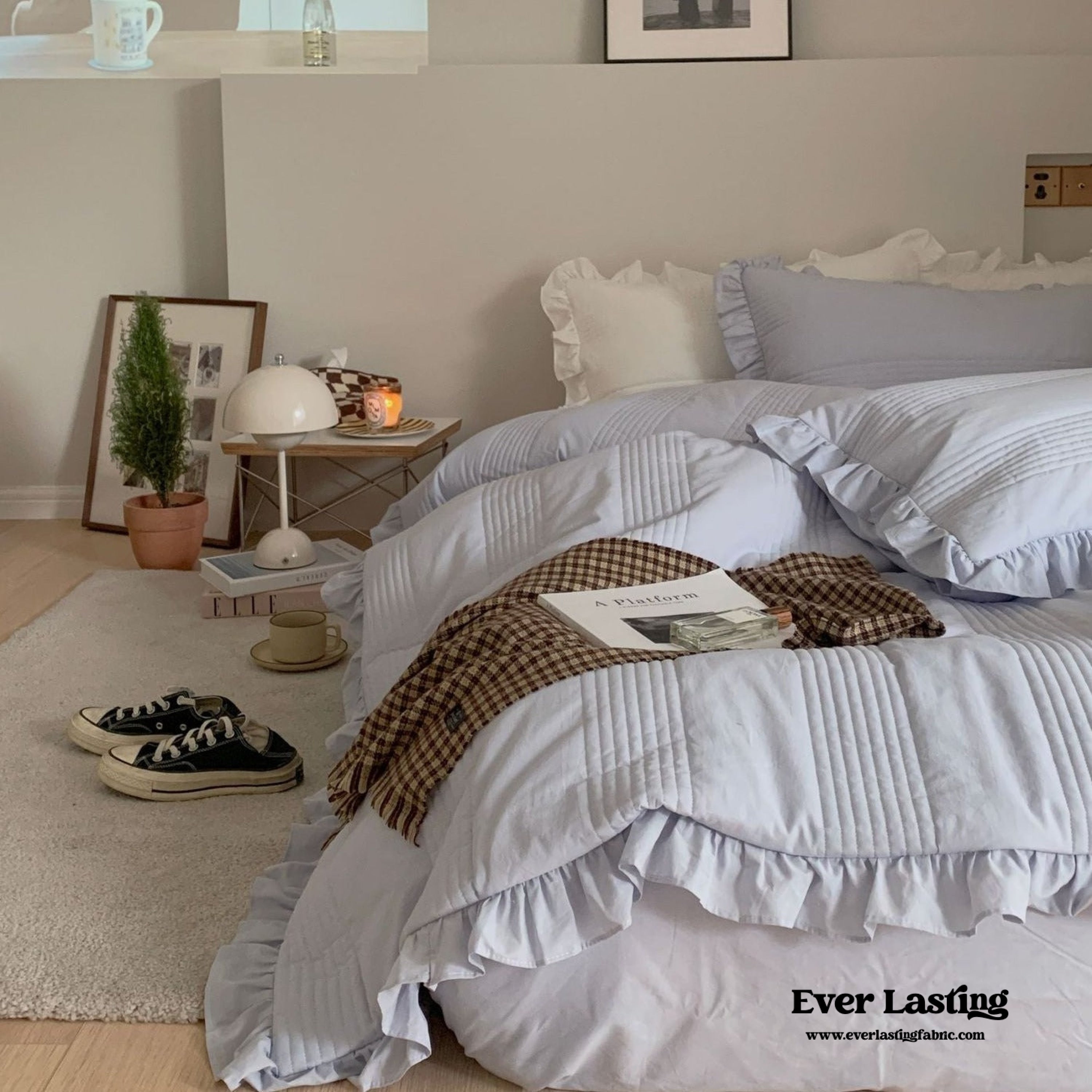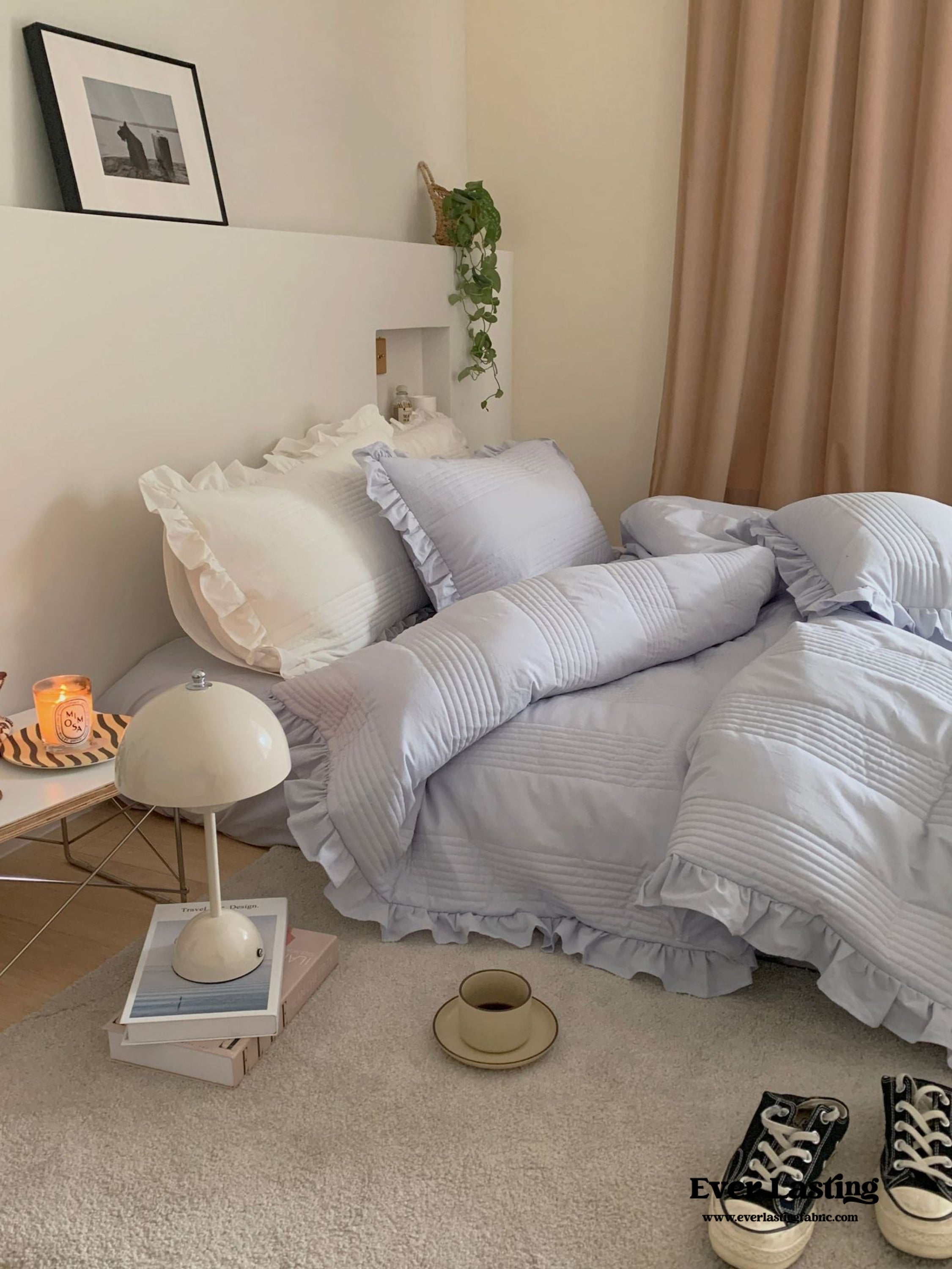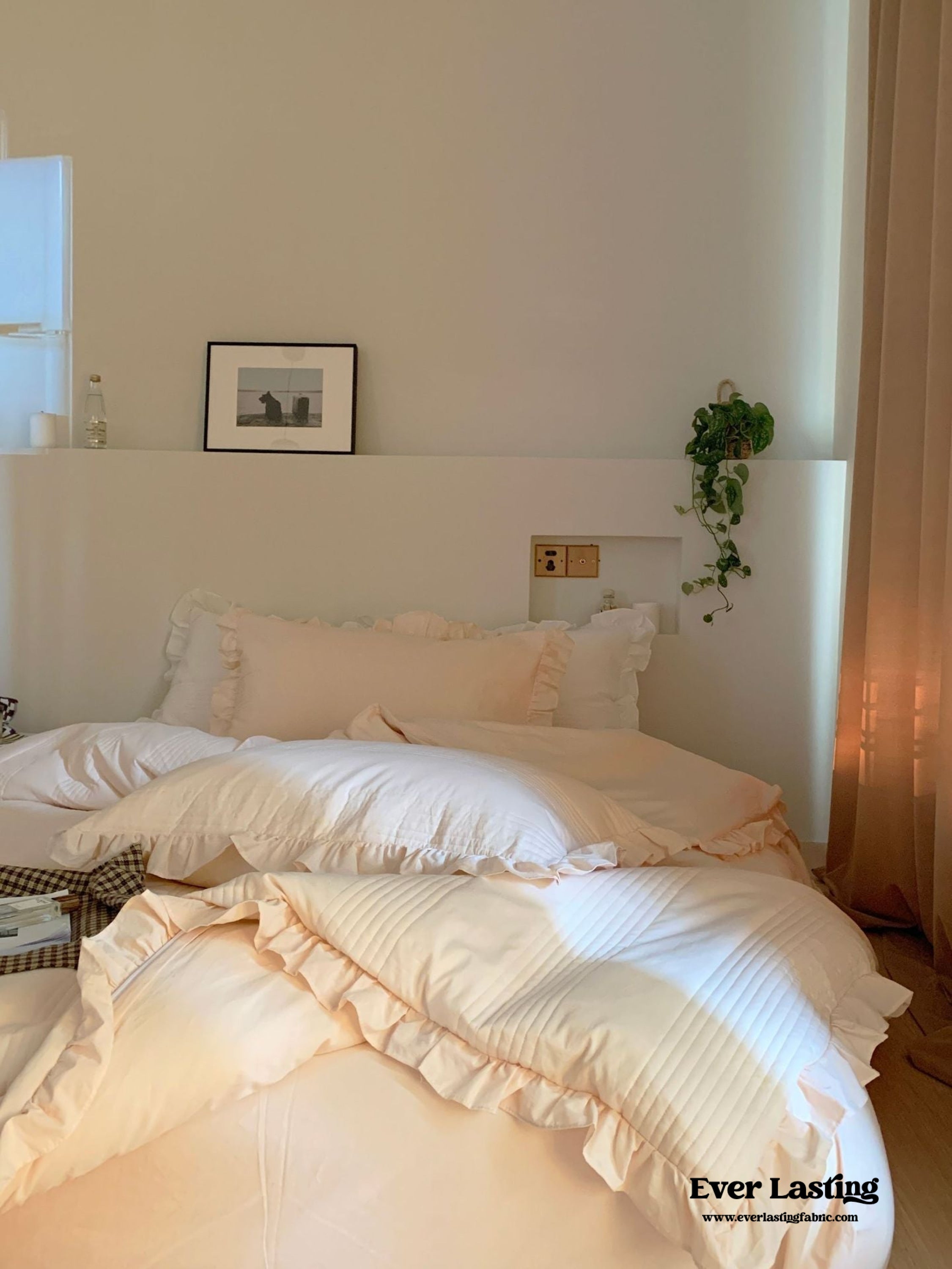 Our Thickened Pastel Textured Ruffle Bedding Set combines charm with comfort in a delightful fusion of style and coziness. Crafted with meticulous attention to detail. this bedding ensemble boasts a thickened texture that adds a touch of luxury to your sleep space. Each duvet cover is thoughtfully equipped with four corner ties and a hidden zipper. ensuring your duvet insert stays securely in place throughout the night. Experience the epitome of comfort and style with our Thickened Pastel Textured Ruffle Bedding Set. and transform your bedroom into a sanctuary of beauty and coziness.