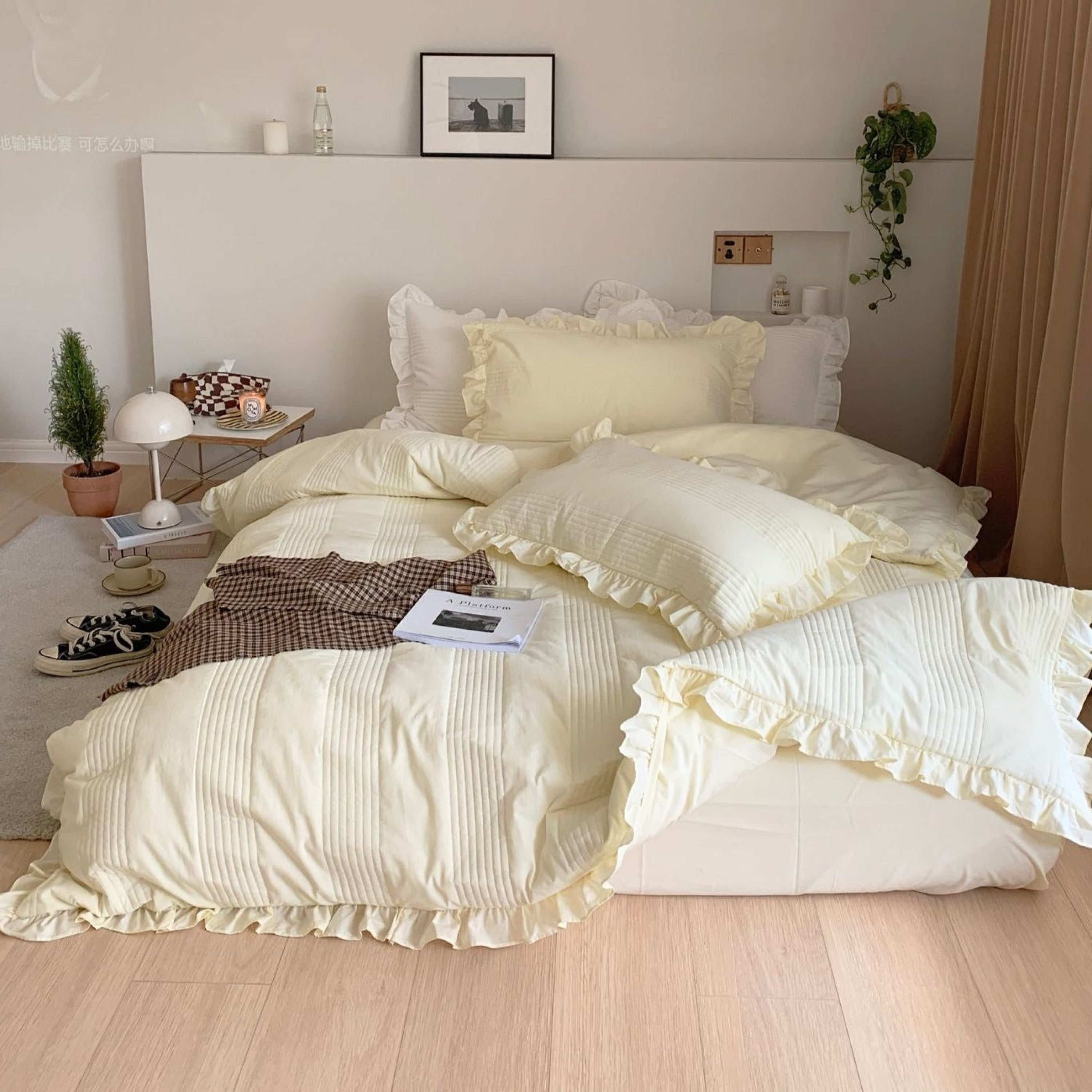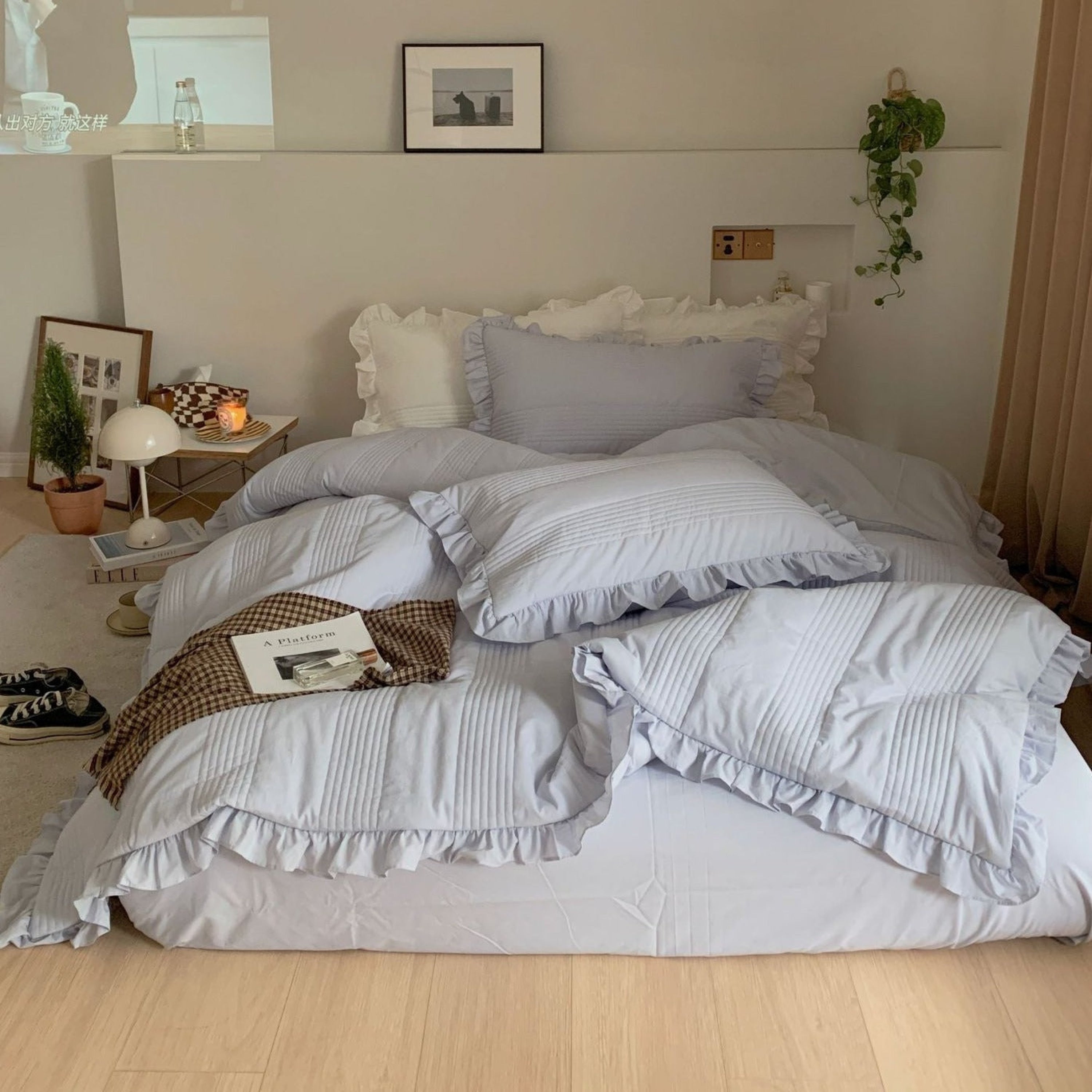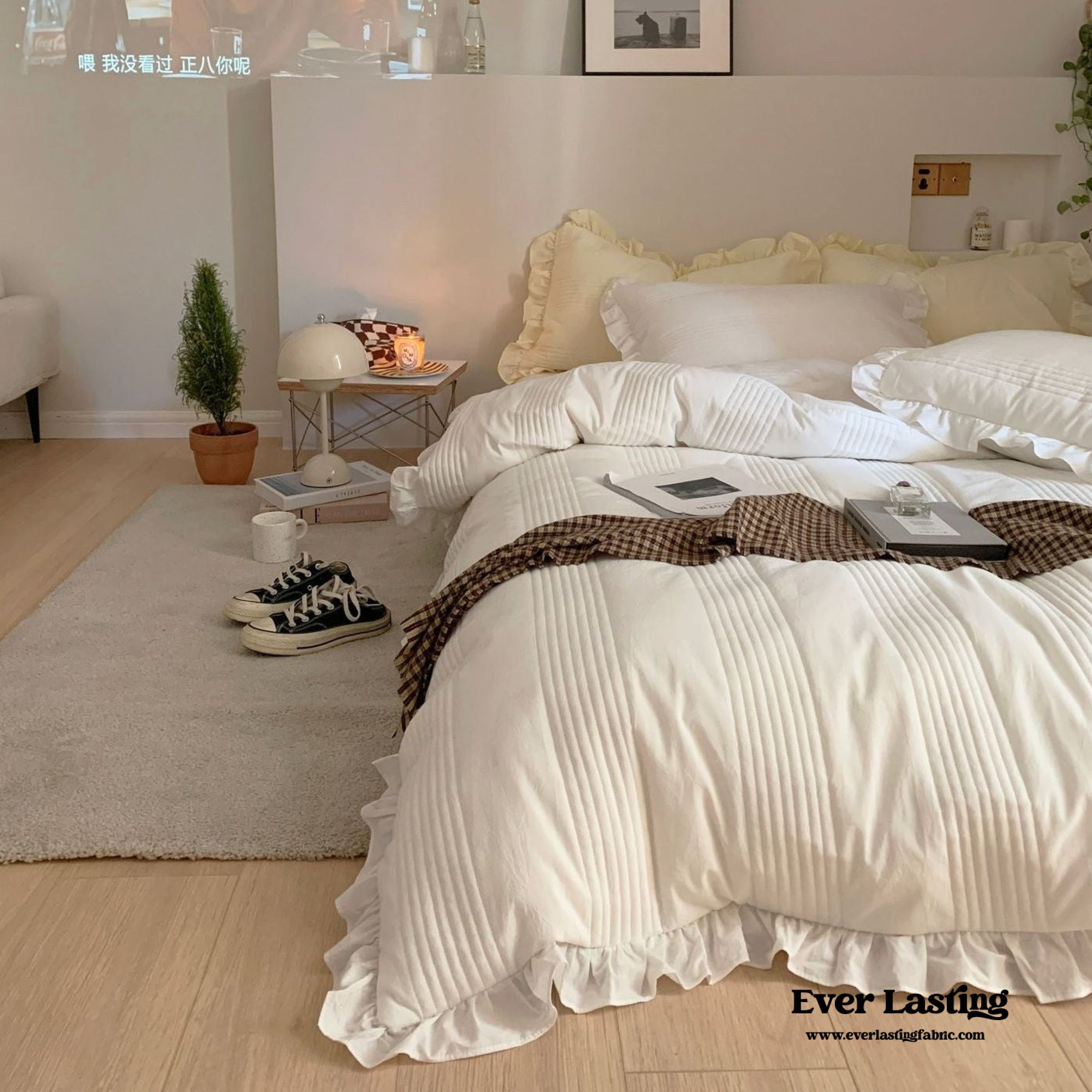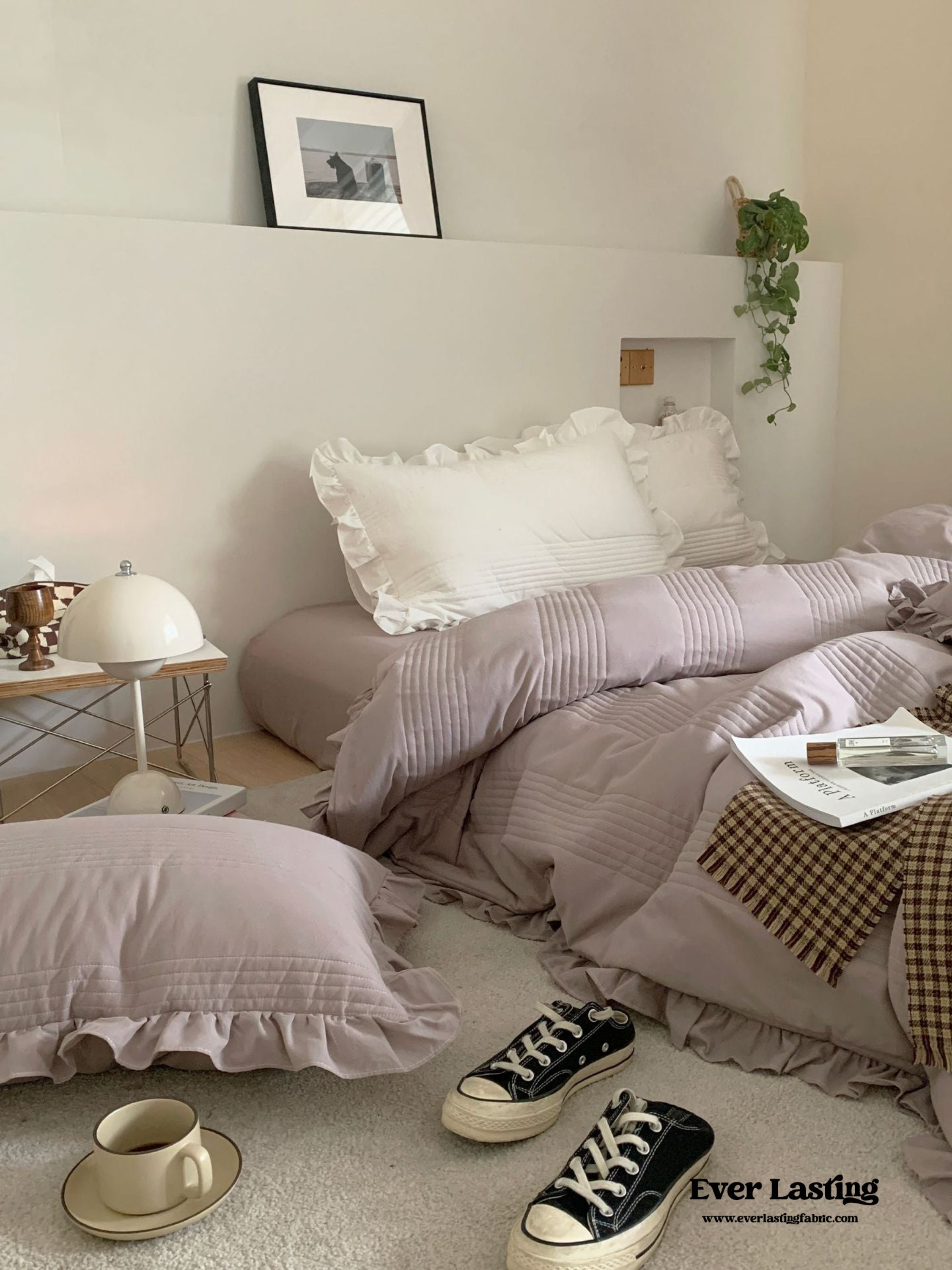 Our Thickened Pastel Textured Ruffle Bedding Set combines charm with comfort in a delightful fusion of style and coziness. Crafted with meticulous attention to detail. this bedding ensemble boasts a thickened texture that adds a touch of luxury to your sleep space. Each duvet cover is thoughtfully equipped with four corner ties and a hidden zipper. ensuring your duvet insert stays securely in place throughout the night. Experience the epitome of comfort and style with our Thickened Pastel Textured Ruffle Bedding Set. and transform your bedroom into a sanctuary of beauty and coziness.
