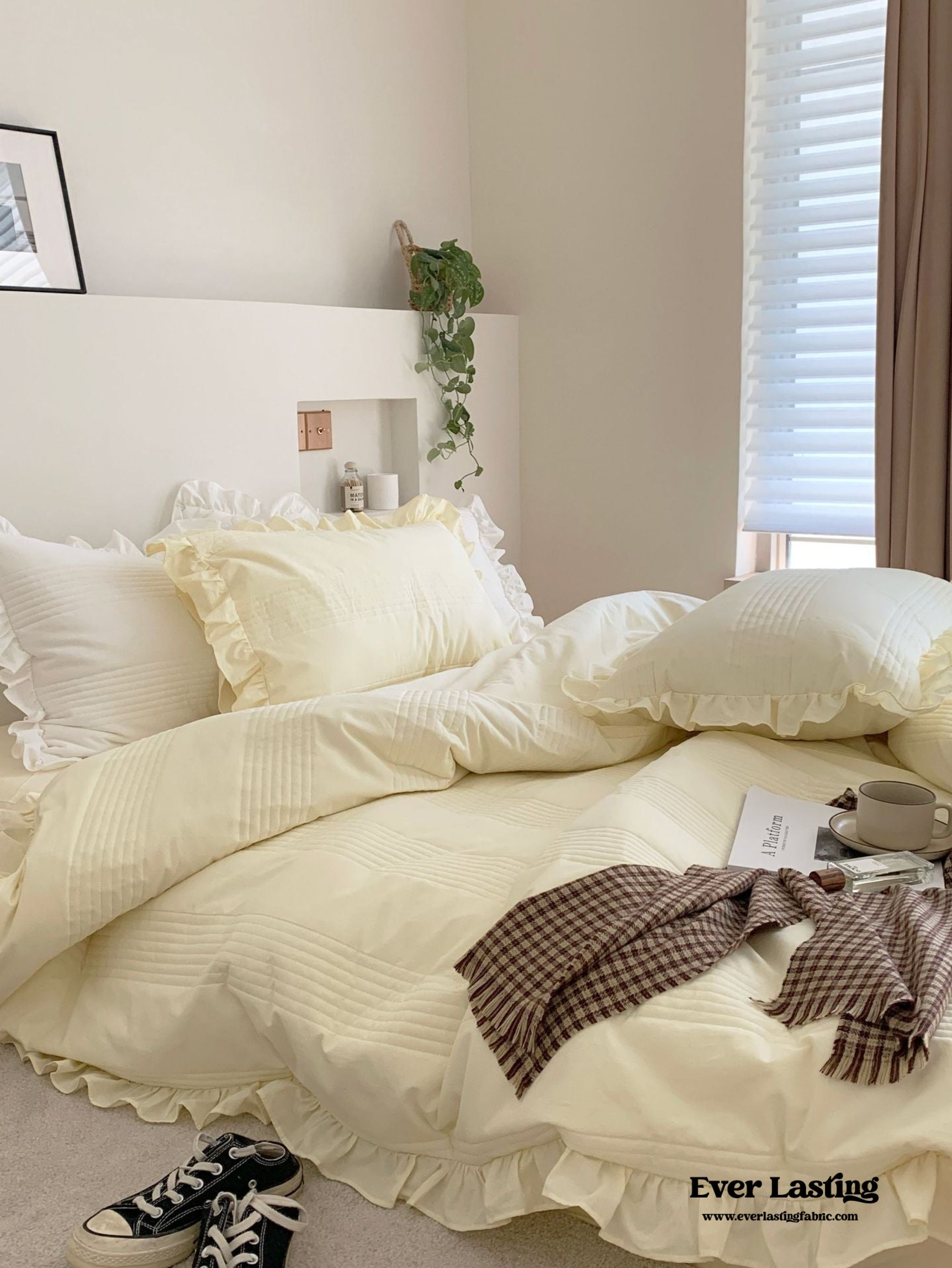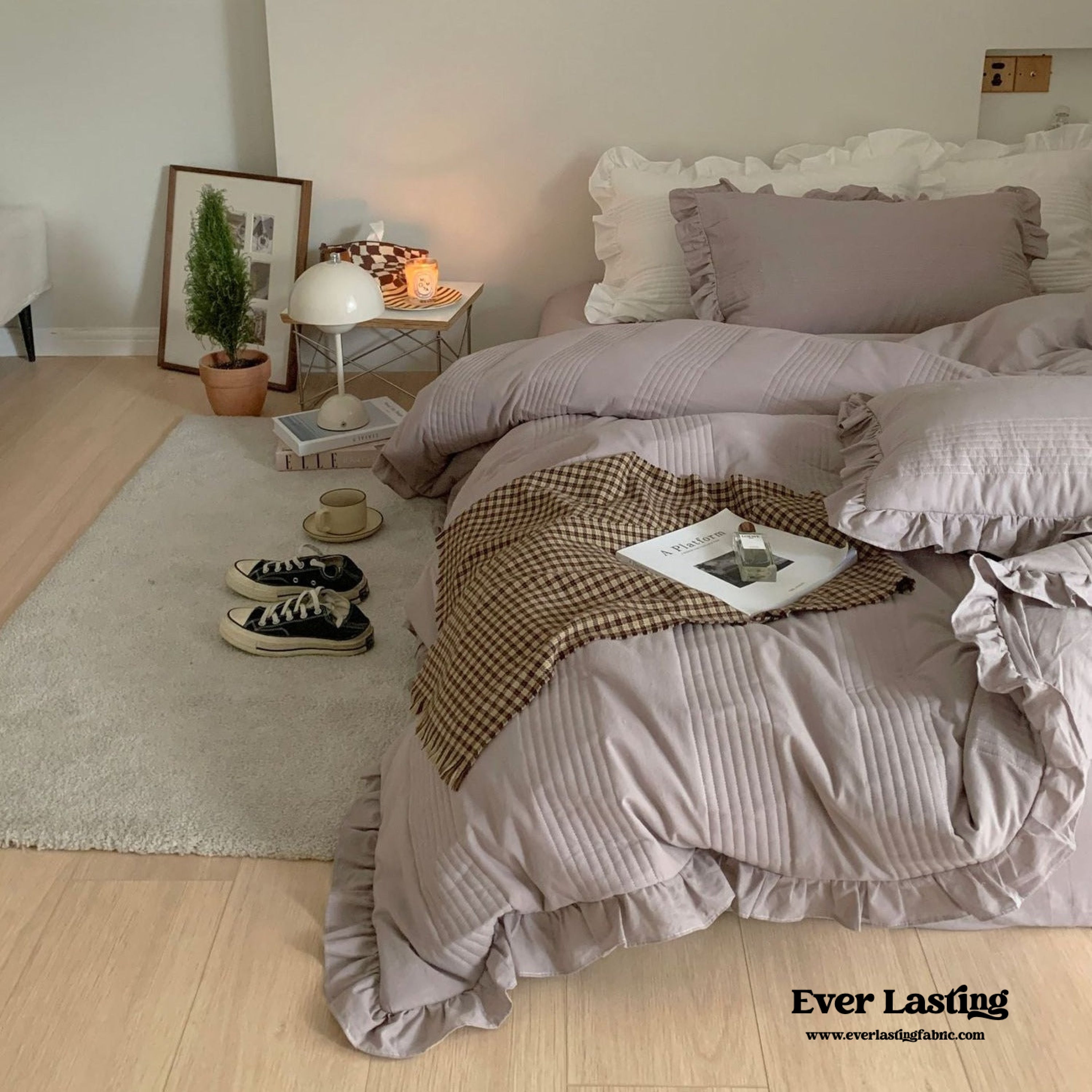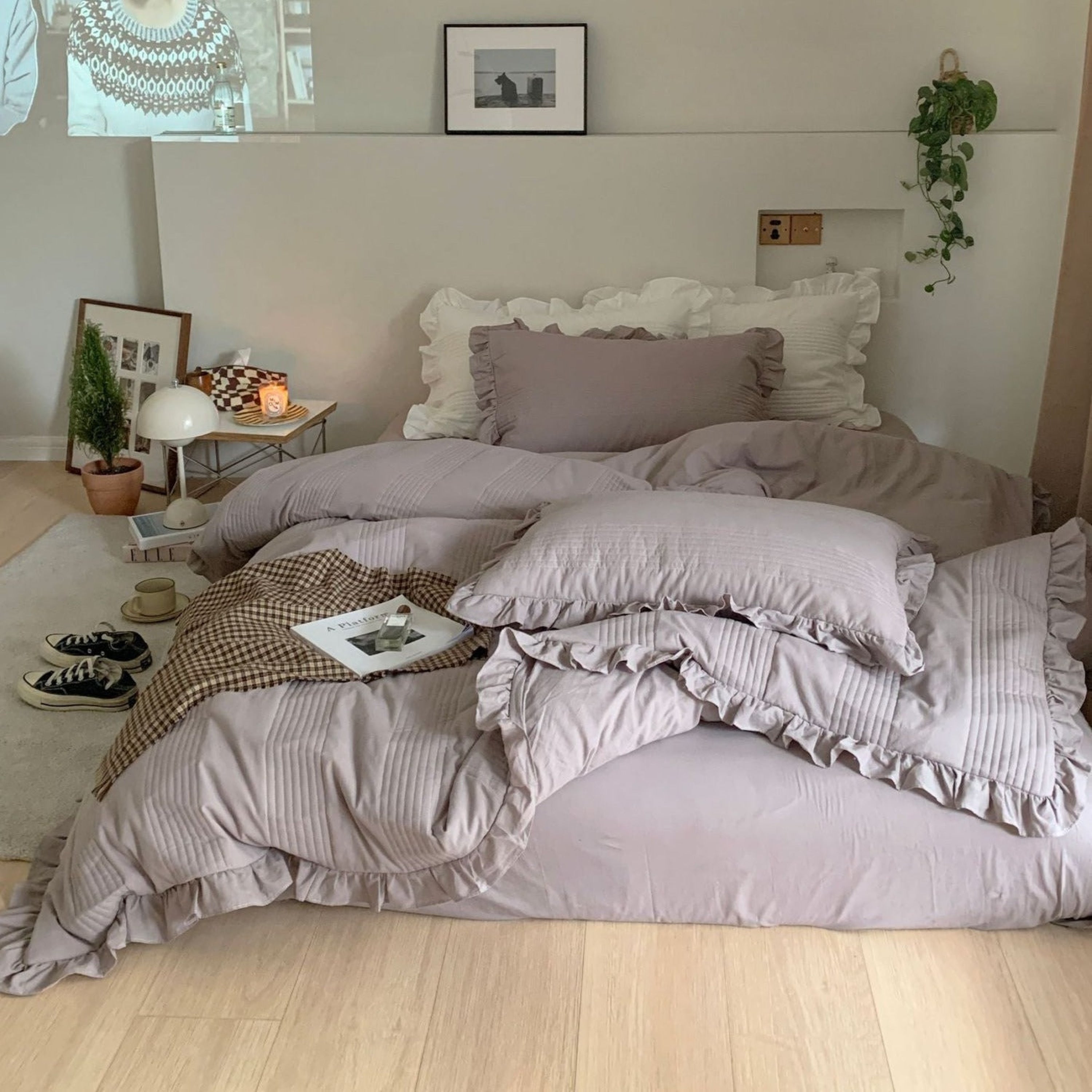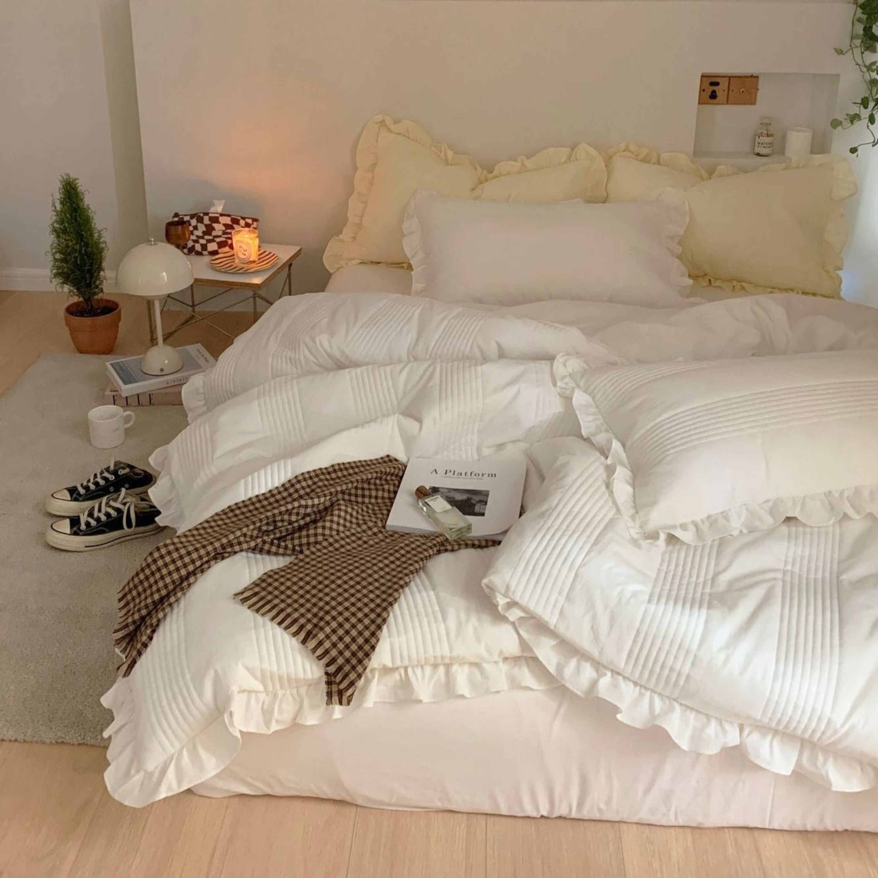 Our Thickened Pastel Textured Ruffle Bedding Set combines charm with comfort in a delightful fusion of style and coziness. Crafted with meticulous attention to detail. this bedding ensemble boasts a thickened texture that adds a touch of luxury to your sleep space. Each duvet cover is thoughtfully equipped with four corner ties and a hidden zipper. ensuring your duvet insert stays securely in place throughout the night. Experience the epitome of comfort and style with our Thickened Pastel Textured Ruffle Bedding Set. and transform your bedroom into a sanctuary of beauty and coziness.