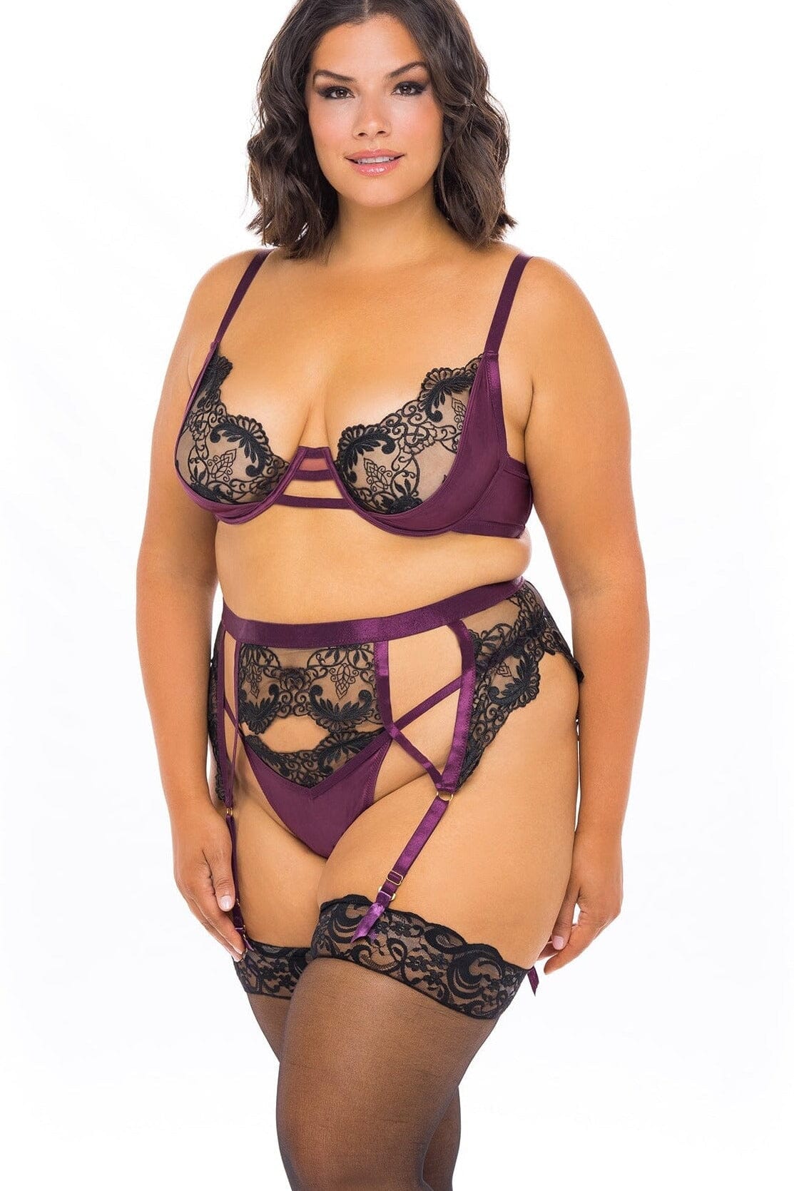 Sujetador con aros y bordado, con liguero y tanga a juego