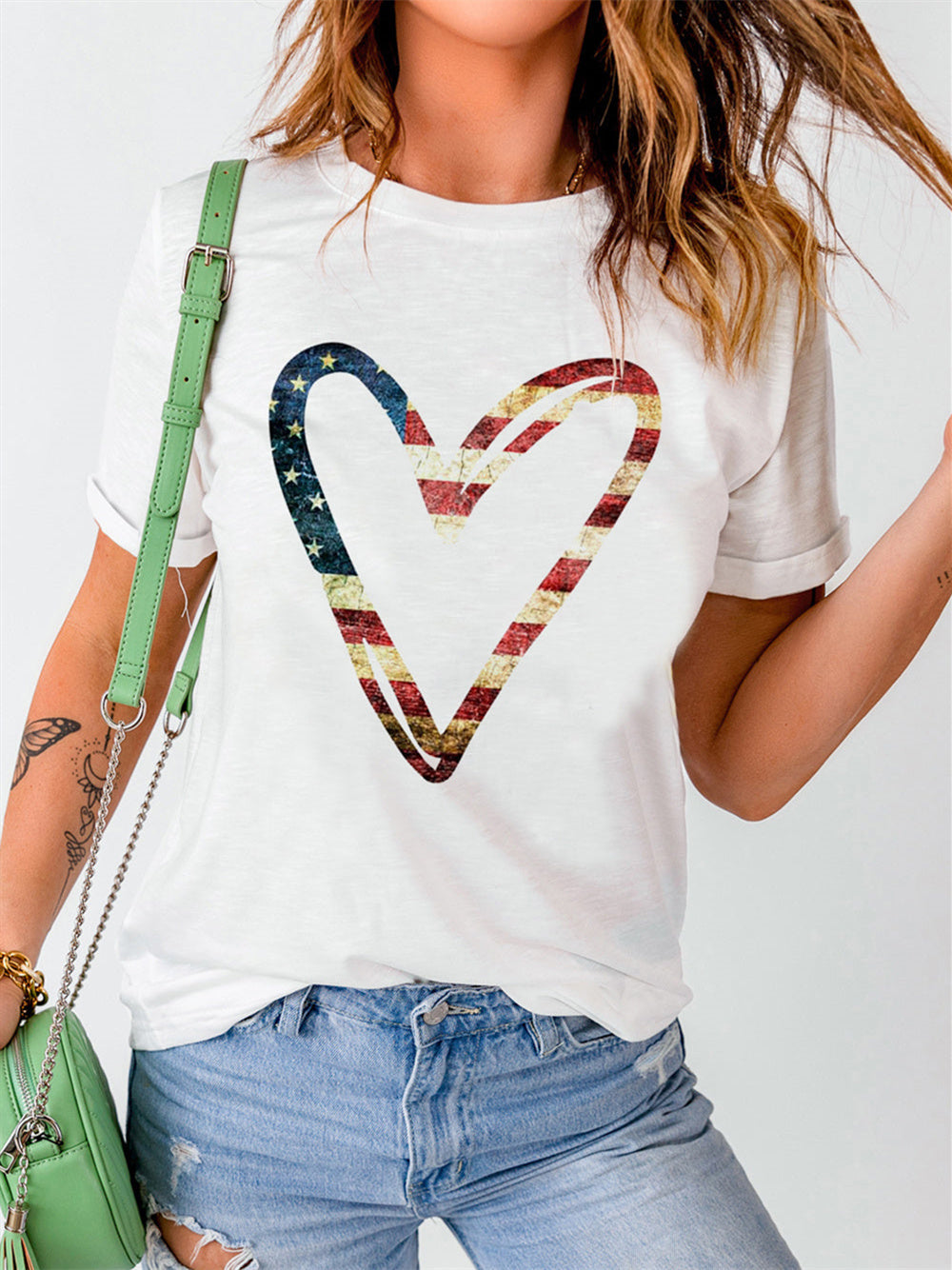 Camiseta de manga corta con estampado de silueta de corazón y bandera estadounidense