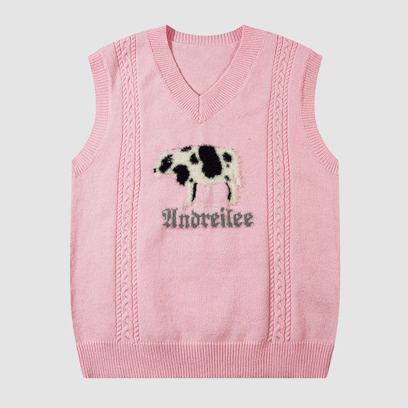 Características: Chaleco. Cuello en V. Sin mangas. Jersey. Diseño con una linda vaca de dibujos animados y letras bordadas. Corte holgado. Tejido jacquard. Conjuntos para parejas.