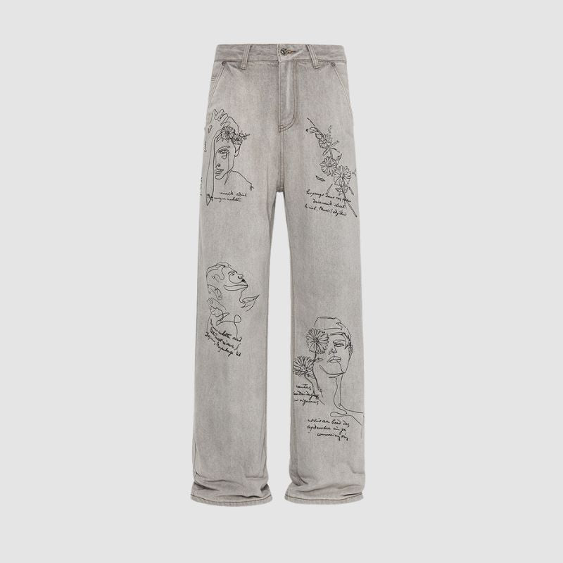 Características: Pantalones. jeans. vintage. estampado de pintura abstracta. sentido artístico. color sólido. tela de mezclilla . diseño lavado. ligeramente elástico . cremallera frontal.