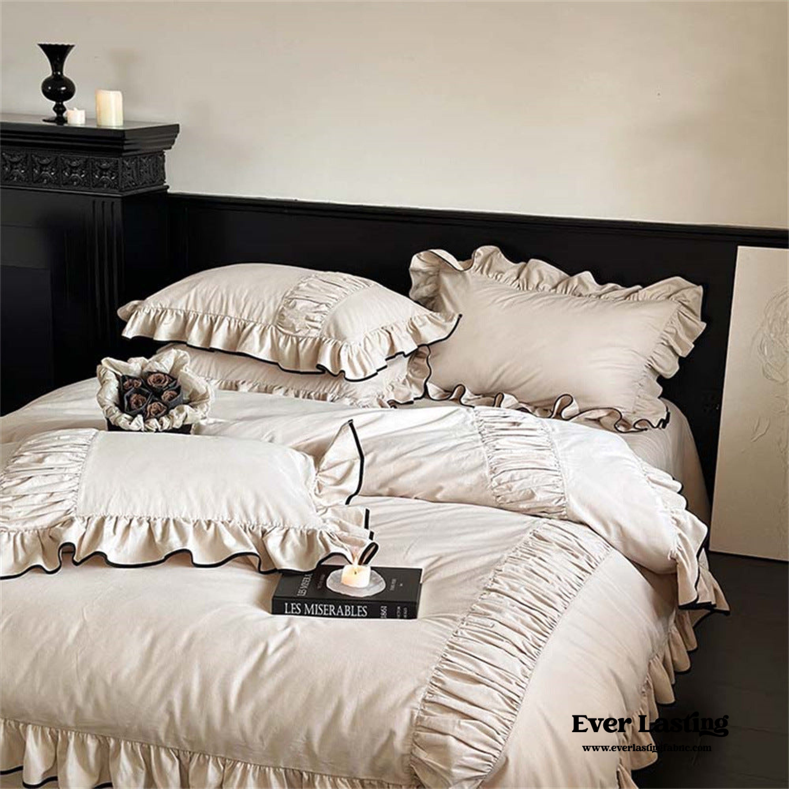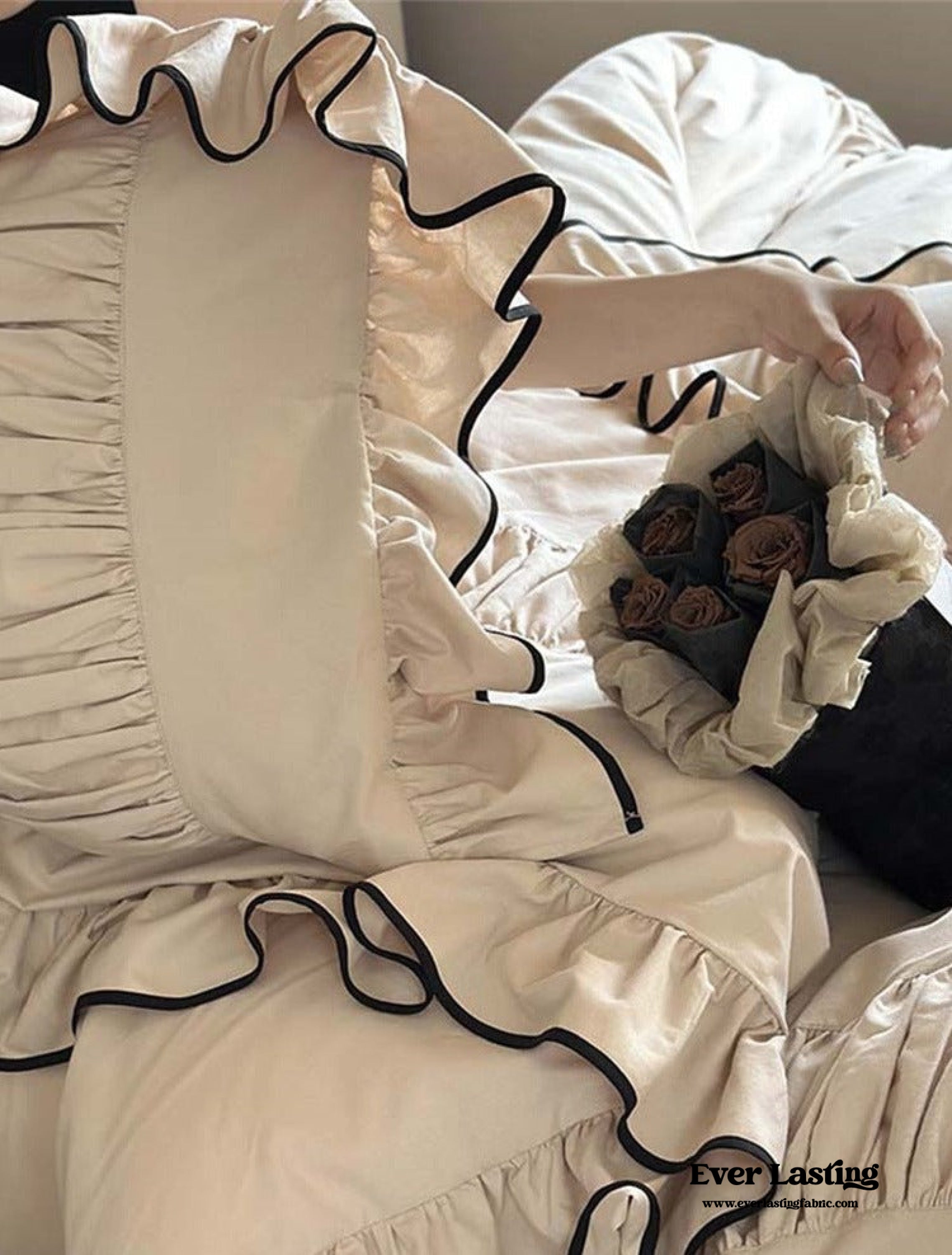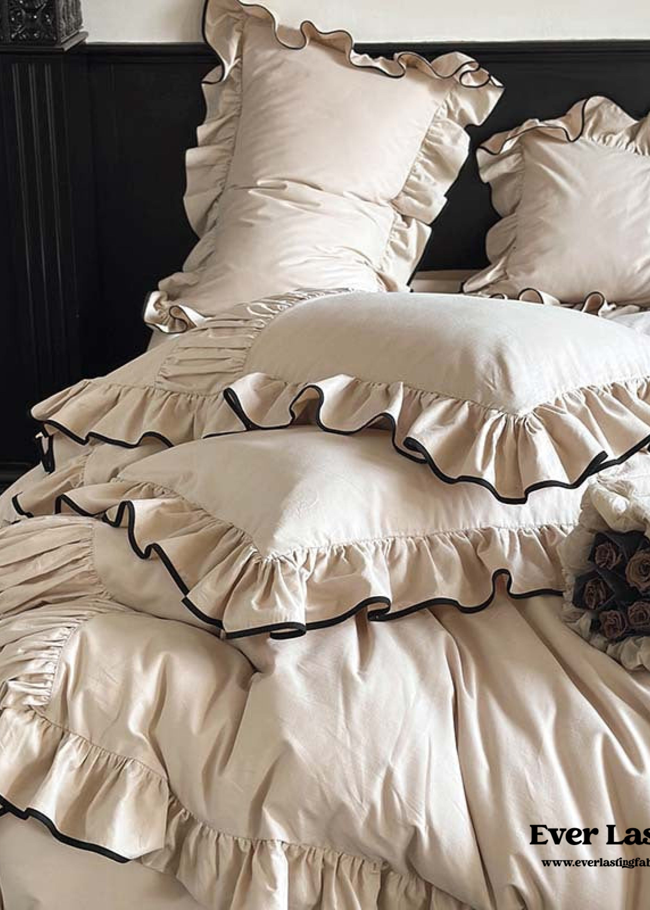 Infuse your bedroom with the timeless charm of our Beige Black Trim Ruffle Bedding Bundle. This bundle is a testament to classic beauty. featuring a soft beige backdrop adorned with a striking black trim that exudes sophistication. Crafted for both aesthetics and comfort. it transforms your space into a haven of elegant simplicity and relaxation.Each duvet cover features four corner ties and a hidden zipper. ensuring your duvet insert stays securely in place all night. Elevate your sleep experience with this exquisite and stylish bedding bundle. where the allure of classic colors meets the promise of serene sophistication in every ruffle and trim.
