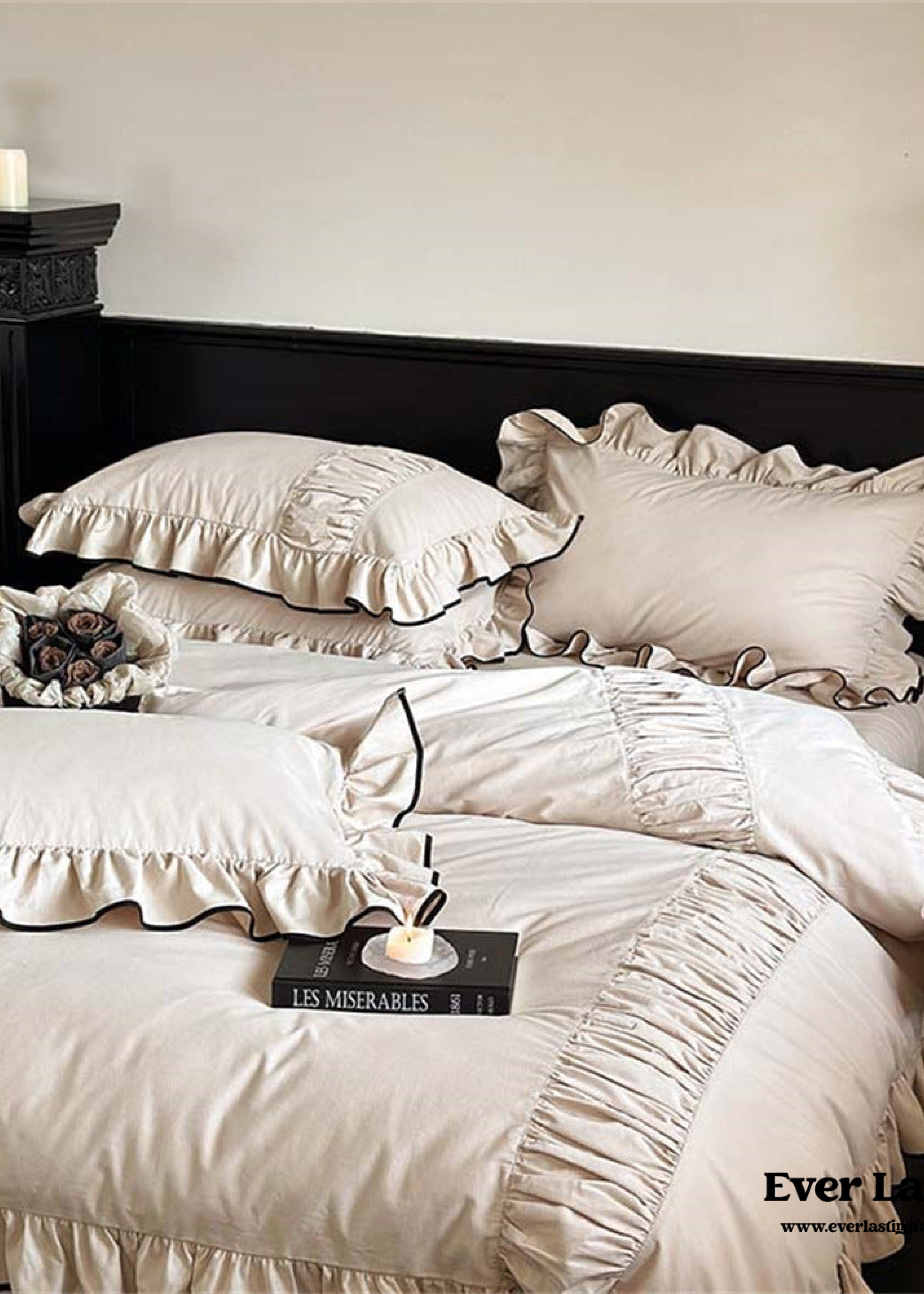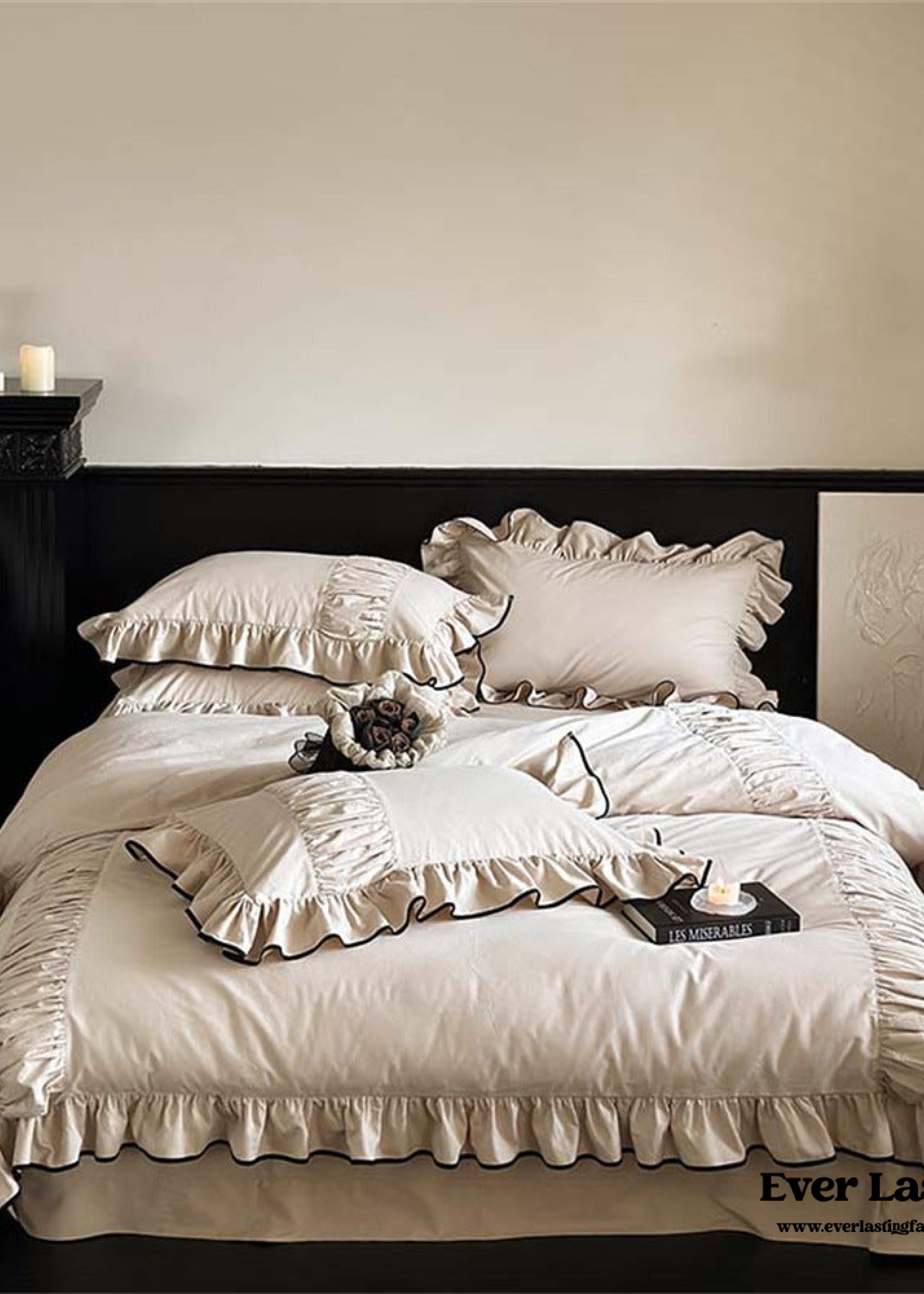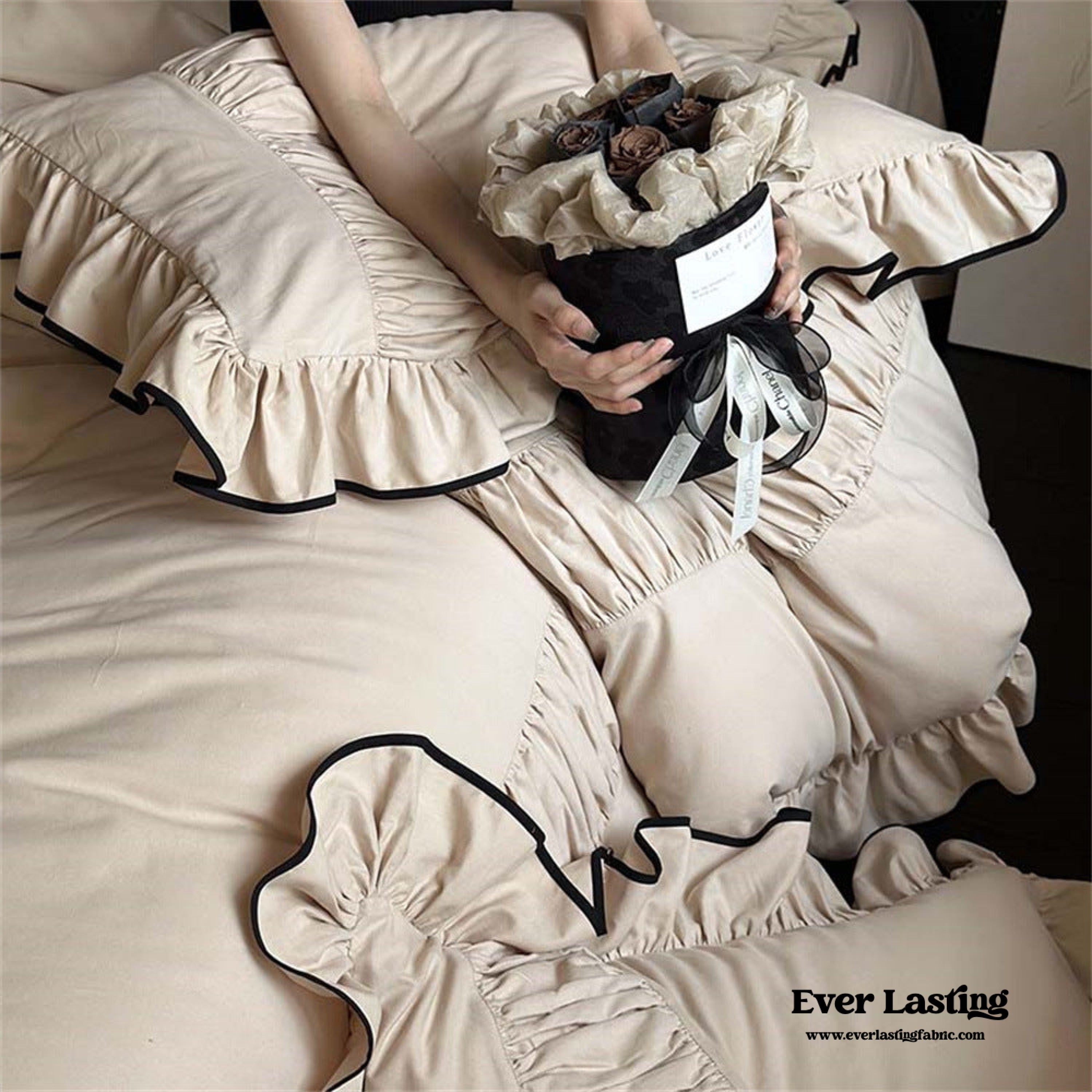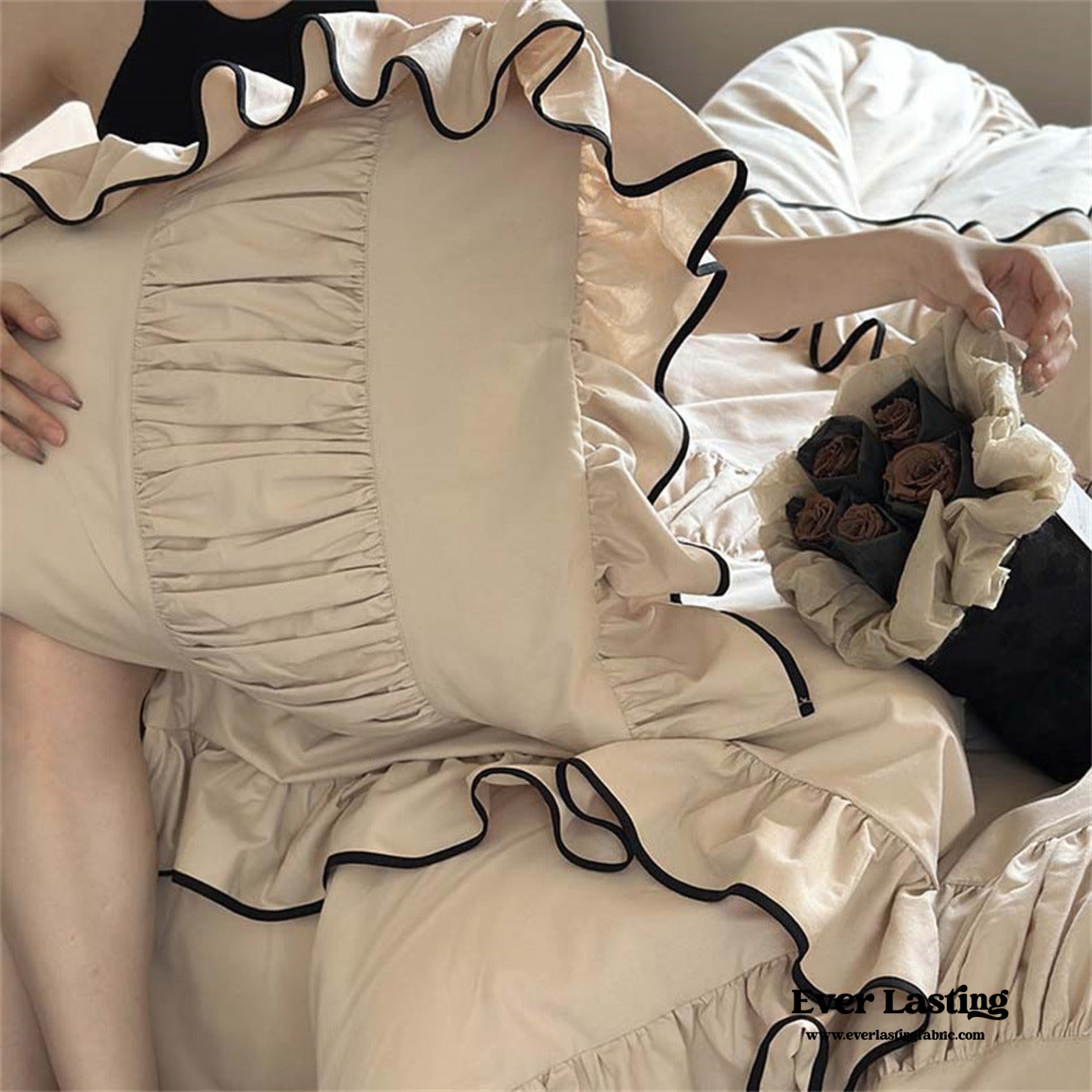 Infuse your bedroom with the timeless charm of our Beige Black Trim Ruffle Bedding Set. This set is a testament to classic beauty. featuring a soft beige backdrop adorned with a striking black trim that exudes sophistication. Crafted for both aesthetics and comfort. it transforms your space into a haven of elegant simplicity and relaxation.Each duvet cover features four corner ties and a hidden zipper. ensuring your duvet insert stays securely in place all night. Elevate your sleep experience with this exquisite and stylish bedding set. where the allure of classic colors meets the promise of serene sophistication in every ruffle and trim.