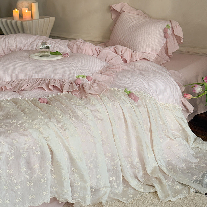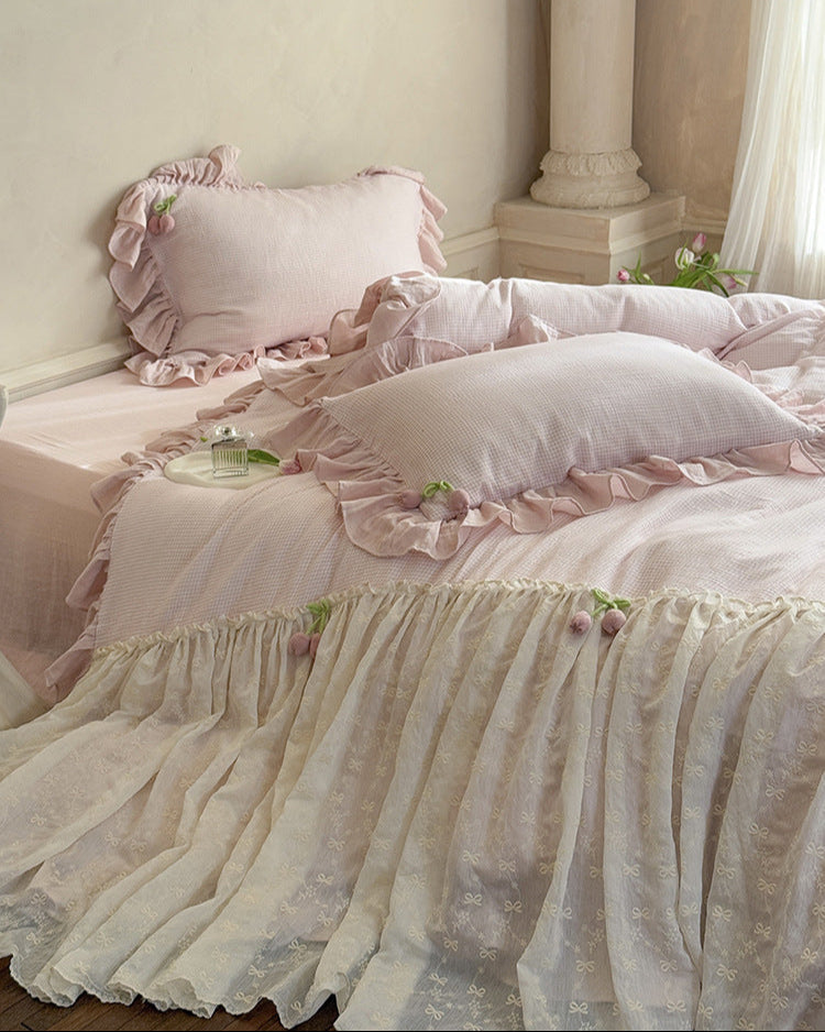 Transform your bedroom with Magchic's Bella Floral Lace Ruffled Princess Bedding Set. infused with coquette-inspired allure. Crafted from soft. breathable 100% cotton. it ensures a cozy and restful sleep. The floral lace and ruffled accents bring timeless sophistication. while soft pastel hues create a peaceful ambiance. Corner ties and zippers on the duvet cover ensure a secure fit and enduring quality. Perfect for vintage. cottagecore. or shabby chic decor. this bedding set elevates your room with elegance and comfort.