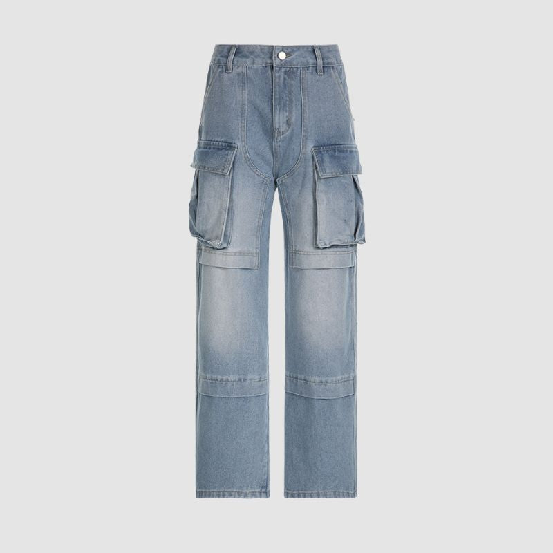 Características: Pantalones. jeans. hip-hop. vintage. diseño de parche de bolsillo grande. bolsillo lateral. tela de mezclilla . pierna recta . cintura alta. ajuste relajado . color sólido. cremallera frontal.