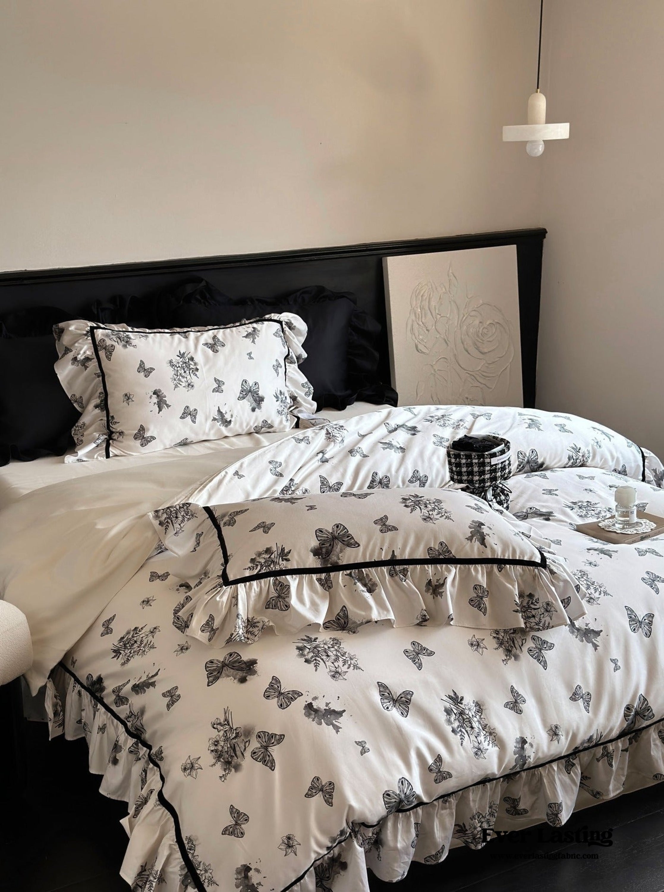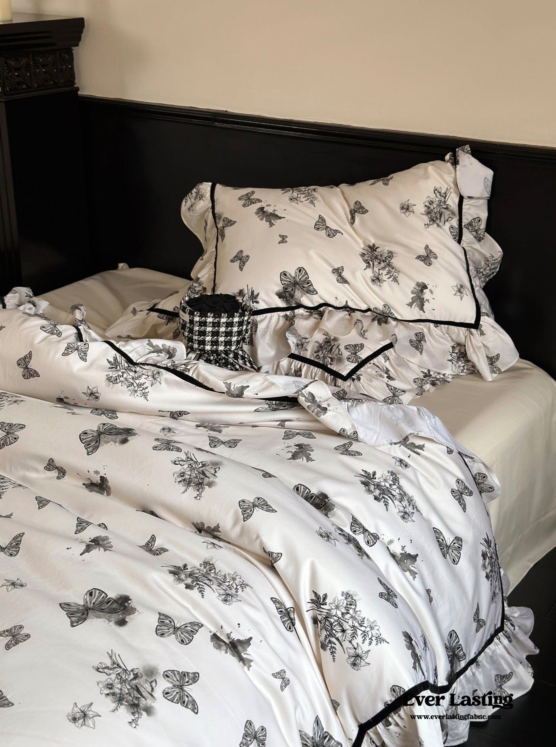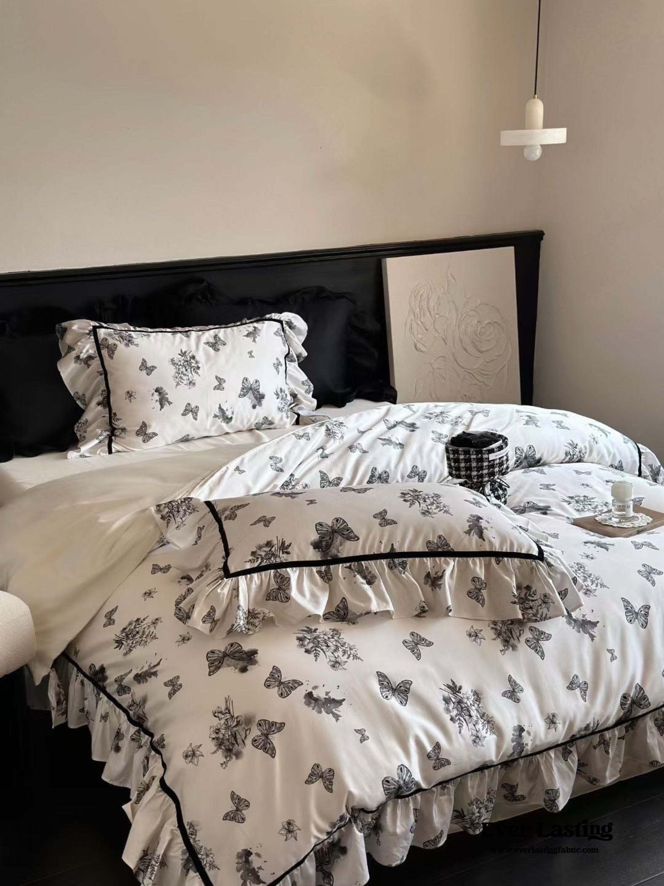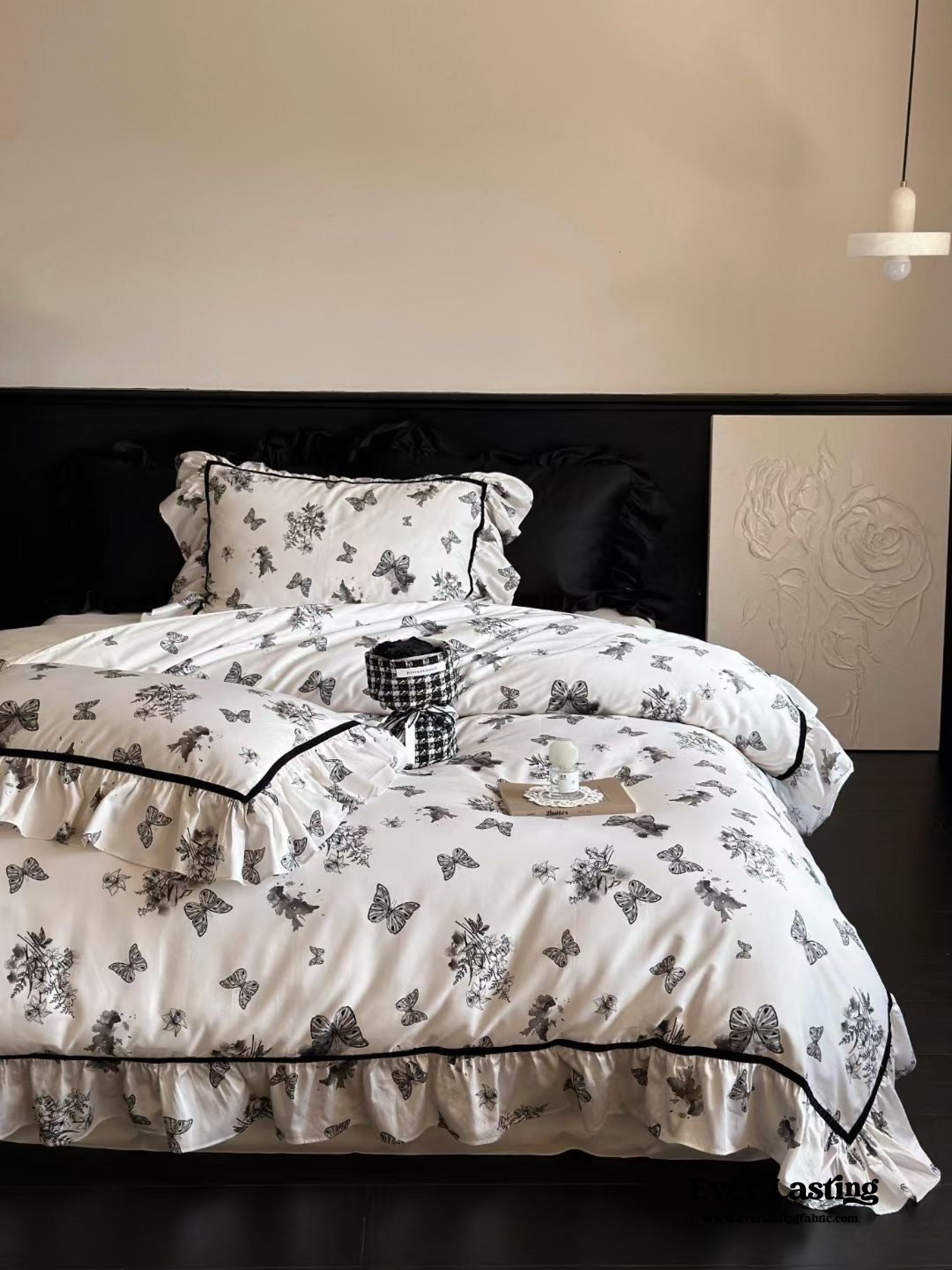 Black & White Butterfly French Bedding now comes in a bundle. Enjoy and save a full set of bedding with duvet insert and pillows along with our classic duvet cover. bed sheet and pillowcase.