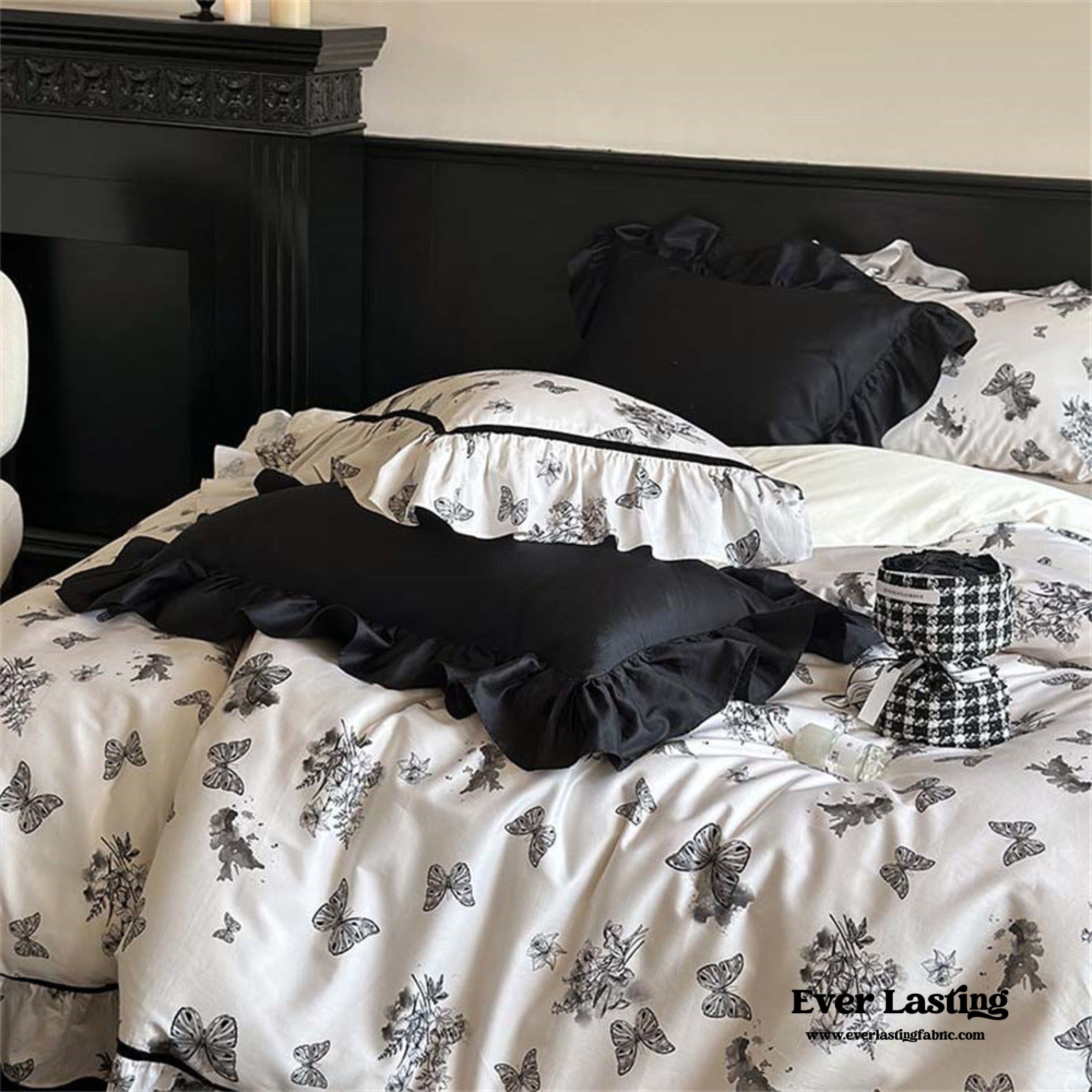 Transform your bedroom into an enchanting haven with our Black & White Butterfly French Bedding Bundle. Graceful black butterflies on pristine white evoke elegance and whimsical beauty. This bundle combines style and comfort for a modern sophistication and relaxation.