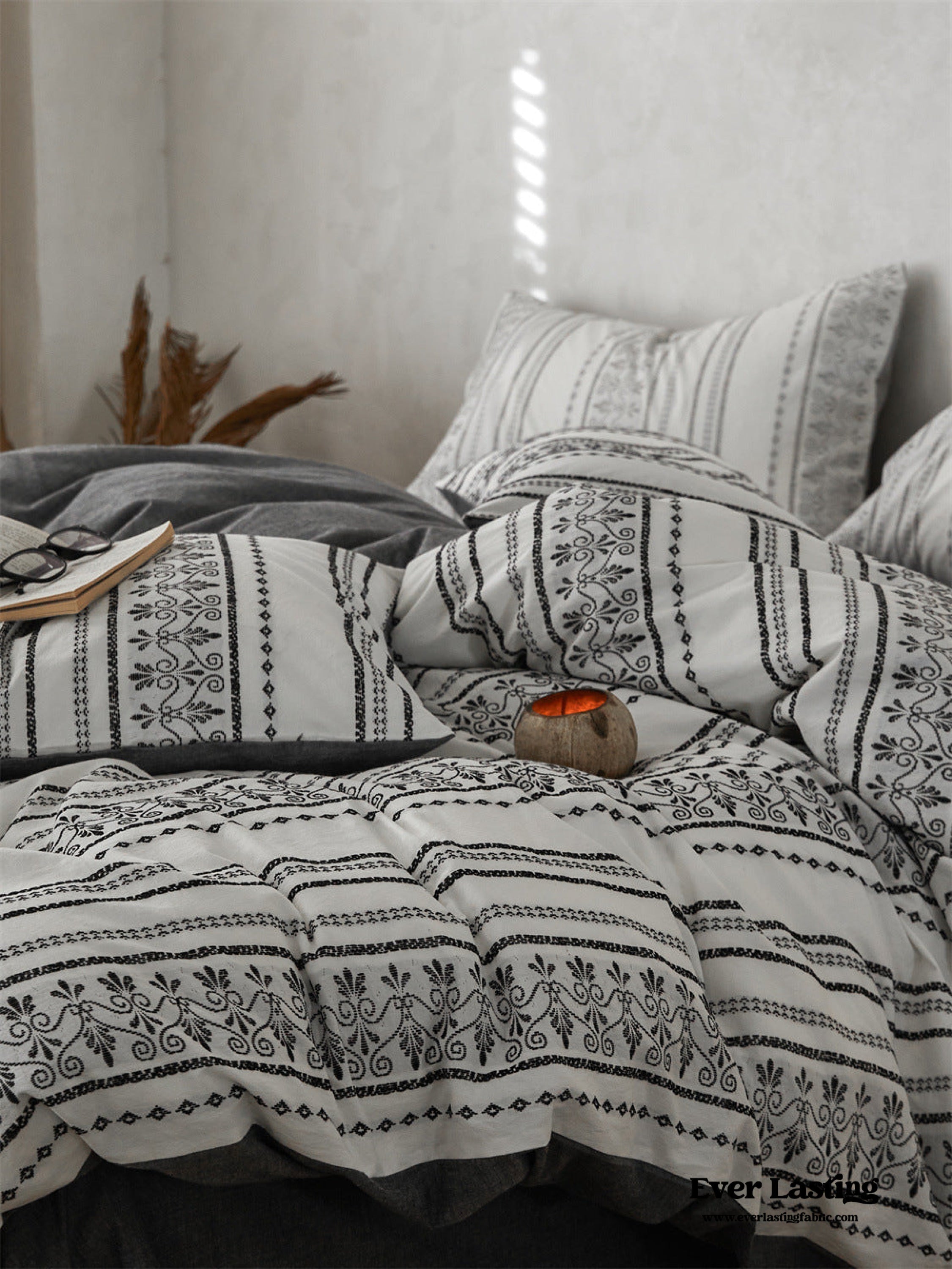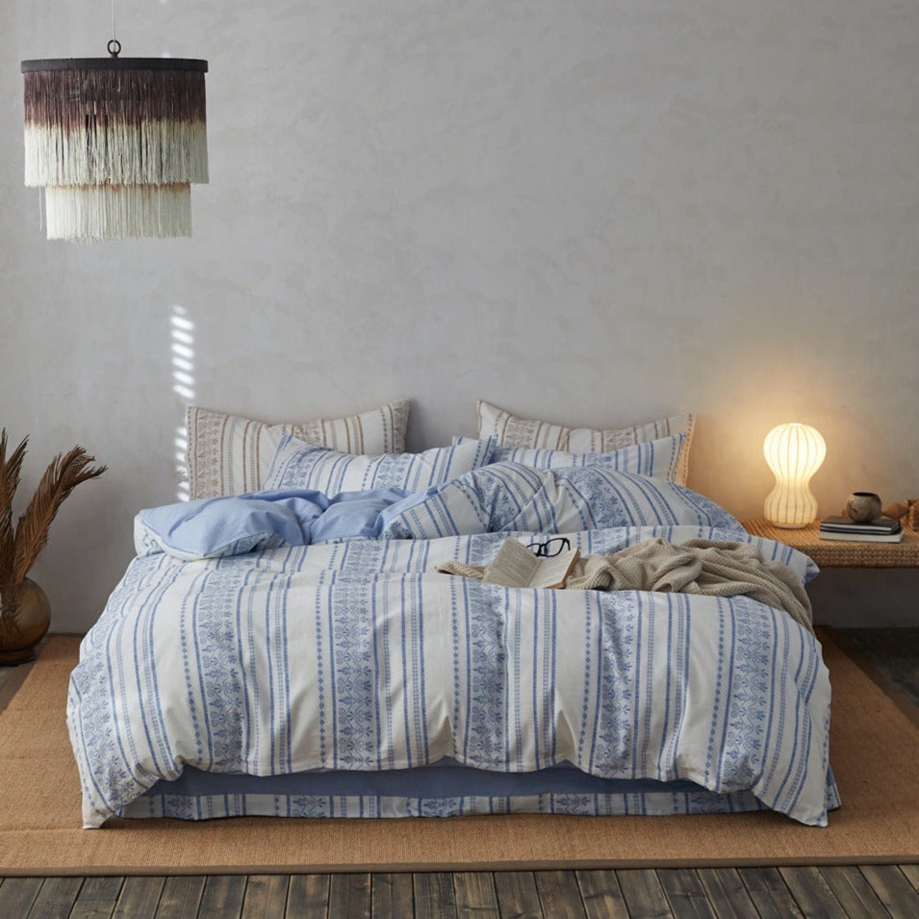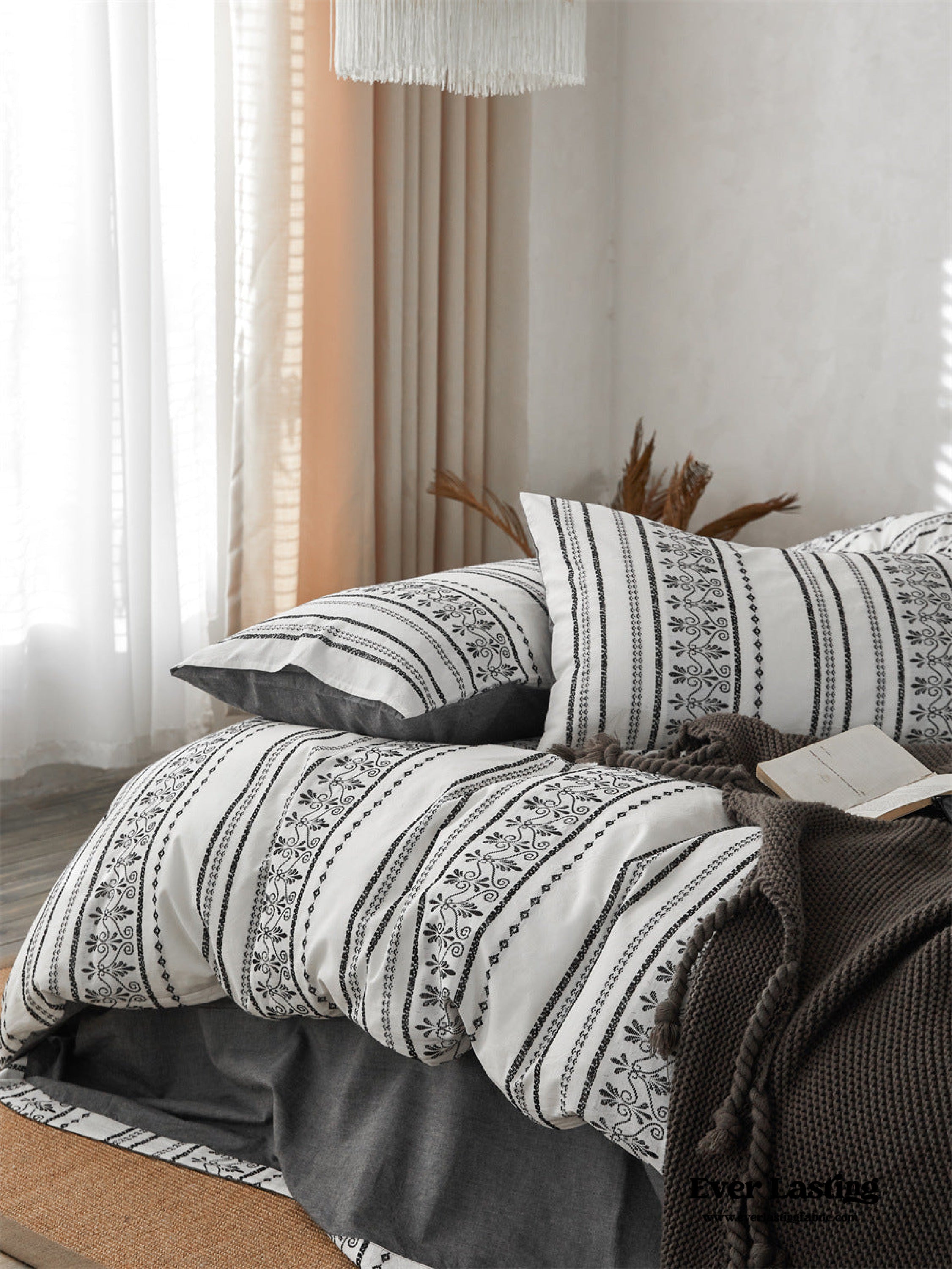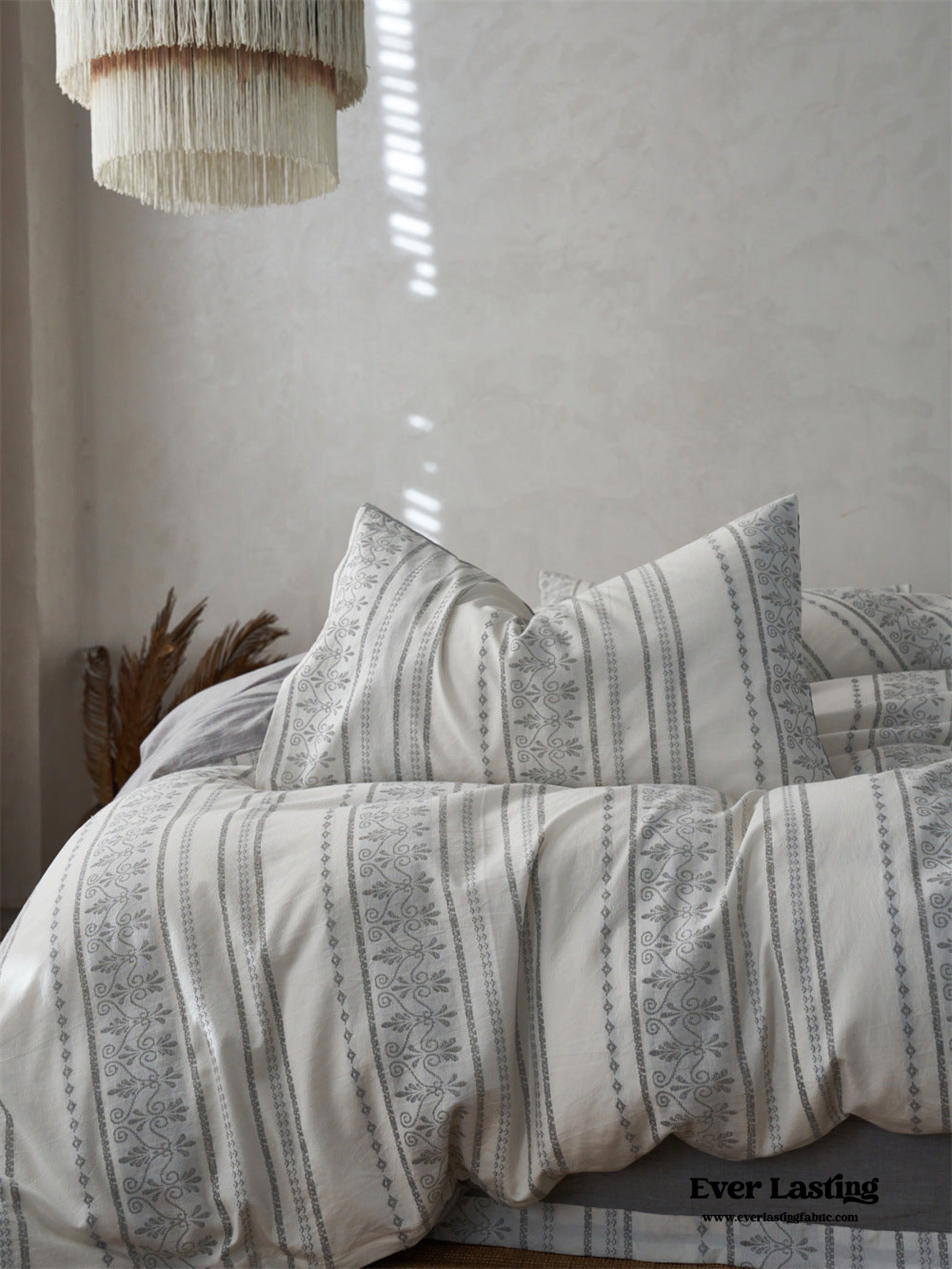 Introducing our Boho Jacquard Cotton Bedding Set where free-spirited design meets ultimate comfort. Immerse yourself in the eclectic charm of bohemian aesthetics. crafted with the finest cotton in a mesmerizing jacquard weave. The bedding set captures the essence of boho chic with its intricate patterns and soft. breathable fabric. creating a haven of style and relaxation in your bedroom.Each duvet cover is thoughtfully equipped with four corner ties and a hidden zipper. ensuring your duvet insert stays securely in place throughout the night.Elevate your sleep experience with the perfect fusion of unique design and premium quality cotton. turning your bedroom into a vibrant retreat that resonates with the free-spirited soul within you.