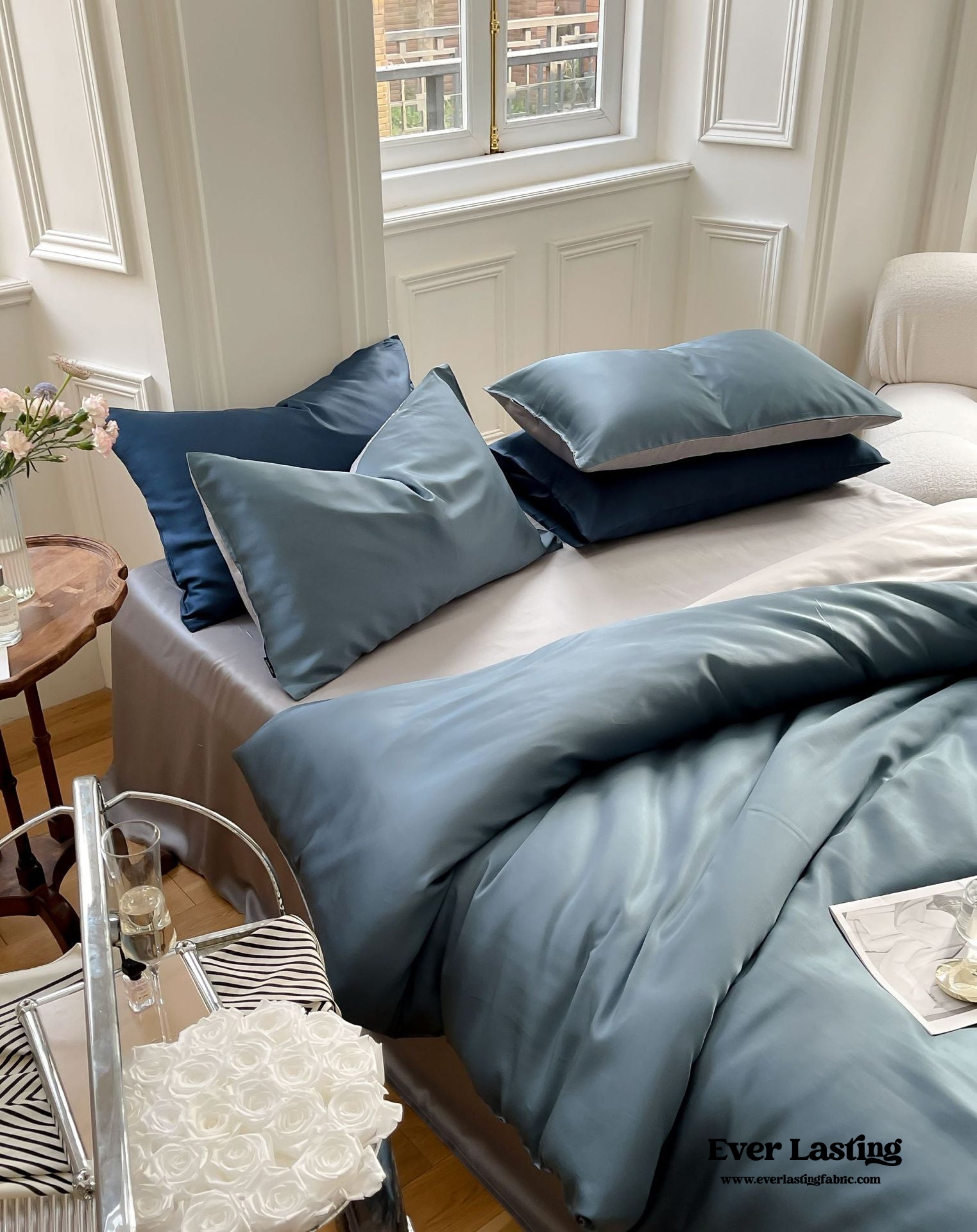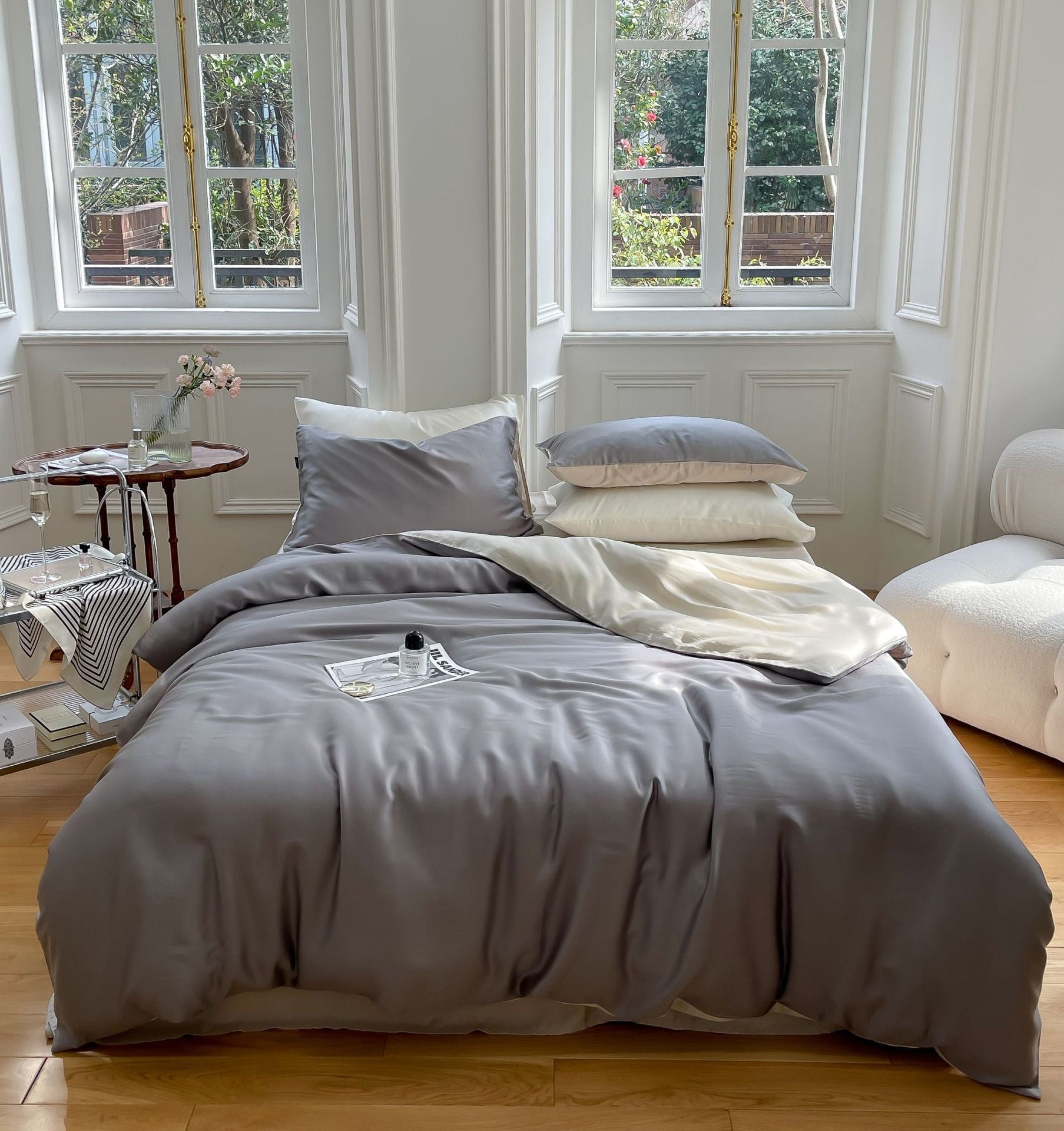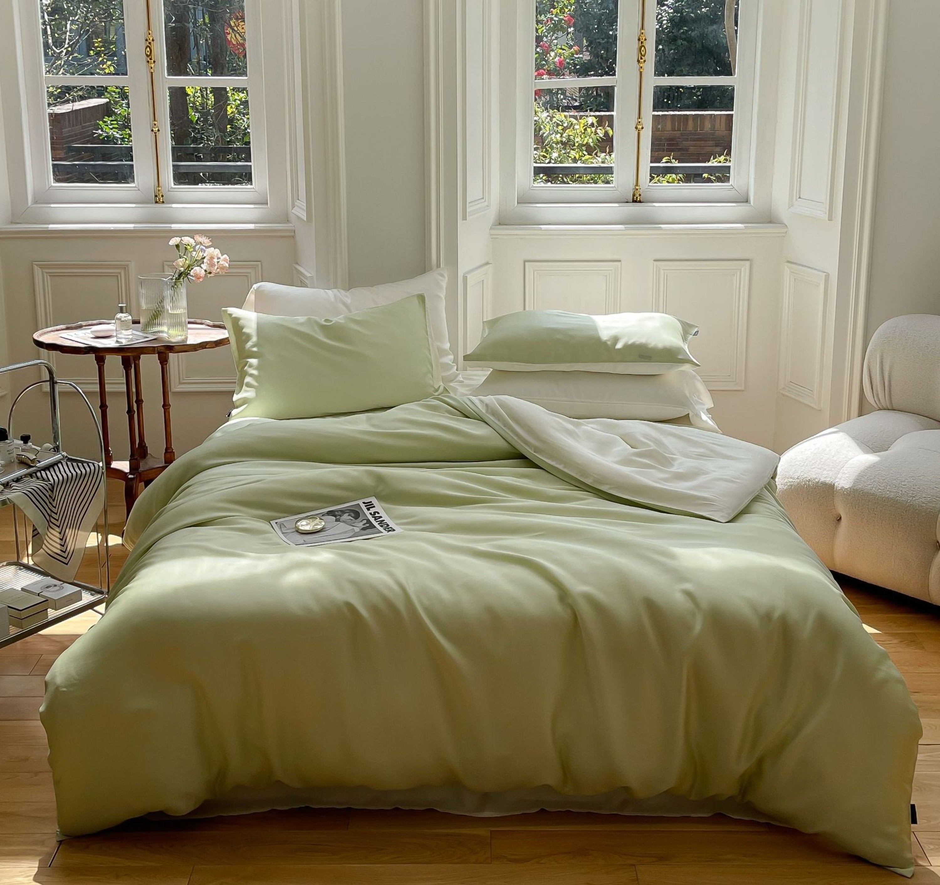 Introducing our DUO Reversible Pastel Silky Tencel Bedding Set. a harmonious blend of versatility and luxury. This set offers two exquisite looks in one. with a reversible design that lets you choose between soft pastel shades for a fresh and airy feel. Crafted from the finest Tencel fabric. it promises a silky-smooth touch and exceptional breathability for a comfortable night's sleep. Each duvet cover features four corner ties and a hidden zipper. ensuring your duvet insert stays securely in place all night. Elevate your sleep experience with this sophisticated and reversible bedding set. where versatility meets the promise of serene and silky comfort.