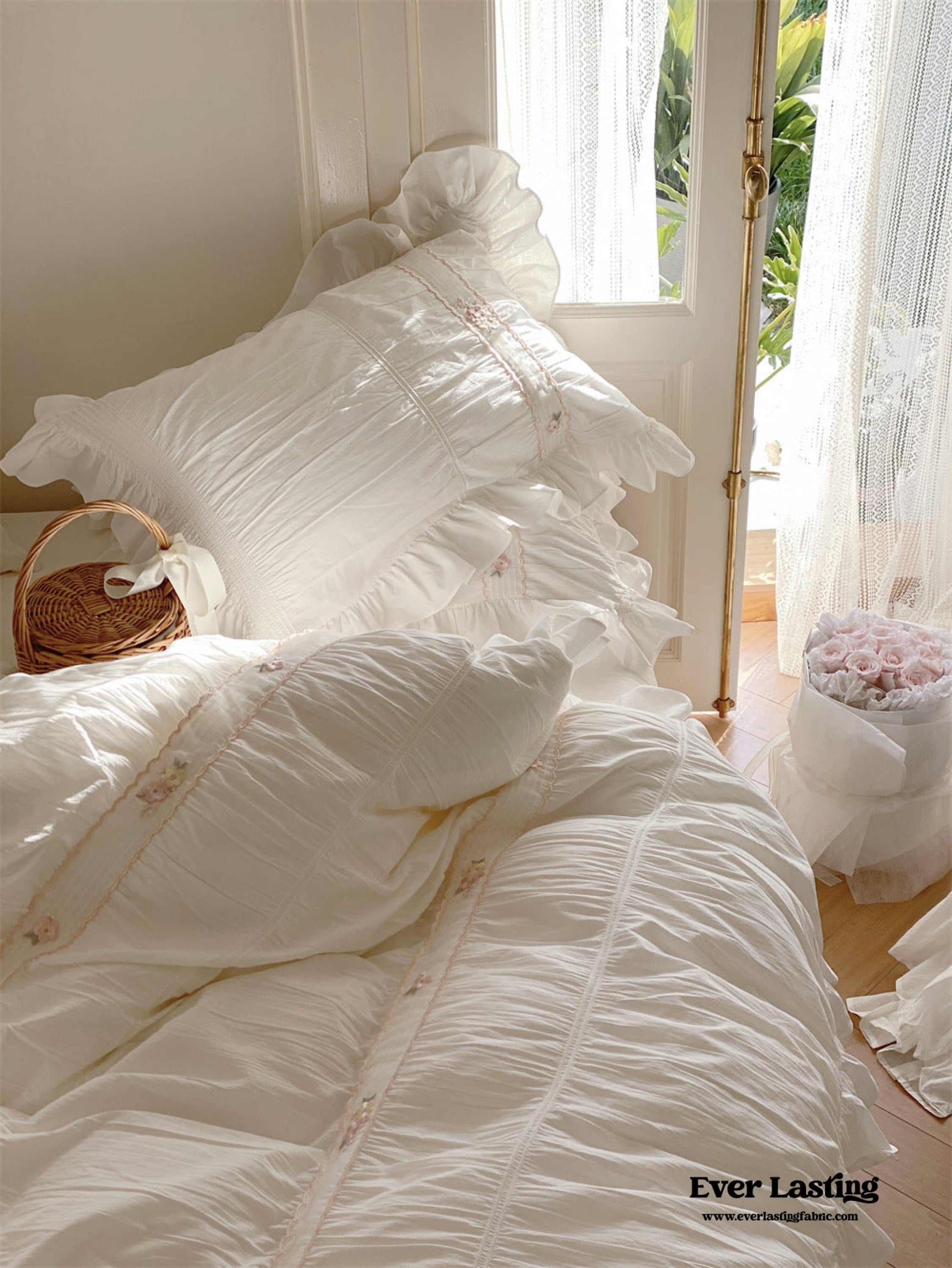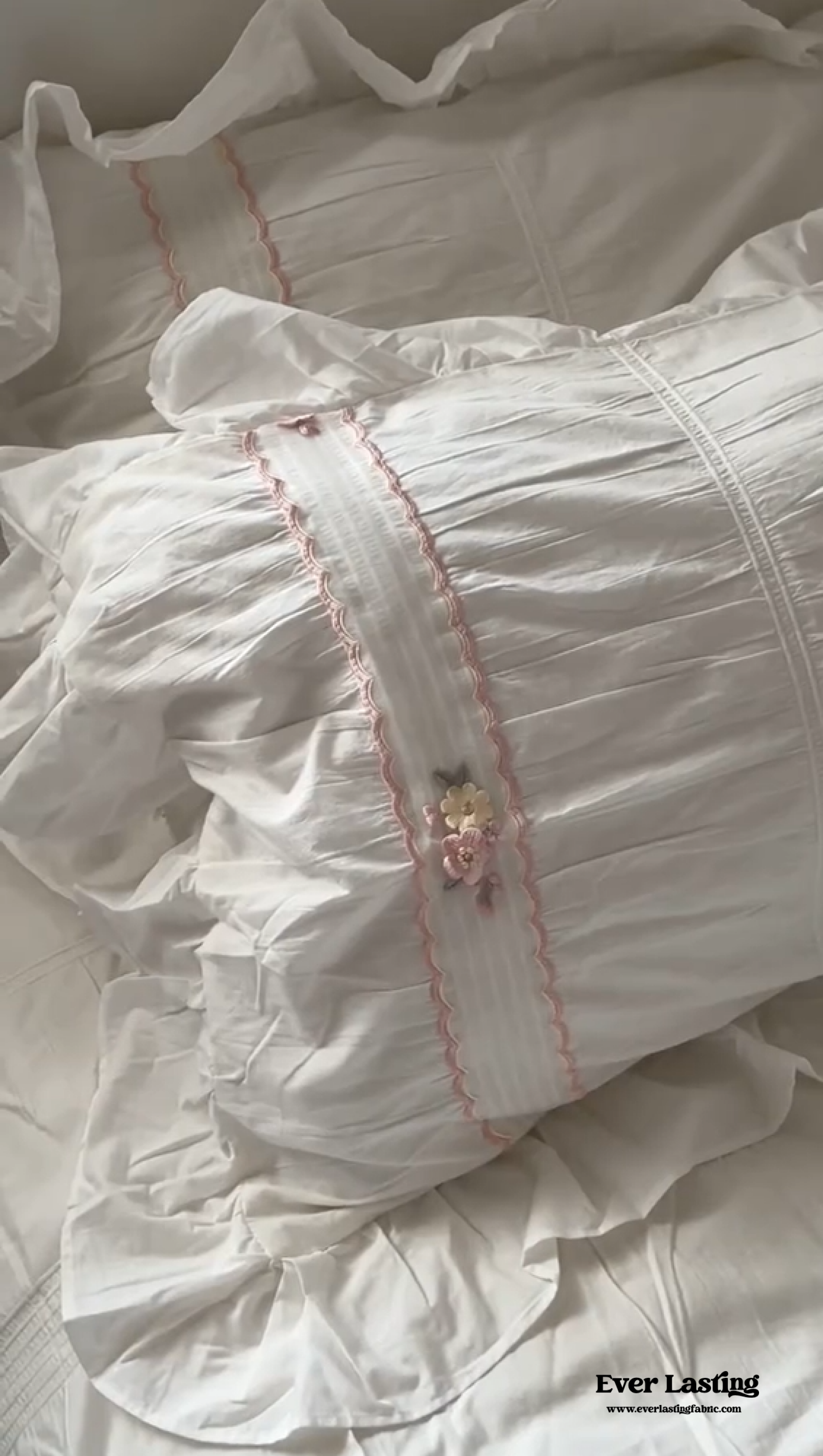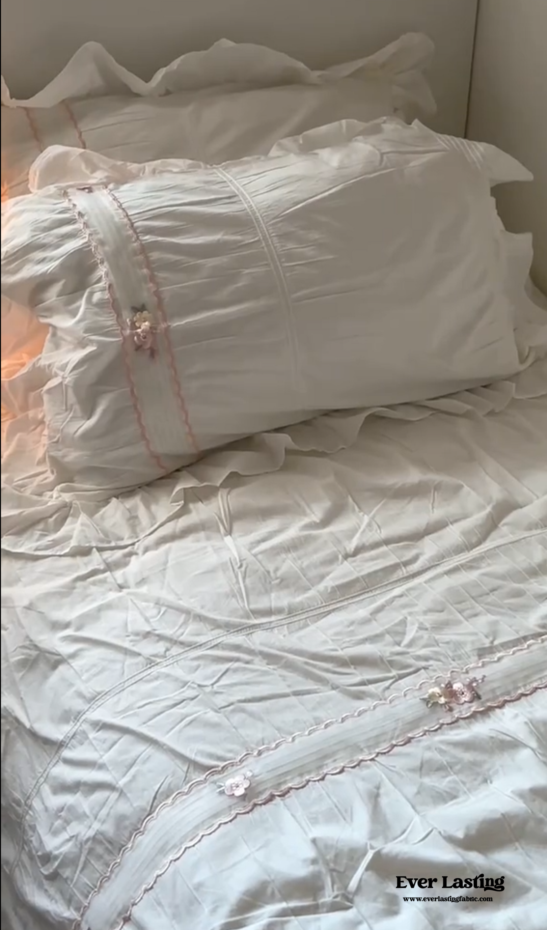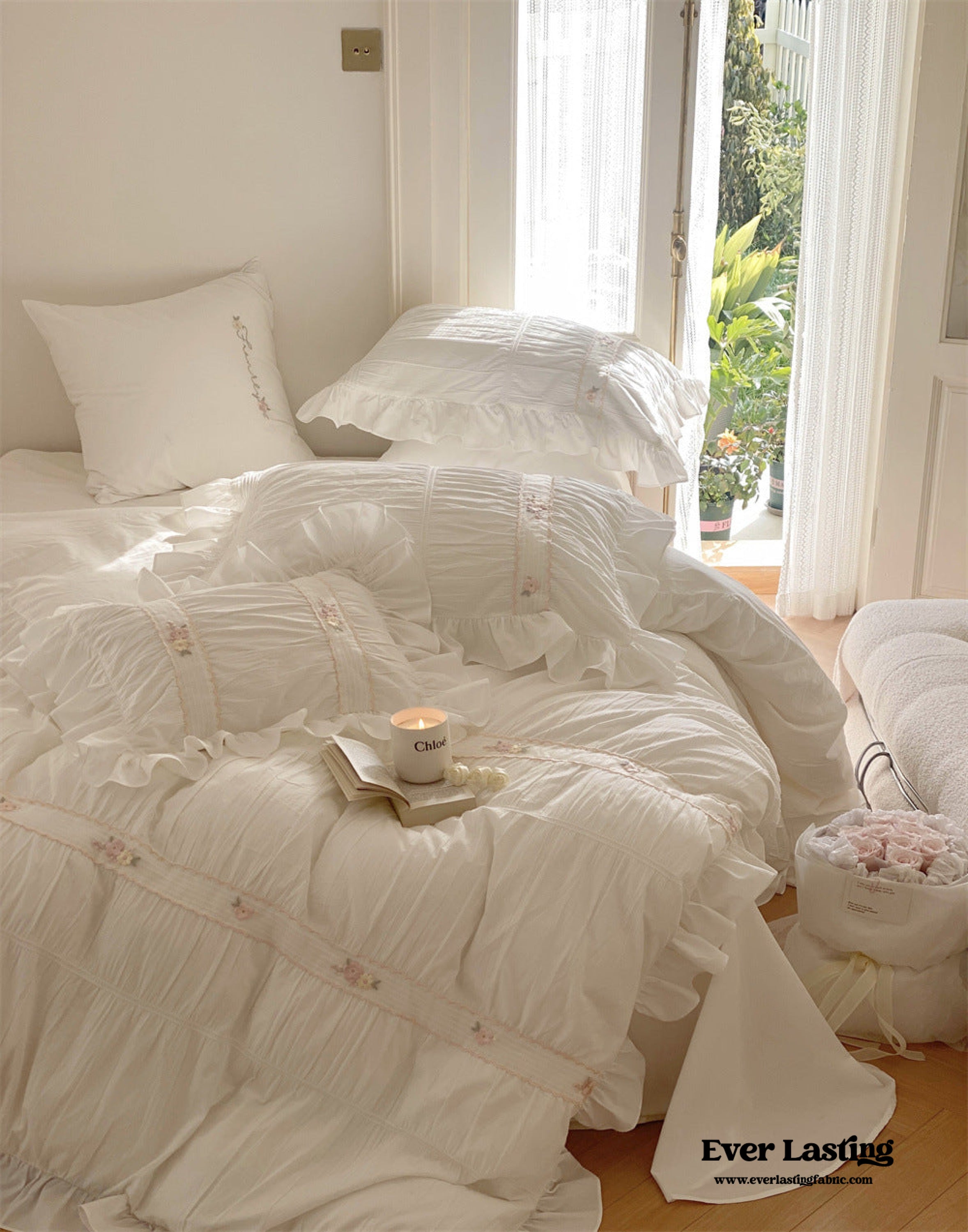 Elevate your bedroom decor with our Embroidered Lace Ruffle Bedding Set true masterpiece for the cozy haven of your dreams. Crafted with love and attention to detail. this set is made from 100% cotton. ensuring a soft and breathable experience throughout the night. The unique design showcases delicate handcrafted floral embroidery. adding a touch of elegance and charm. With its lovely ruffle style. this bedding set brings a playful and romantic vibe to any space. Rest assured. our high-quality materials guarantee durability and comfort. making every sleep a dreamy affair. Upgrade your bedding game with this one-of-a-kind set that promises both style and coziness!