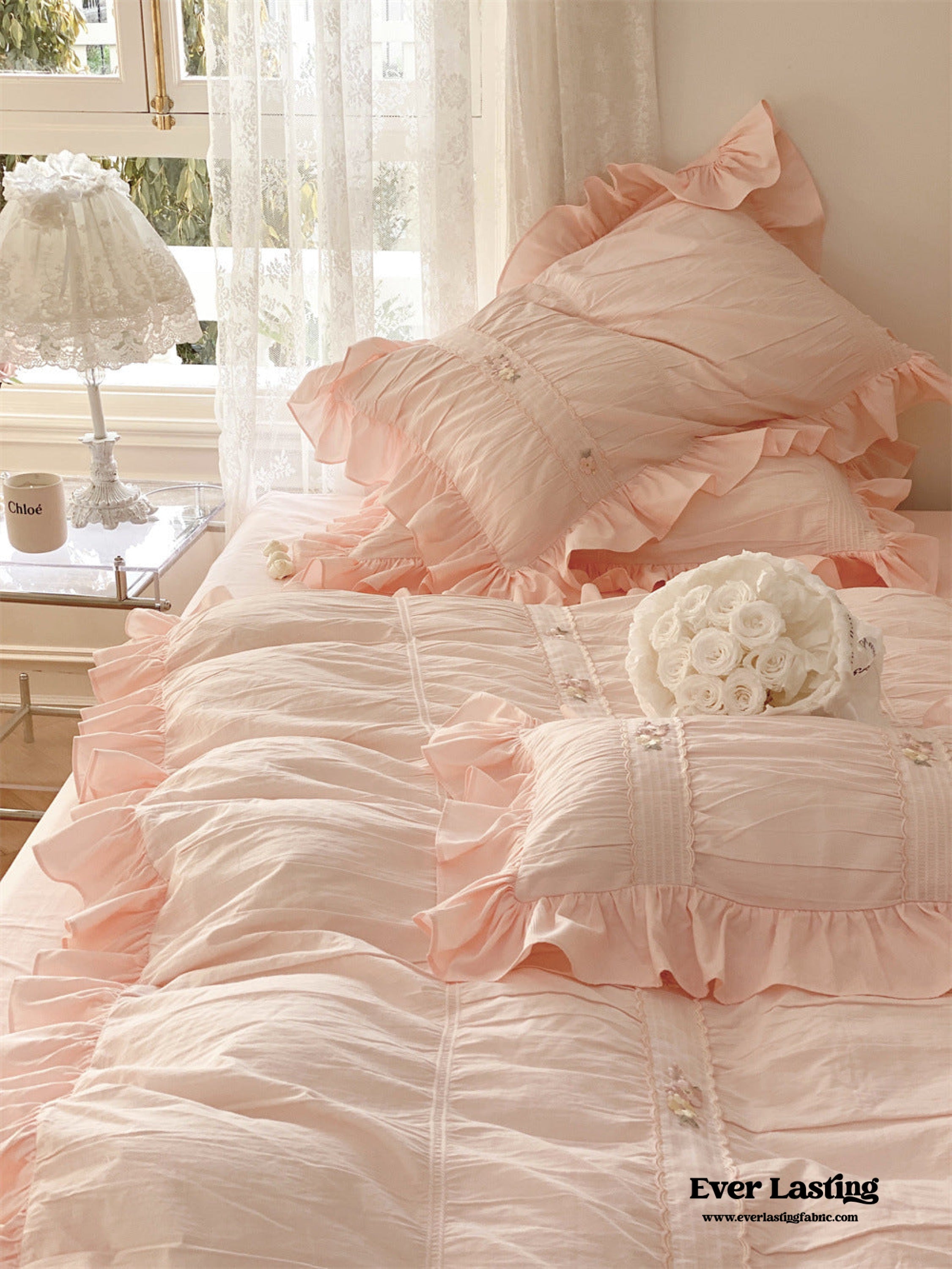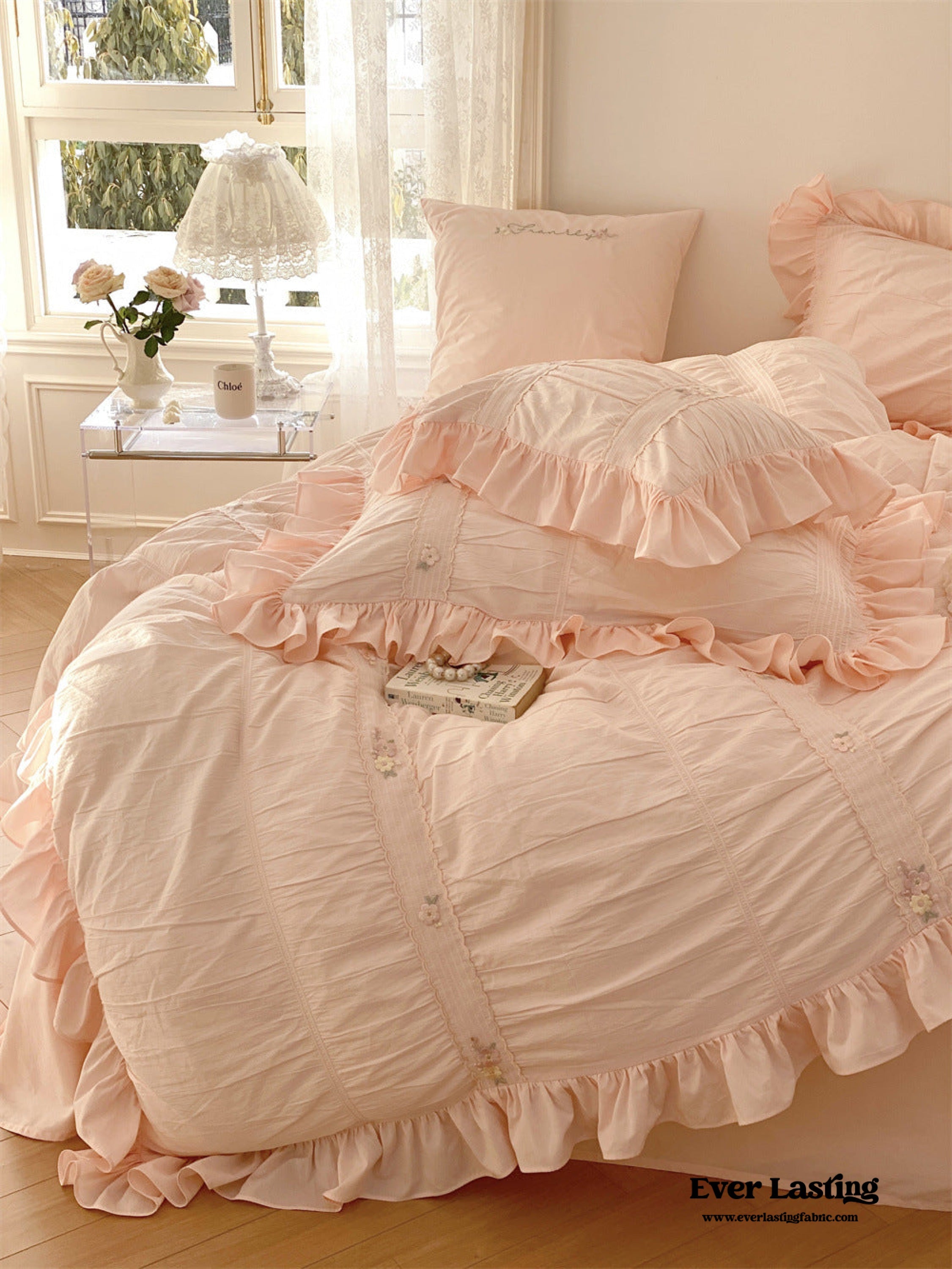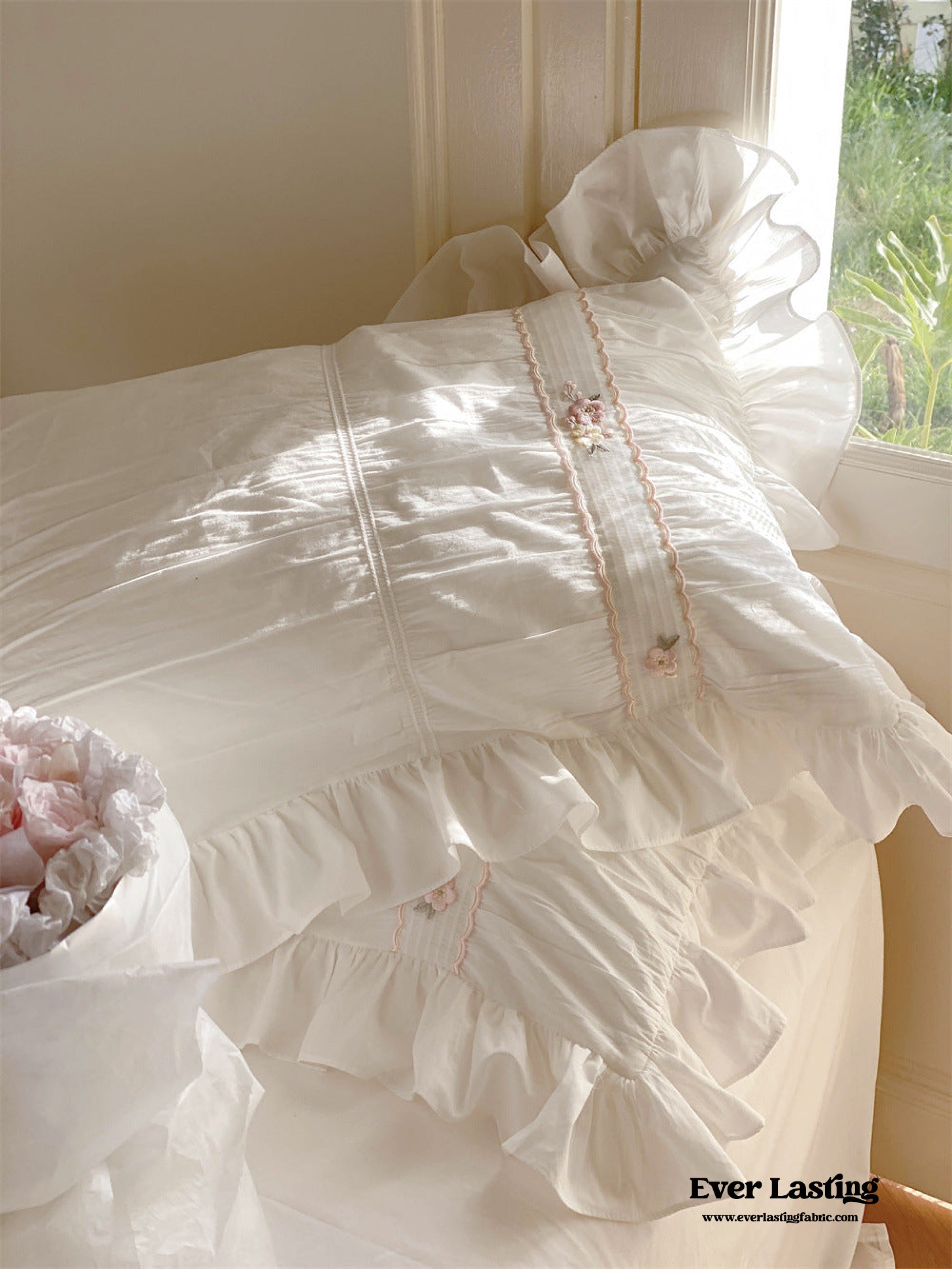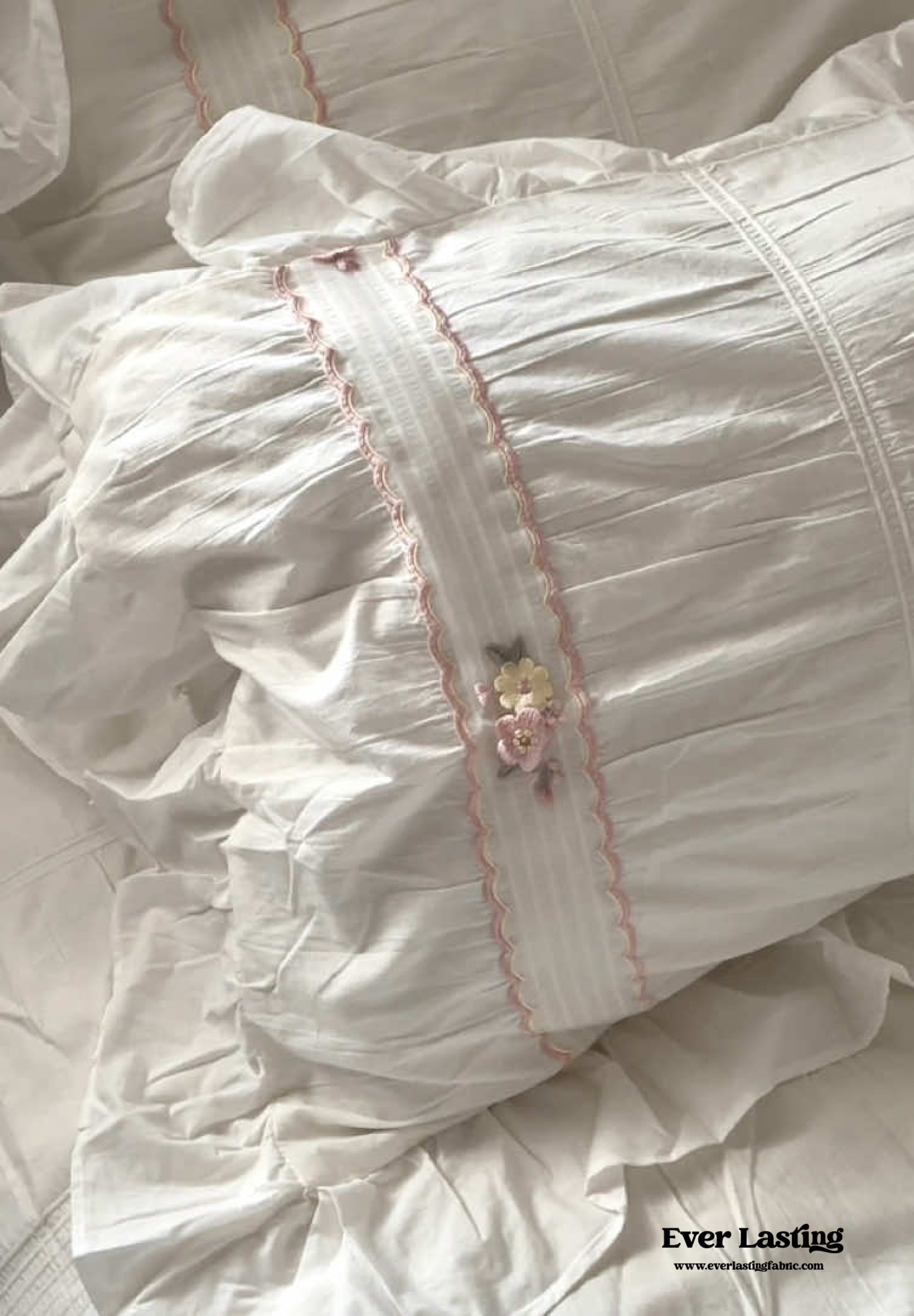 Elevate your bedroom decor with our Embroidered Lace Ruffle Bedding Set true masterpiece for the cozy haven of your dreams. Crafted with love and attention to detail. this set is made from 100% cotton. ensuring a soft and breathable experience throughout the night. The unique design showcases delicate handcrafted floral embroidery. adding a touch of elegance and charm. With its lovely ruffle style. this bedding set brings a playful and romantic vibe to any space. Rest assured. our high-quality materials guarantee durability and comfort. making every sleep a dreamy affair. Upgrade your bedding game with this one-of-a-kind set that promises both style and coziness!