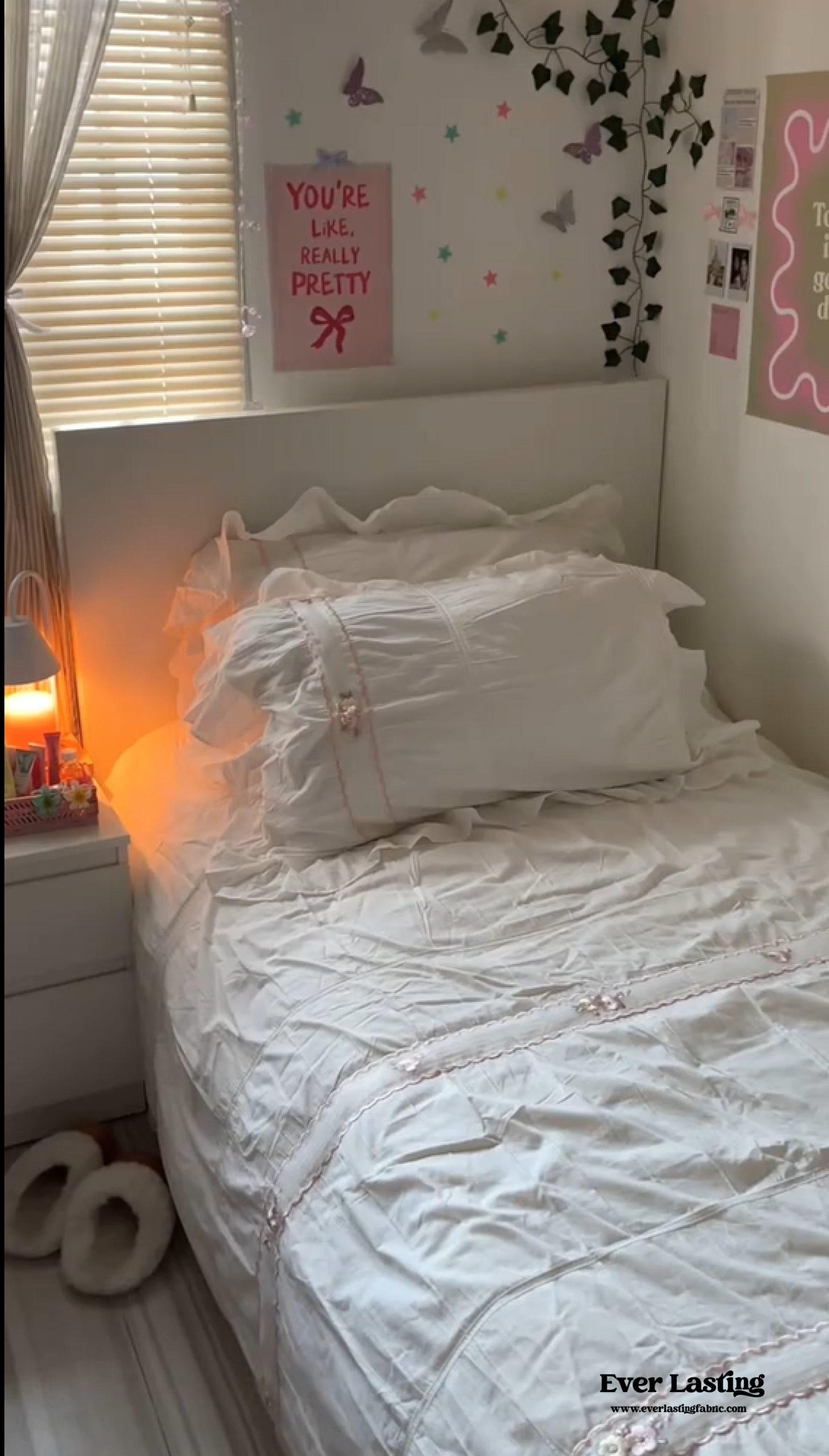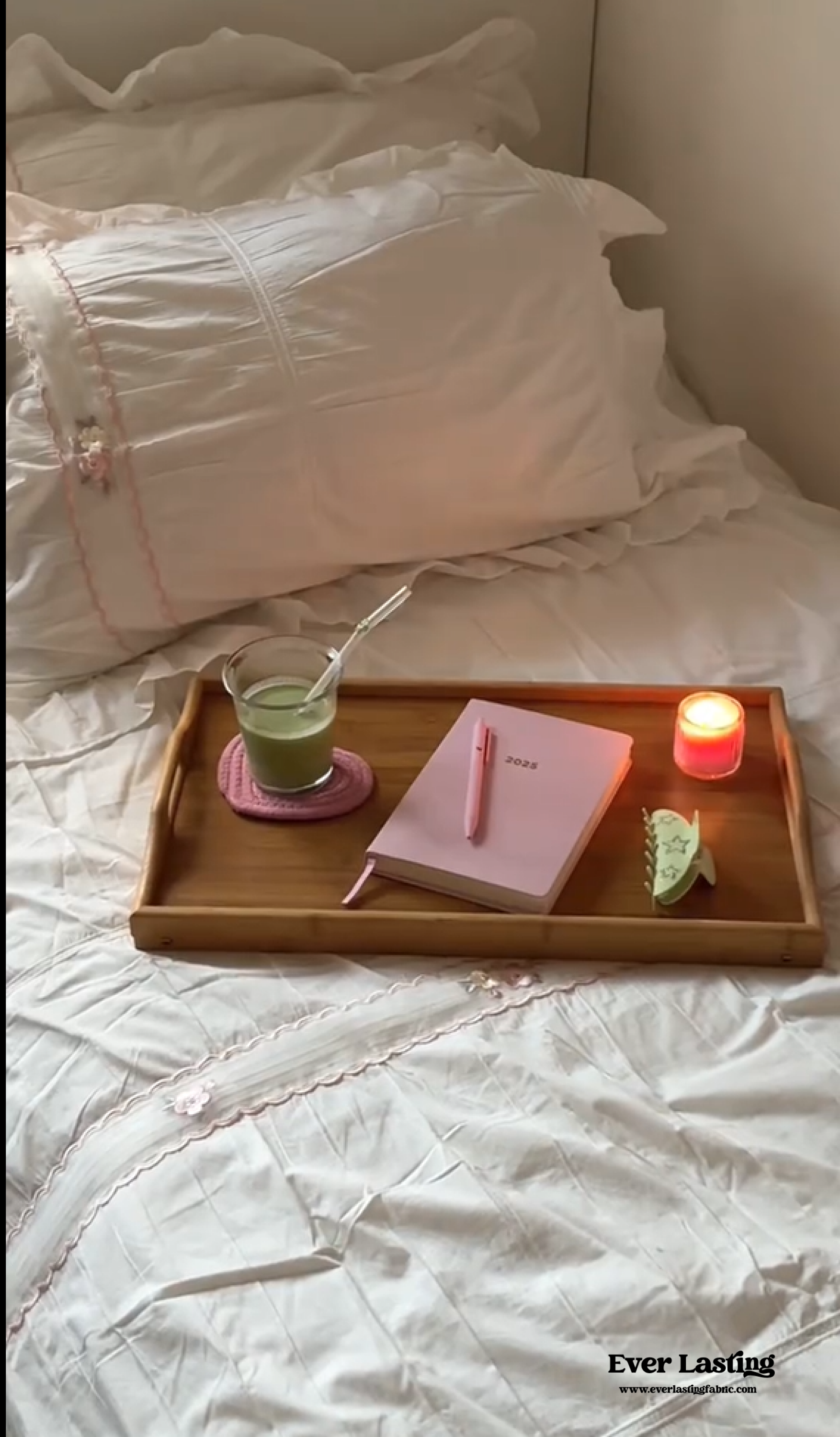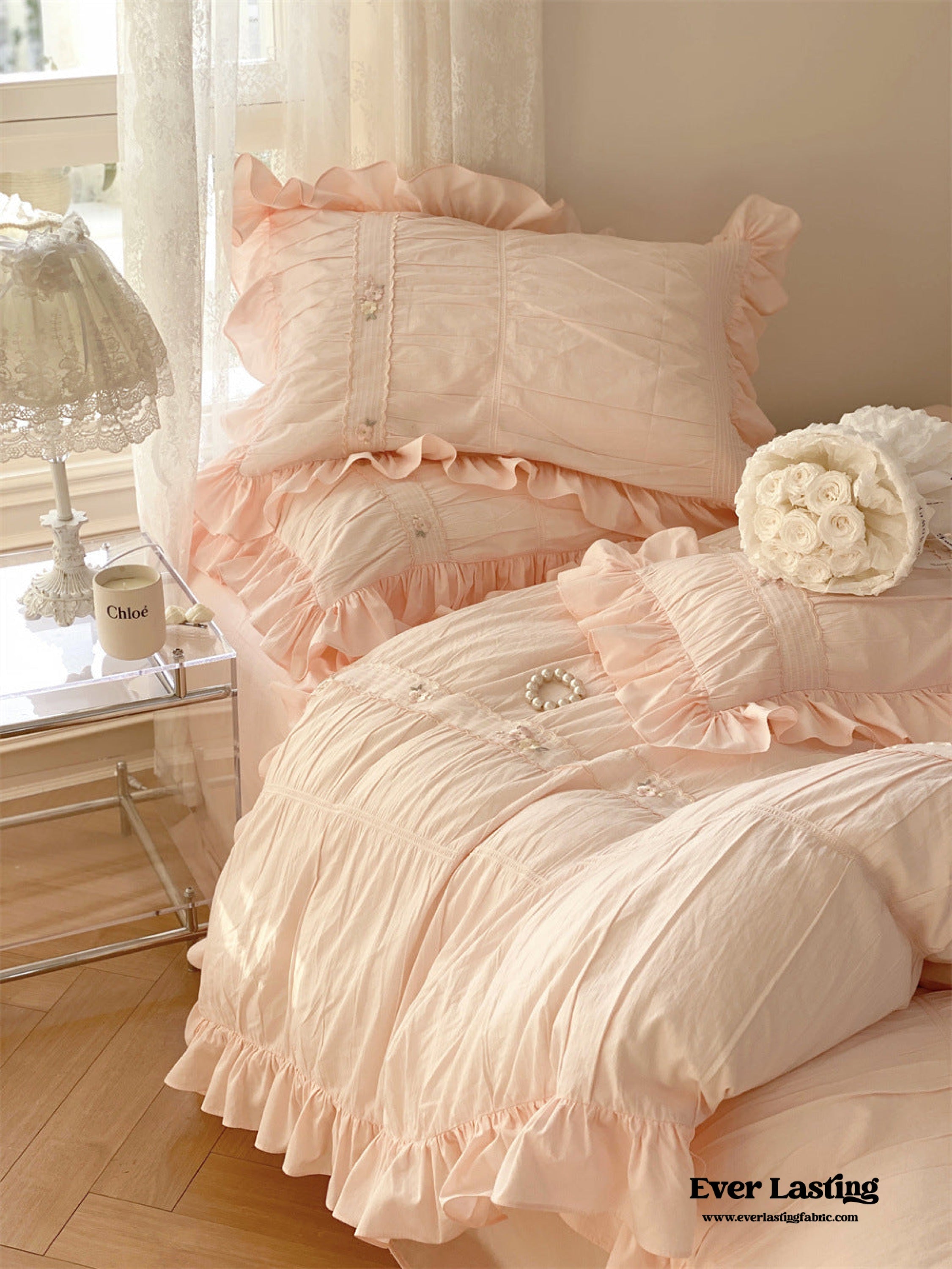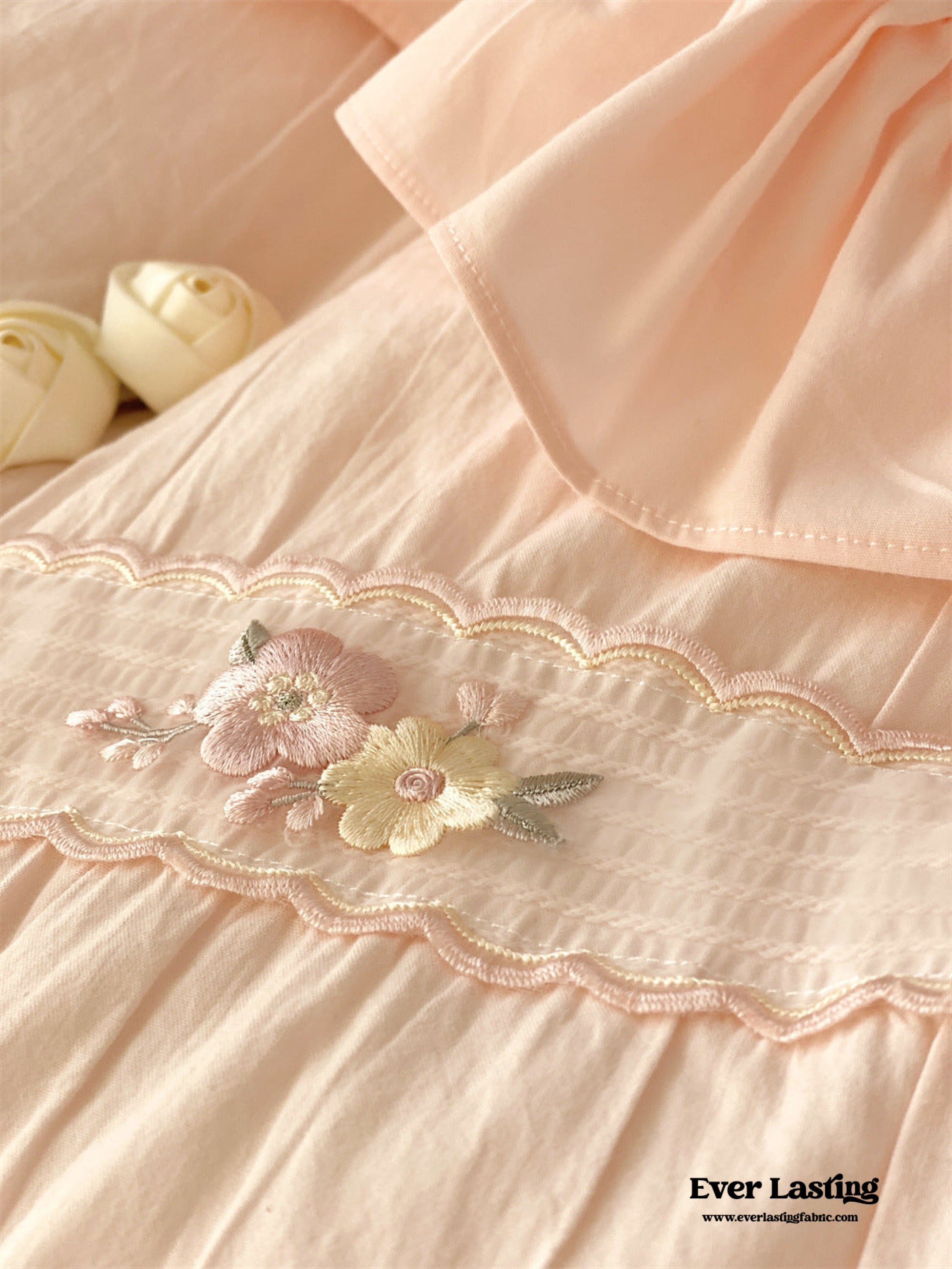 Elevate your bedroom decor with our Embroidered Lace Ruffle Bedding Set true masterpiece for the cozy haven of your dreams. Crafted with love and attention to detail. this set is made from 100% cotton. ensuring a soft and breathable experience throughout the night. The unique design showcases delicate handcrafted floral embroidery. adding a touch of elegance and charm. With its lovely ruffle style. this bedding set brings a playful and romantic vibe to any space. Rest assured. our high-quality materials guarantee durability and comfort. making every sleep a dreamy affair. Upgrade your bedding game with this one-of-a-kind set that promises both style and coziness!