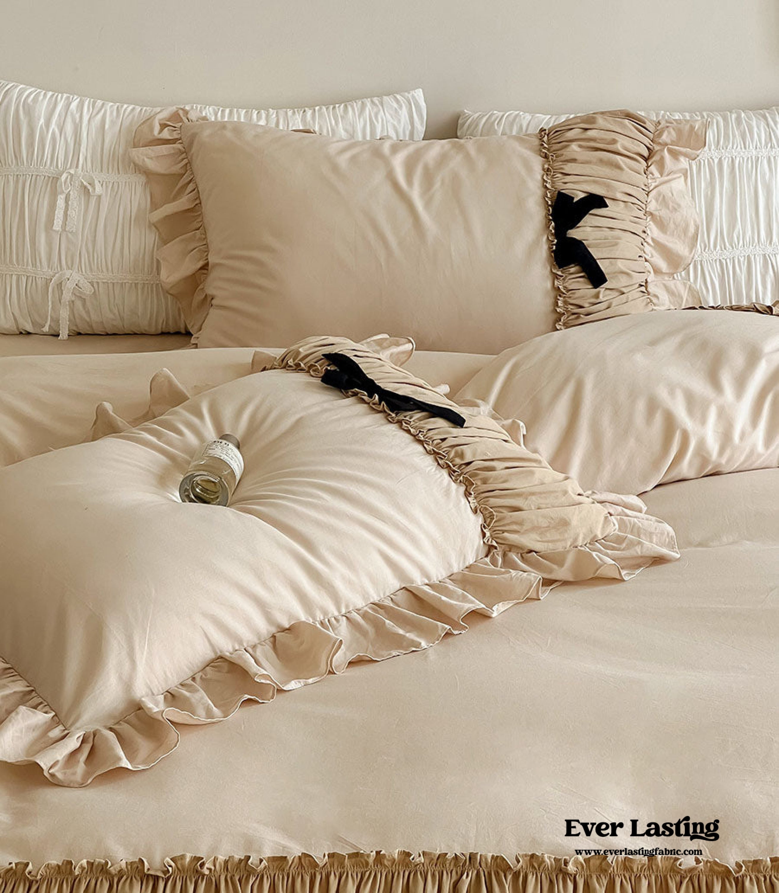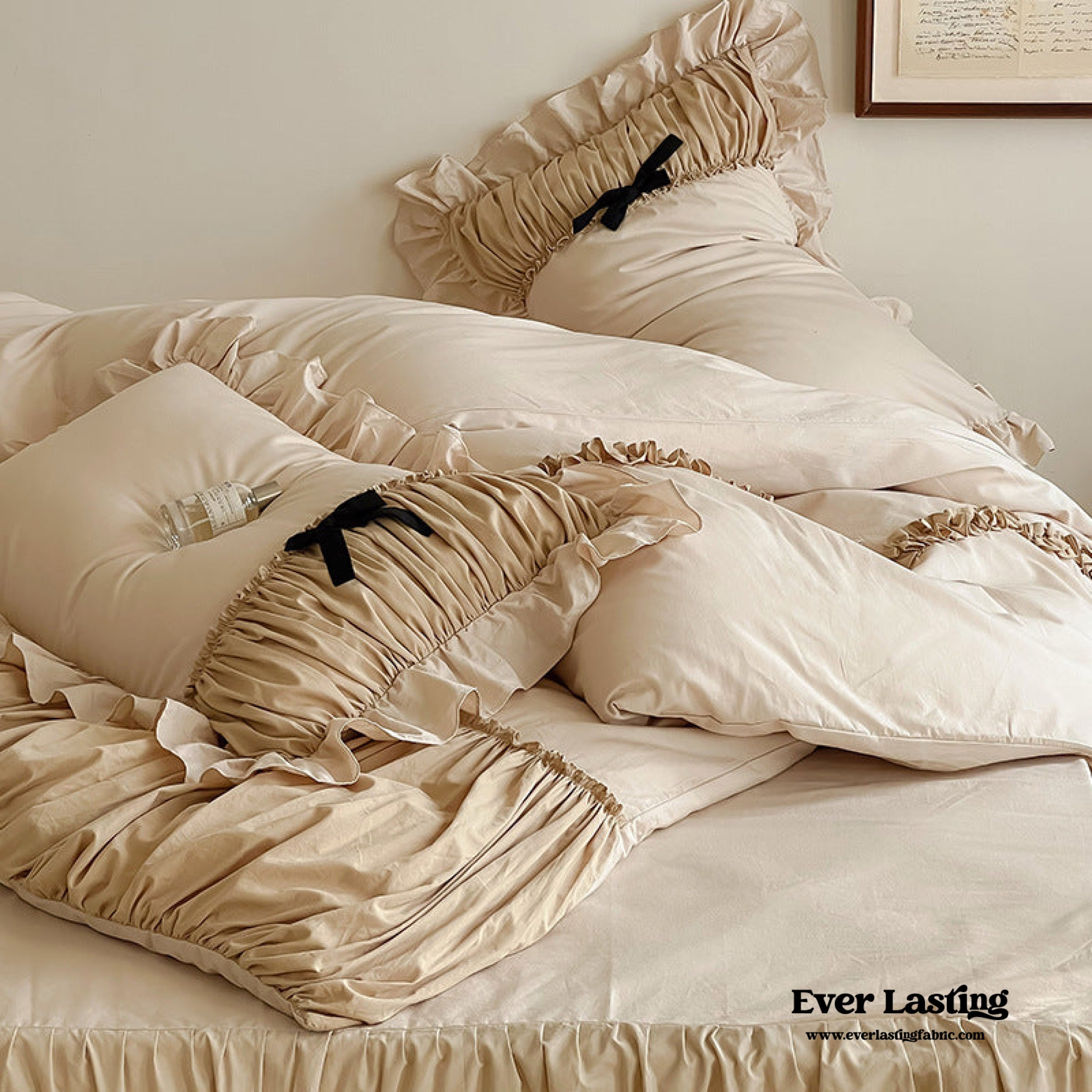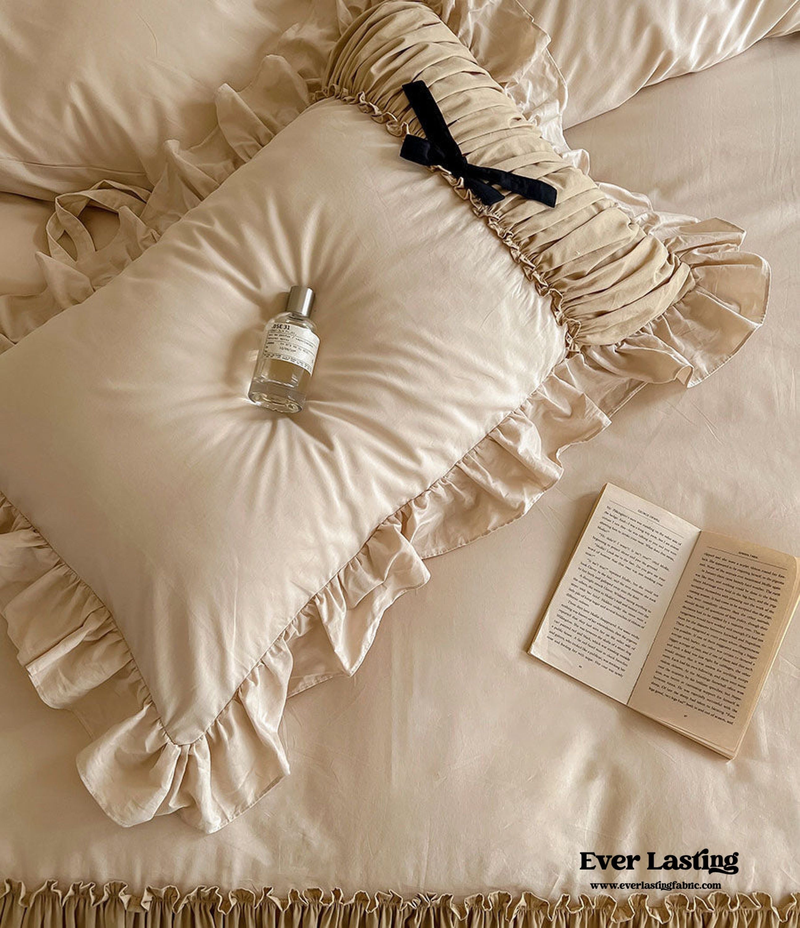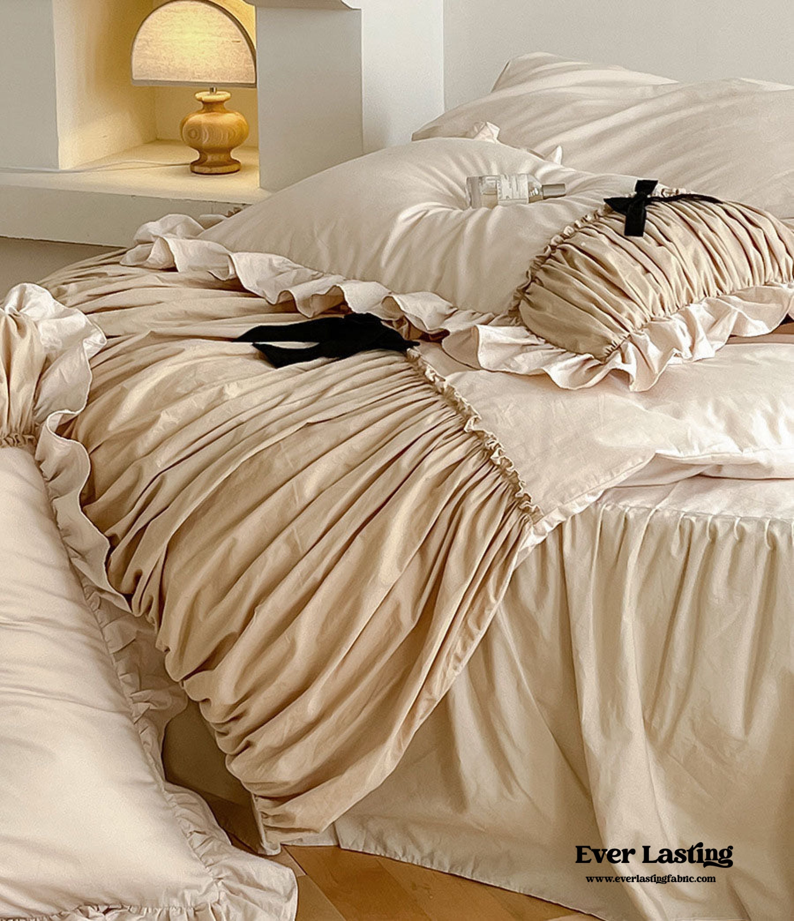 Infuse your bedroom with the timeless elegance of our French Beige Ribbon Ruffle Bedding Bundle. This bundle is a testament to classic beauty. featuring delicate ribbon ties and a soft beige backdrop that exudes sophistication. Crafted for both aesthetics and comfort. it transforms your space into a haven of timeless charm and relaxation. Each duvet cover features four corner ties and a hidden zipper. ensuring your duvet insert stays securely in place all night. Elevate your sleep experience with this exquisite and stylish bedding bundle. where the allure of ribbon ties meets the promise of serene sophistication in every ruffle.