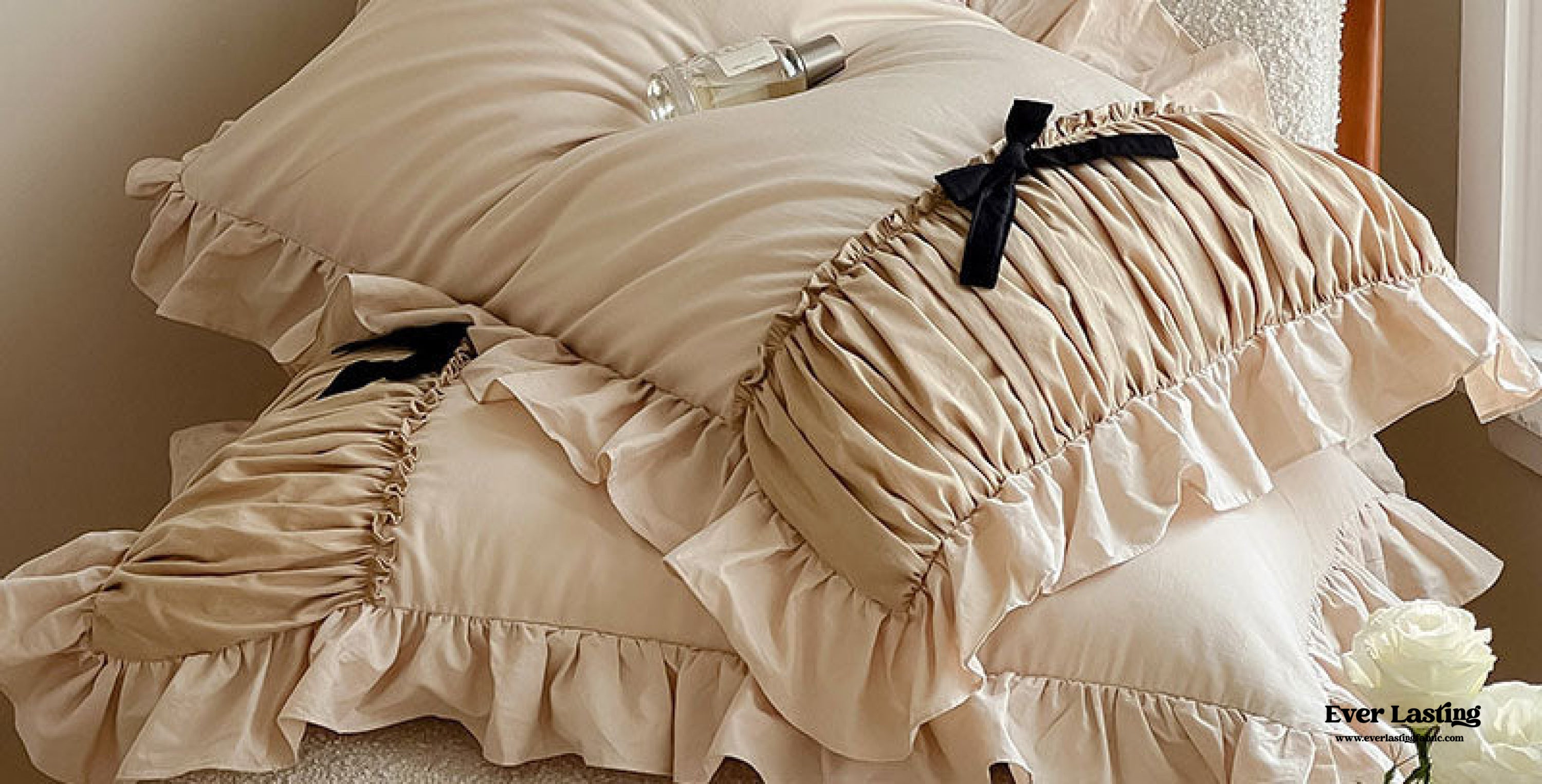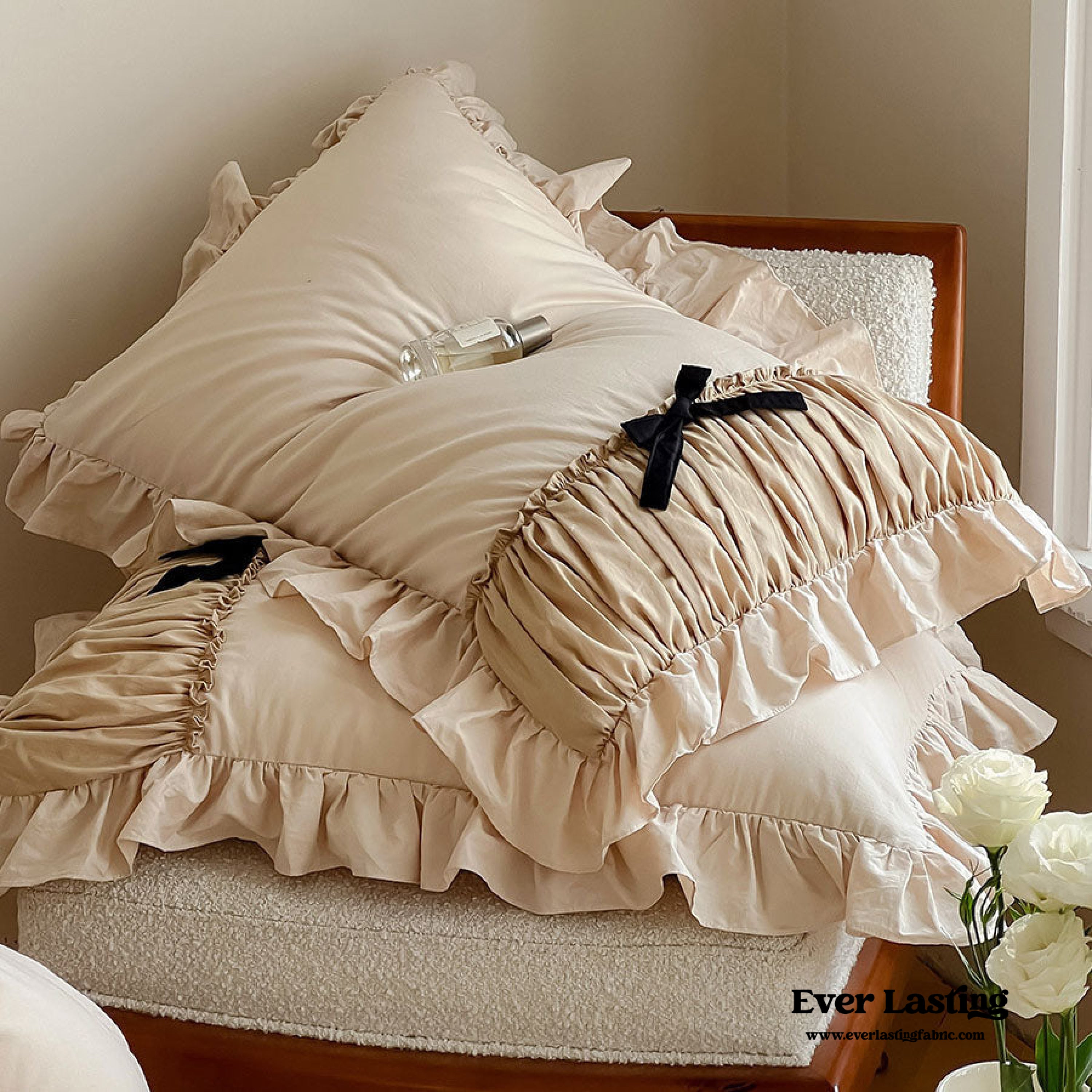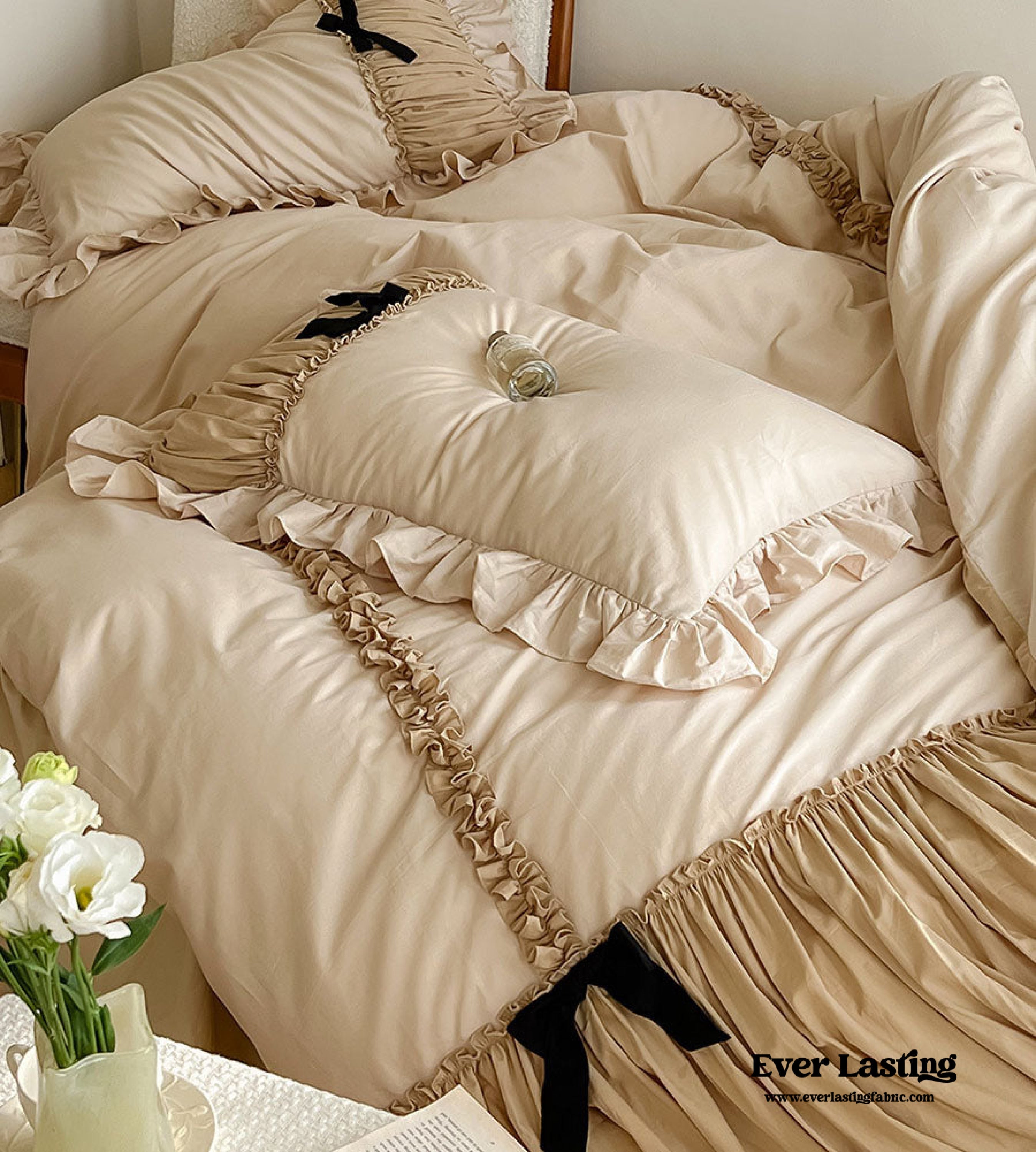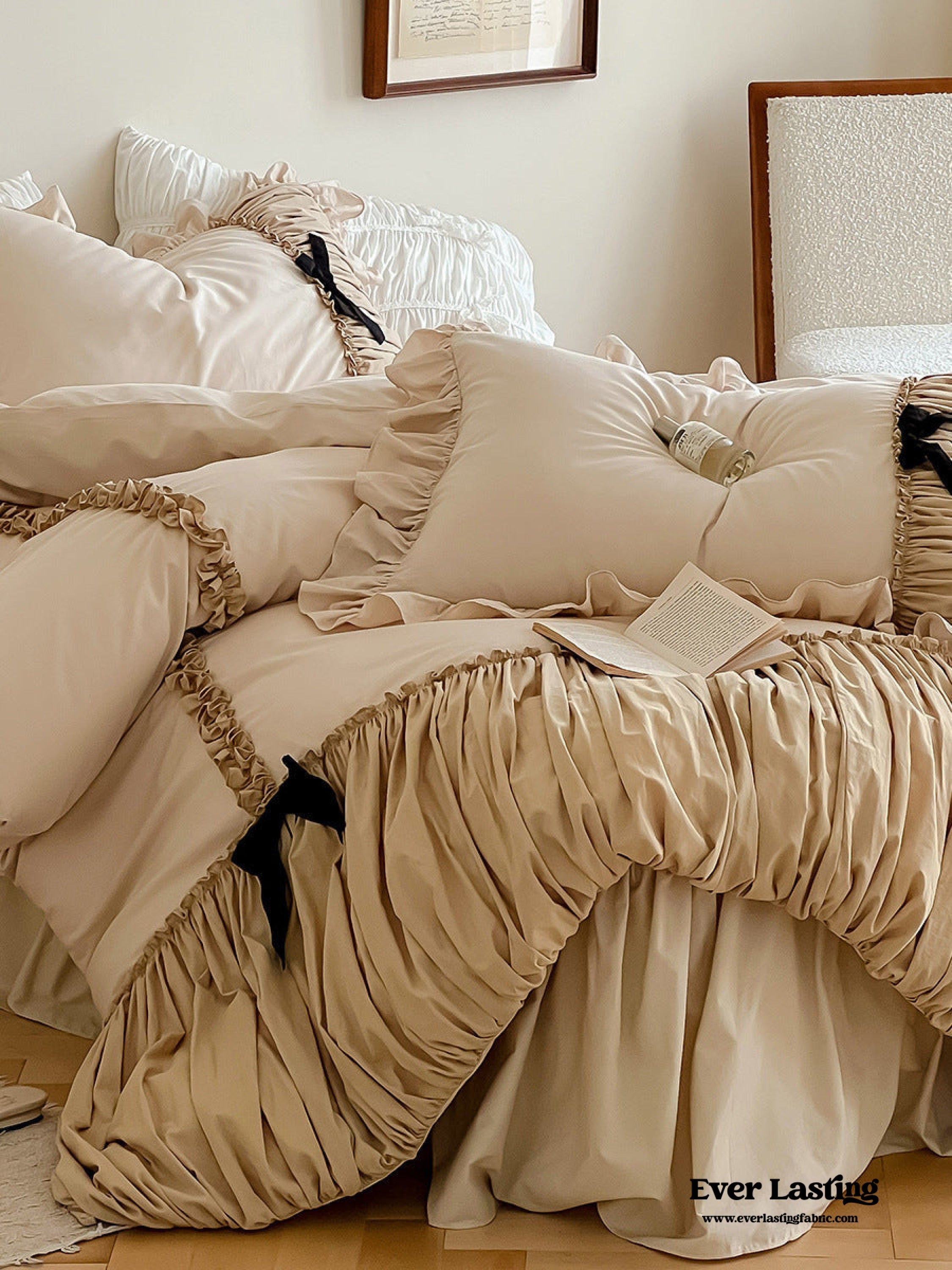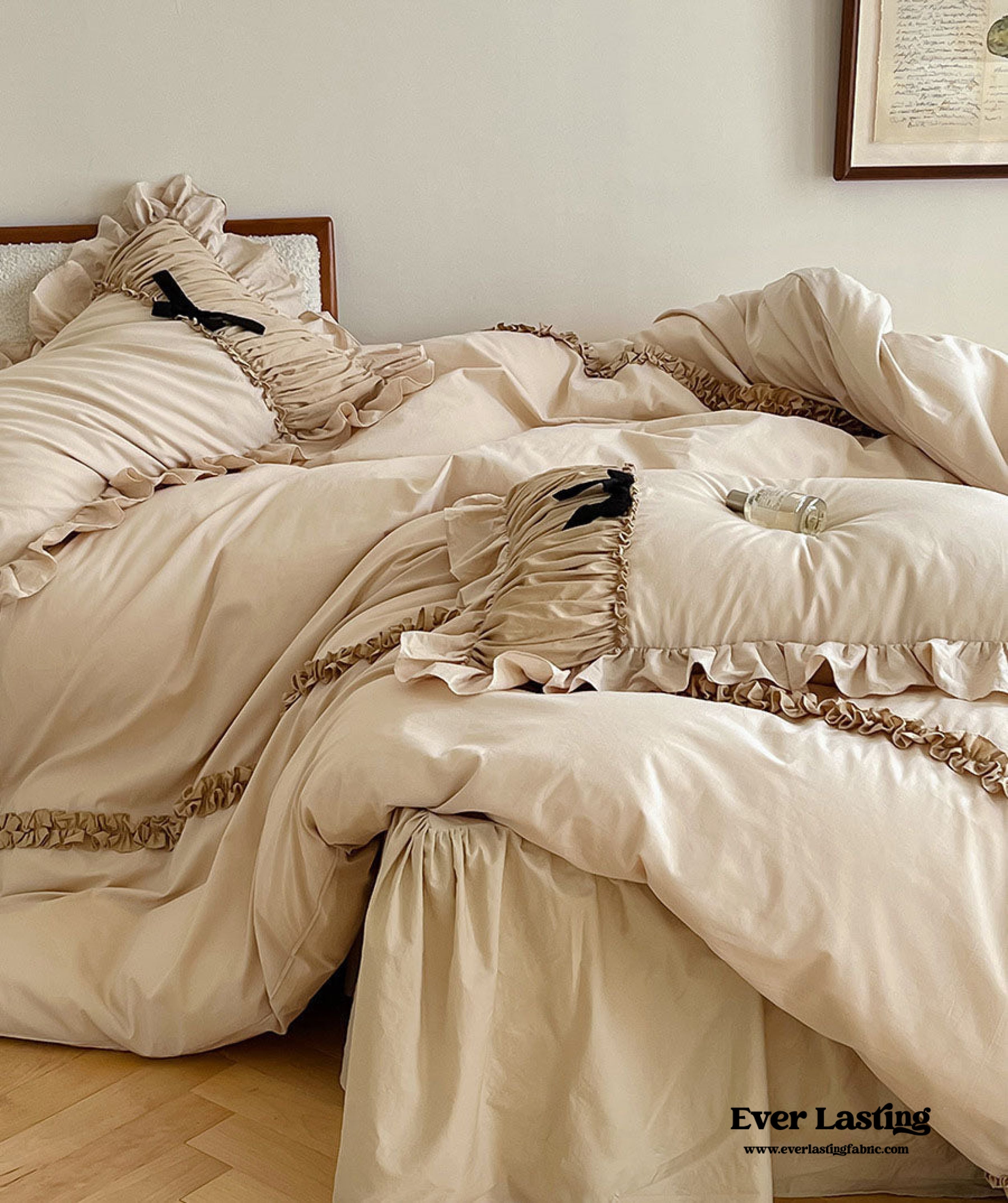 Infuse your bedroom with the timeless elegance of our French Beige Ribbon Ruffle Bedding Bundle. This bundle is a testament to classic beauty. featuring delicate ribbon ties and a soft beige backdrop that exudes sophistication. Crafted for both aesthetics and comfort. it transforms your space into a haven of timeless charm and relaxation. Each duvet cover features four corner ties and a hidden zipper. ensuring your duvet insert stays securely in place all night. Elevate your sleep experience with this exquisite and stylish bedding bundle. where the allure of ribbon ties meets the promise of serene sophistication in every ruffle.