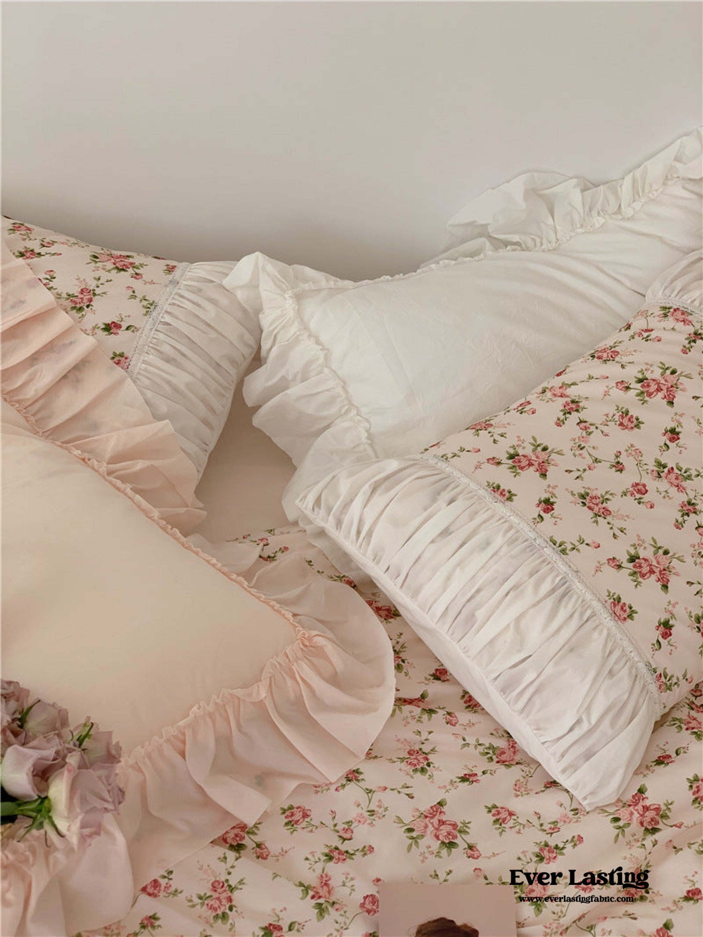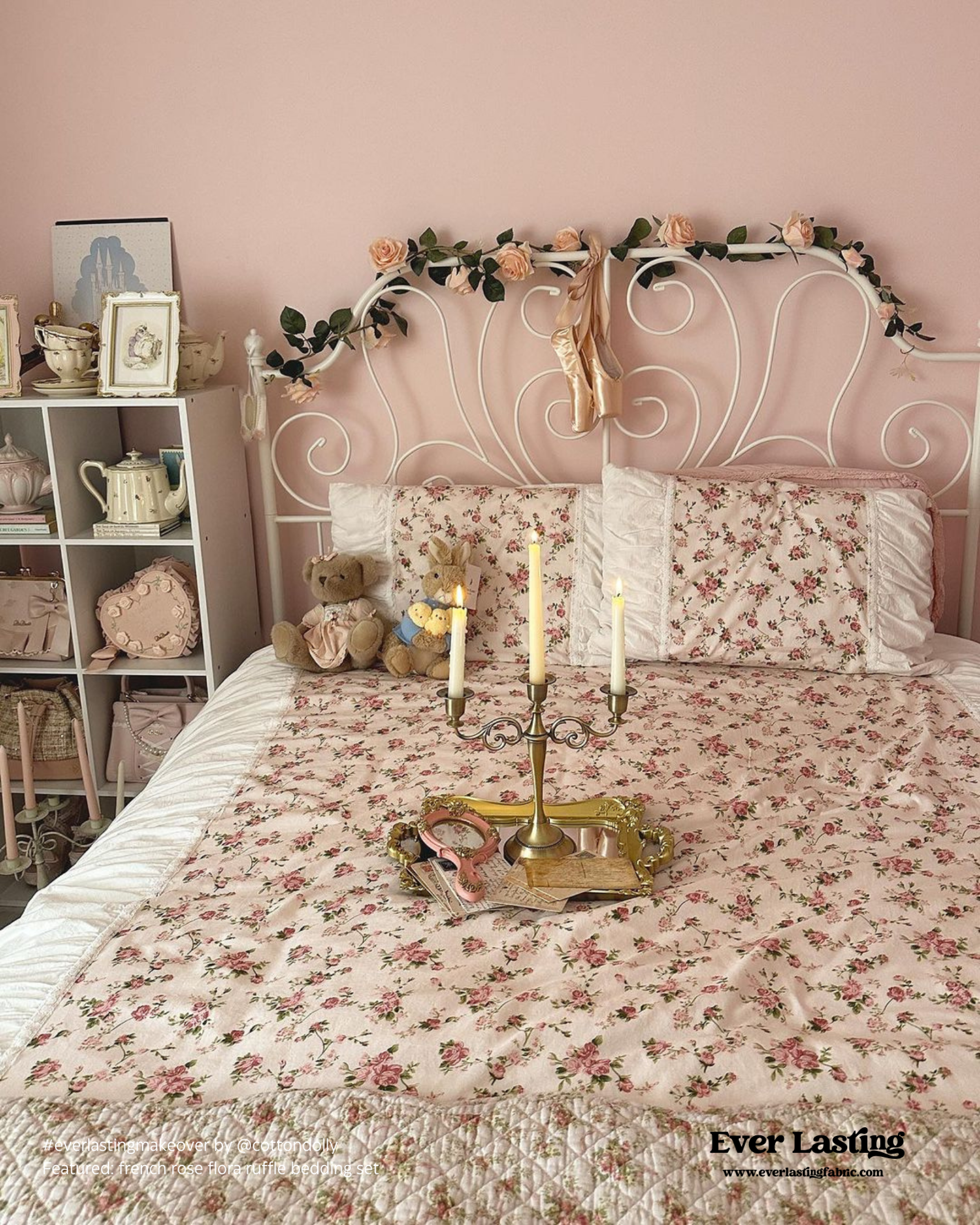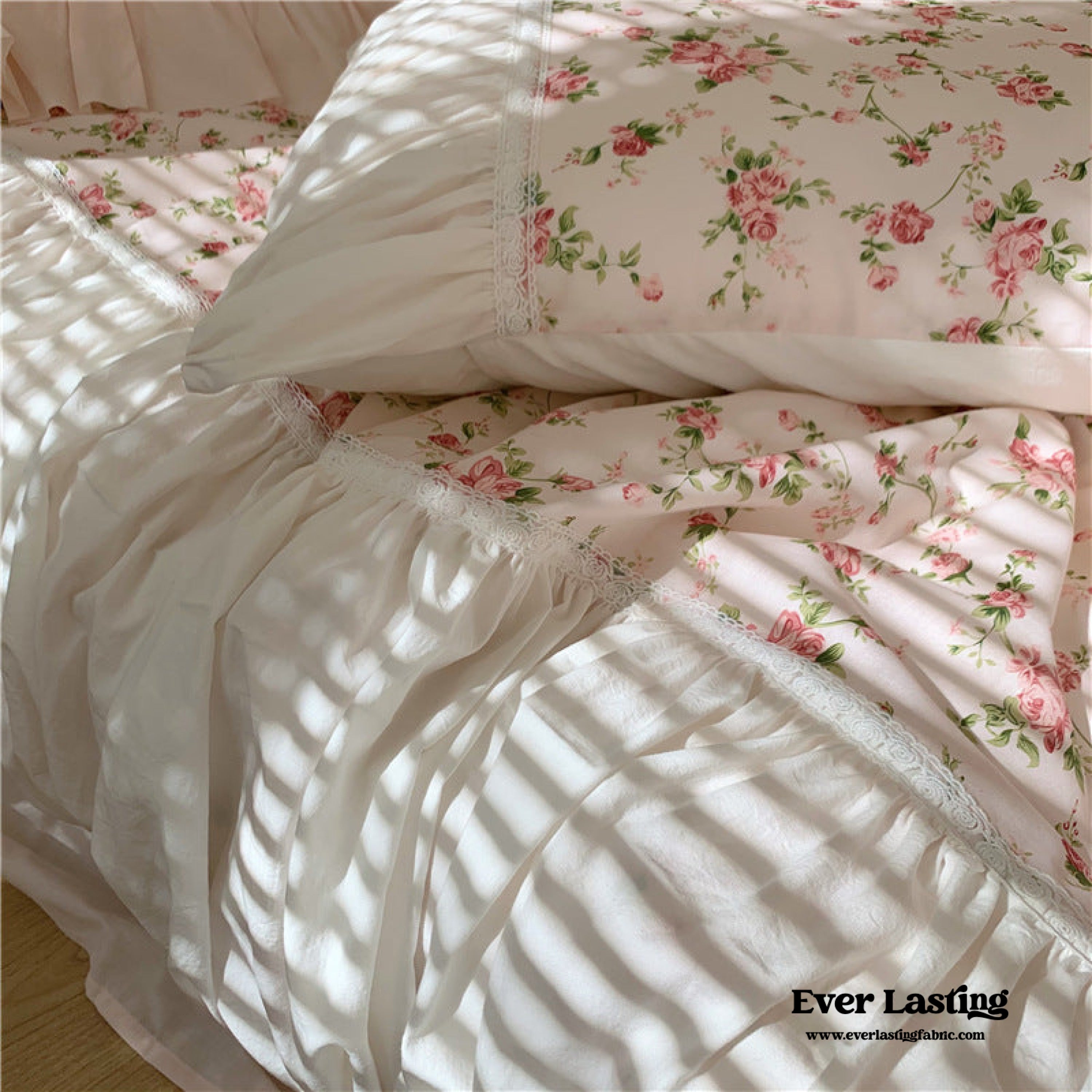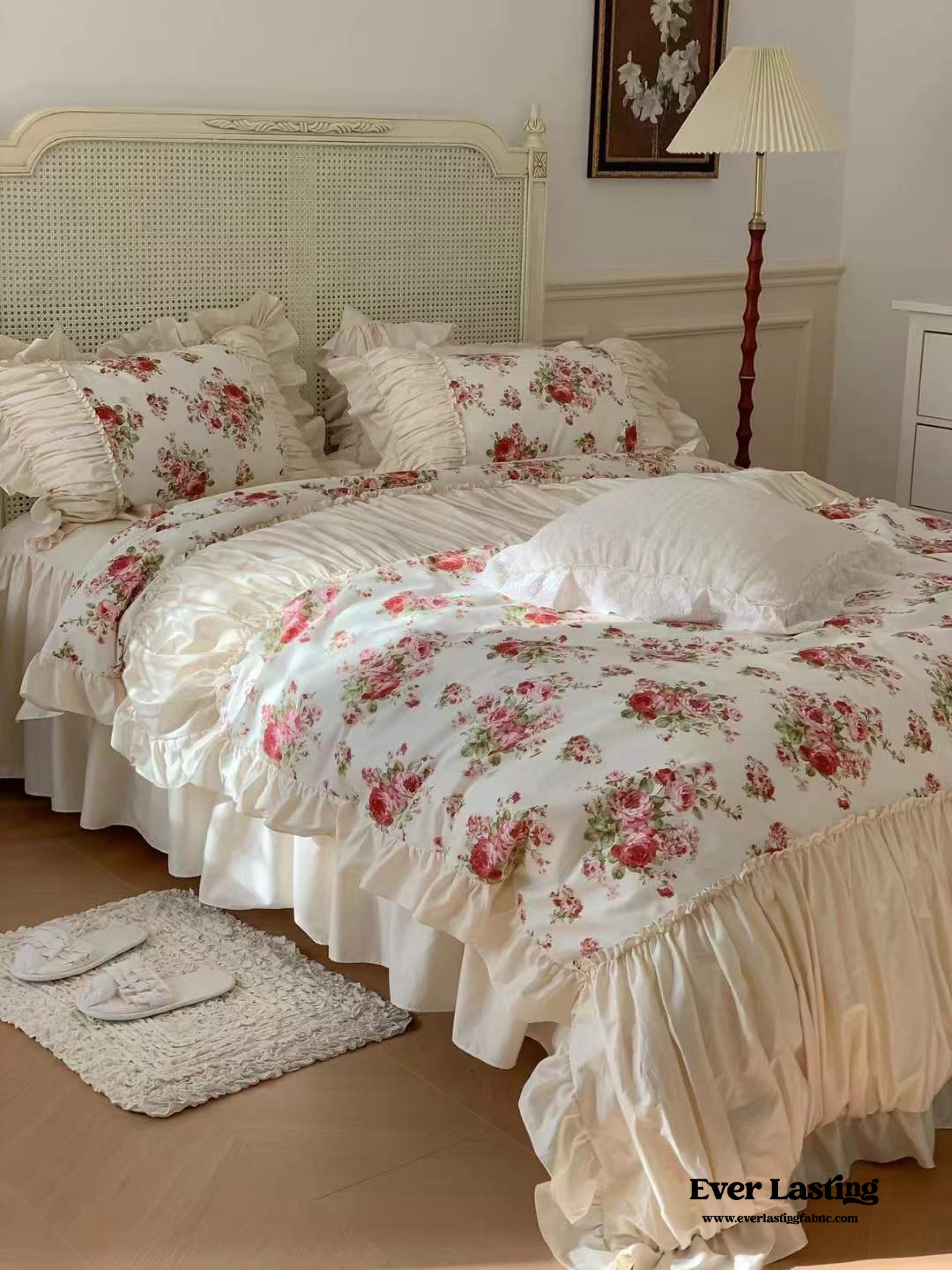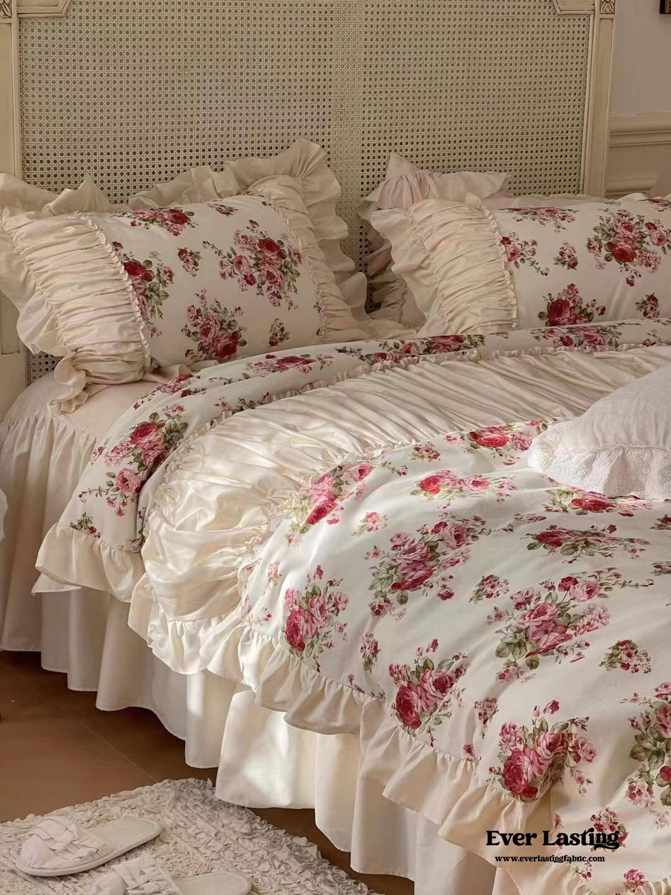 Indulge in the timeless romance of our French Rose Ruffle Bedding Set. Adorned with exquisite ruffles and inspired by the elegance of French aesthetics. this set transforms your bedroom into a sanctuary of luxury and charm. Each duvet cover comes with four corner ties and a hidden zipper to keep your duvet insert in place all night long! Elevate your sleep experience with a touch of floral elegance. creating an atmosphere where comfort and beauty harmonize in every detail.