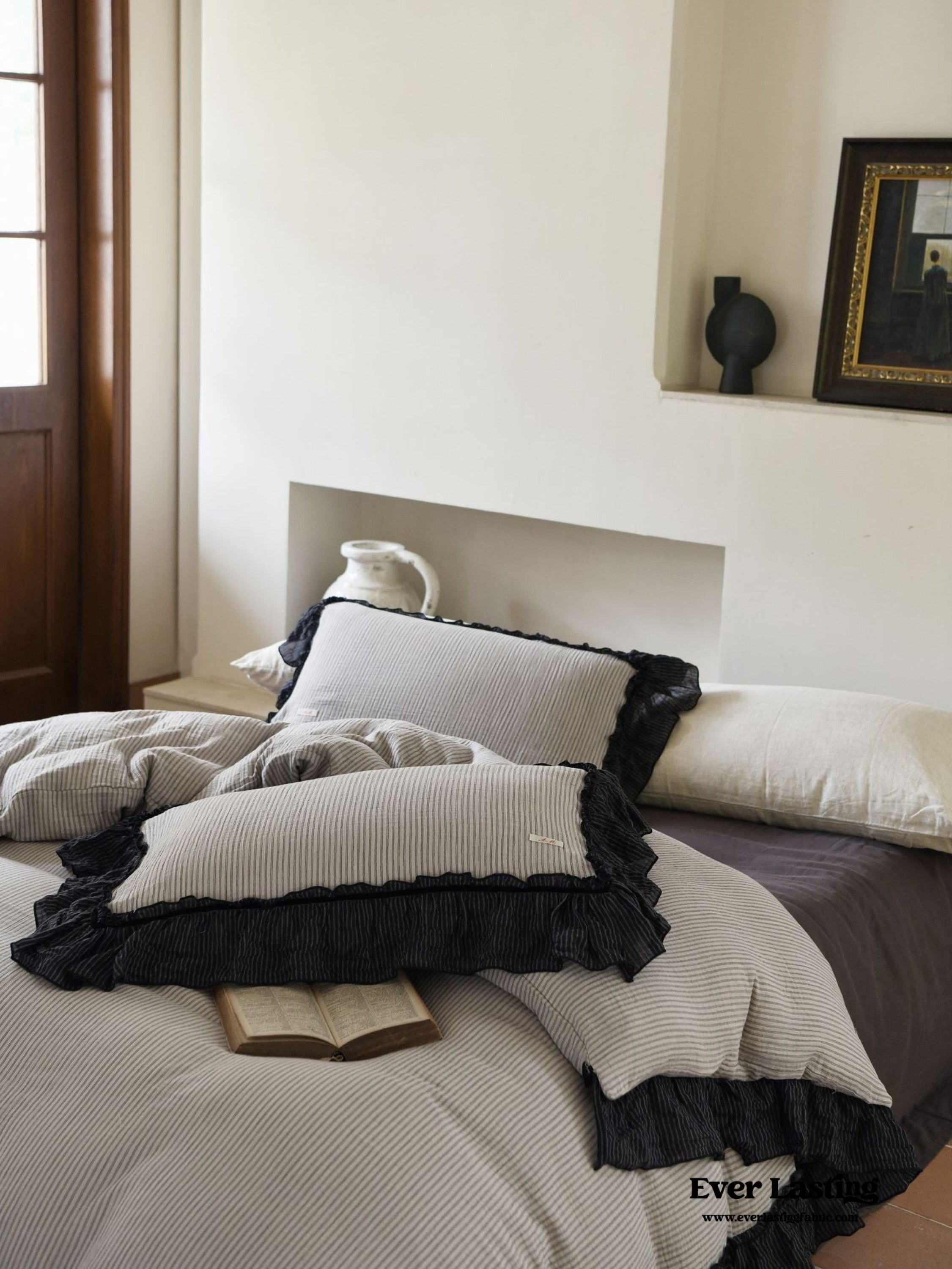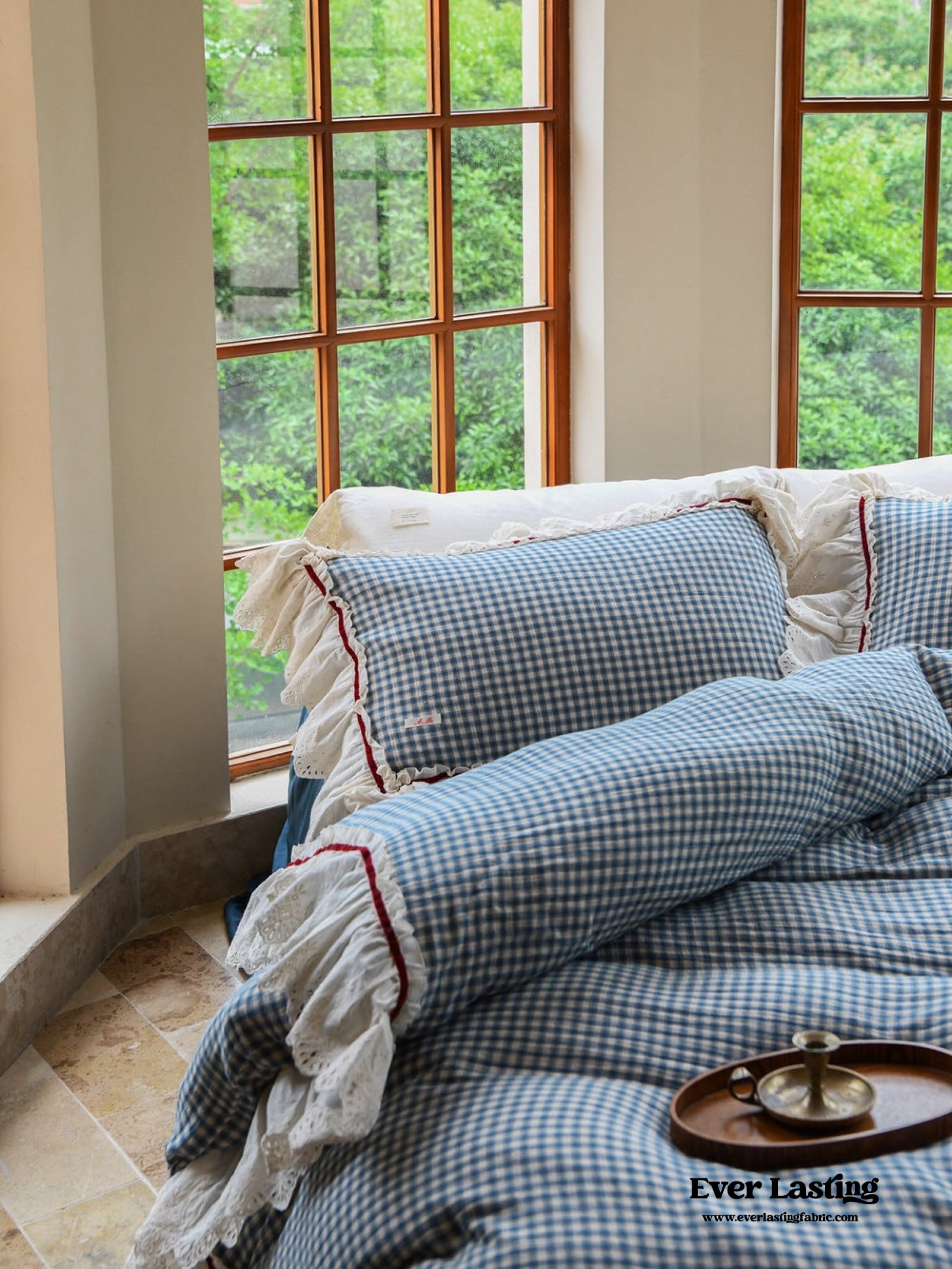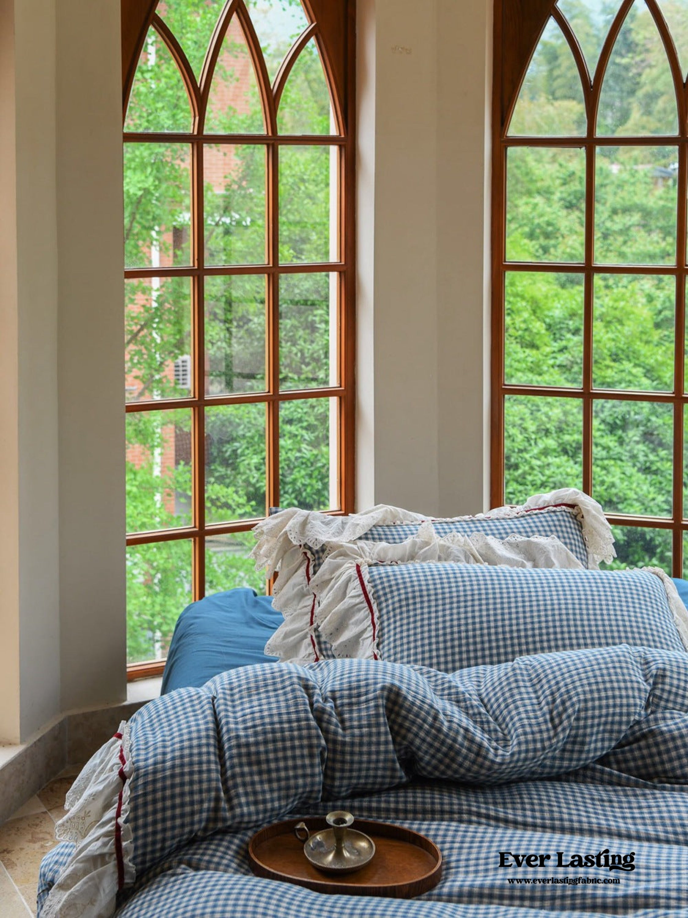 Transform your bedroom into a dreamy oasis with our enchanting Floral Ruffle Bedding Set. Immerse yourself in the soothing embrace of the minimal gingham design. adorned with a delicate hint of ruffle floral lace. all elegantly showcased in a blue color palette. Crafted from premium 100% cotton fabric. this bedding set offers a heavenly combination of breathability and durability. The duvet cover is thoughtfully designed with corner ties and a high-quality invisible zipper. ensuring a seamless and hassle-free experience.
