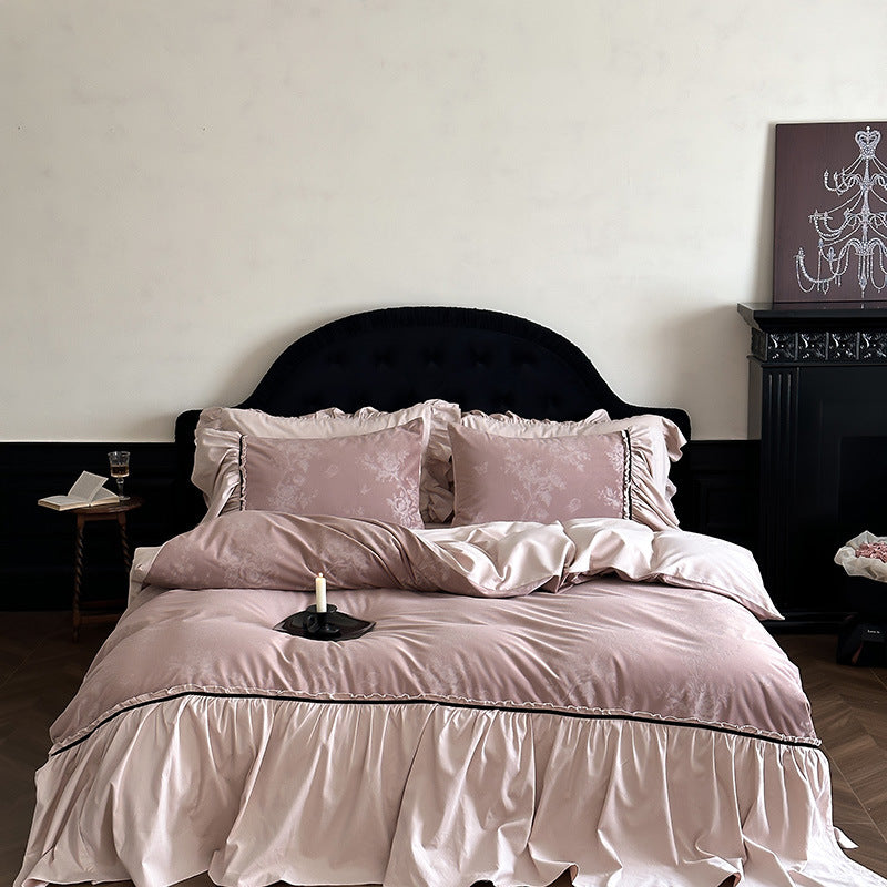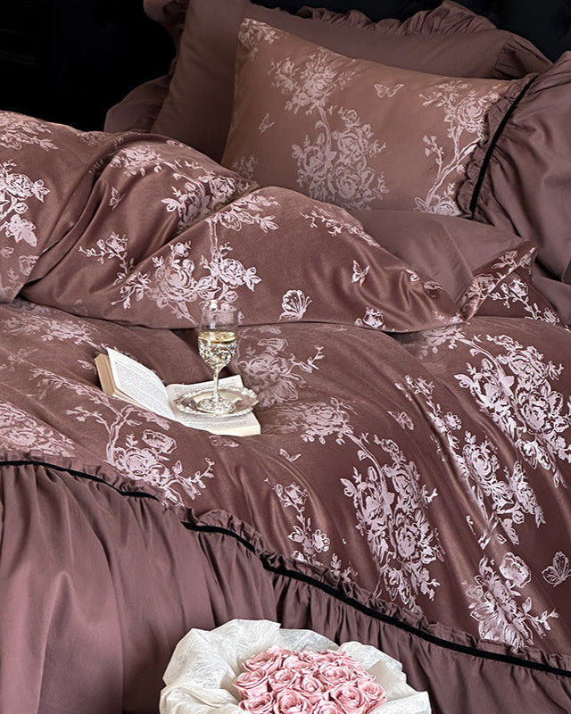 Add a touch of classic elegance to your bedroom with Magchic's Jacquard Gilded Velvet Ruffled Bedding Set. This stunning set pairs intricate jacquard patterns with soft gilded velvet ruffles. creating a rich visual texture. Made from 100% breathable cotton. it delivers comfort and style in equal measure. Each duvet cover features corner ties and zippers to keep your insert in place. ensuring a secure fit and long-lasting use. Perfect for those who embrace vintage elegance. coquette flair. or cozy cottagecore vibes.