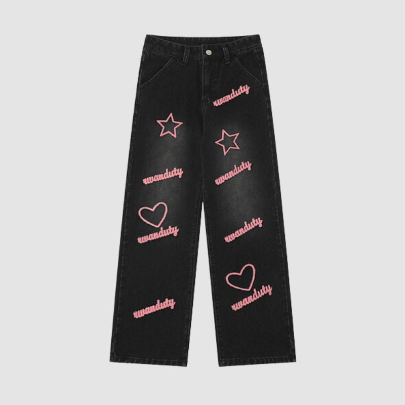 Características: Pantalones. jeans. diseño bordado de letras y estrellas. tela de mezclilla. pierna recta . pierna ancha. ajuste relajado . color sólido. no elástico. cremallera frontal. unisex. trajes de pareja.