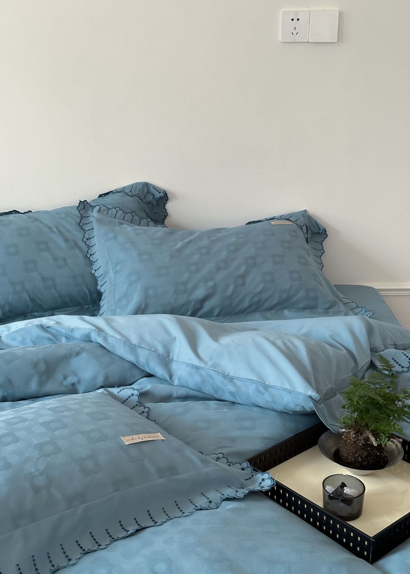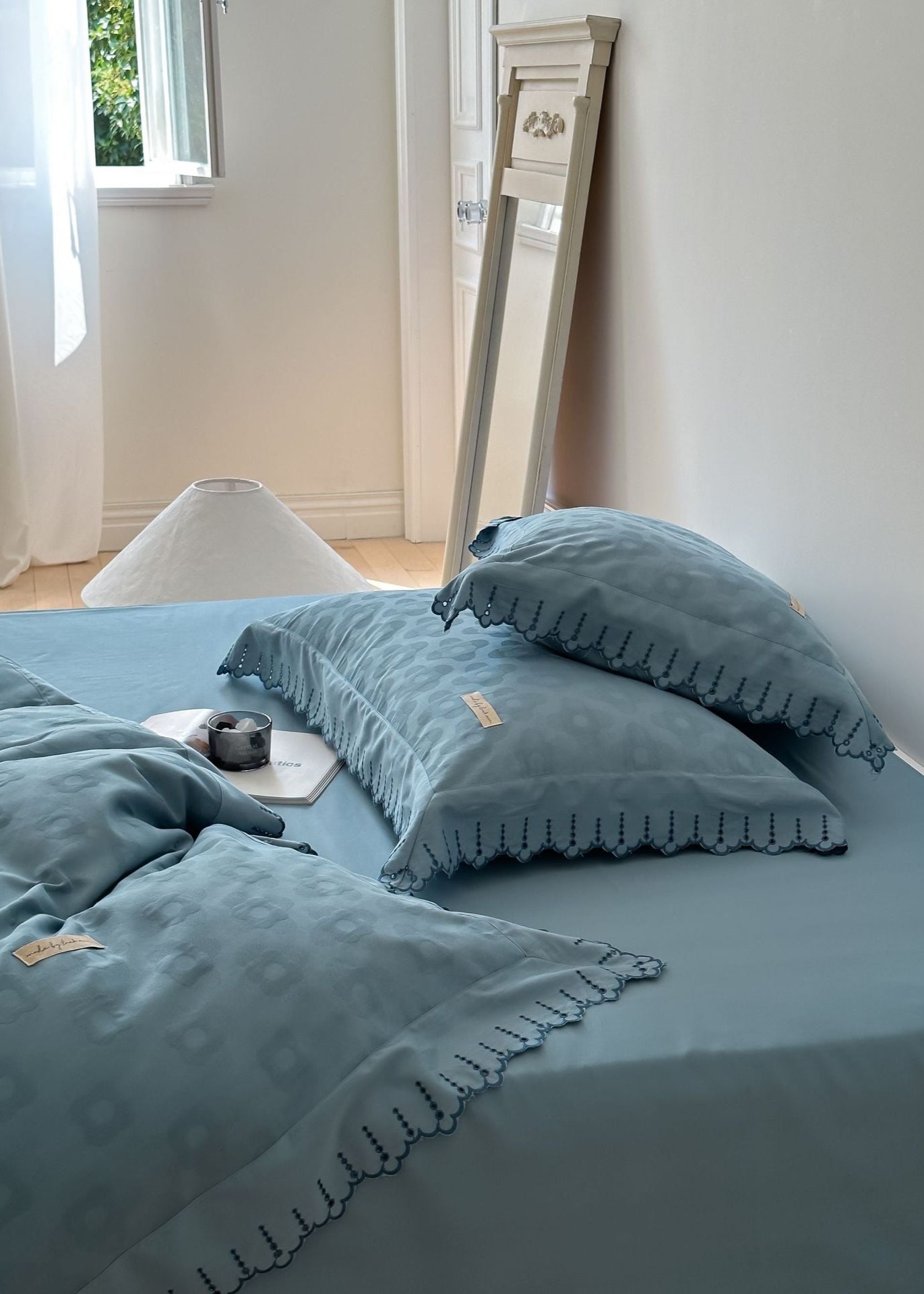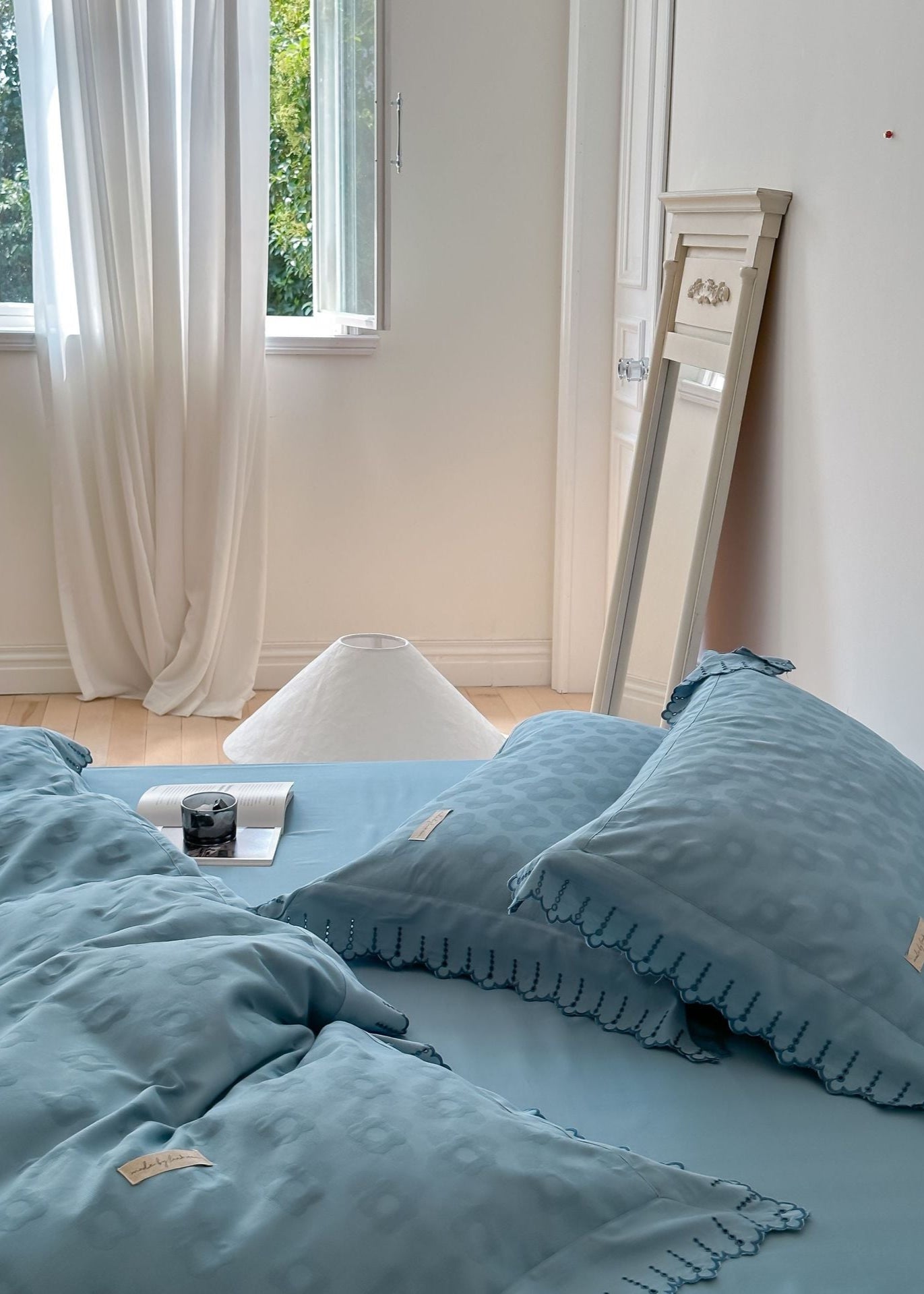 Add a graceful touch to your bedroom with the Magchic's Louisa Ruffle Floral Jacquard Bedding Set. The intricate jacquard floral weave pairs beautifully with soft ruffle edges. creating an effortlessly elegant look. Designed for both beauty and function. the duvet cover includes corner ties and a hidden zipper to keep your insert secure and your bed looking refined. A perfect blend of classic design and modern comfort.