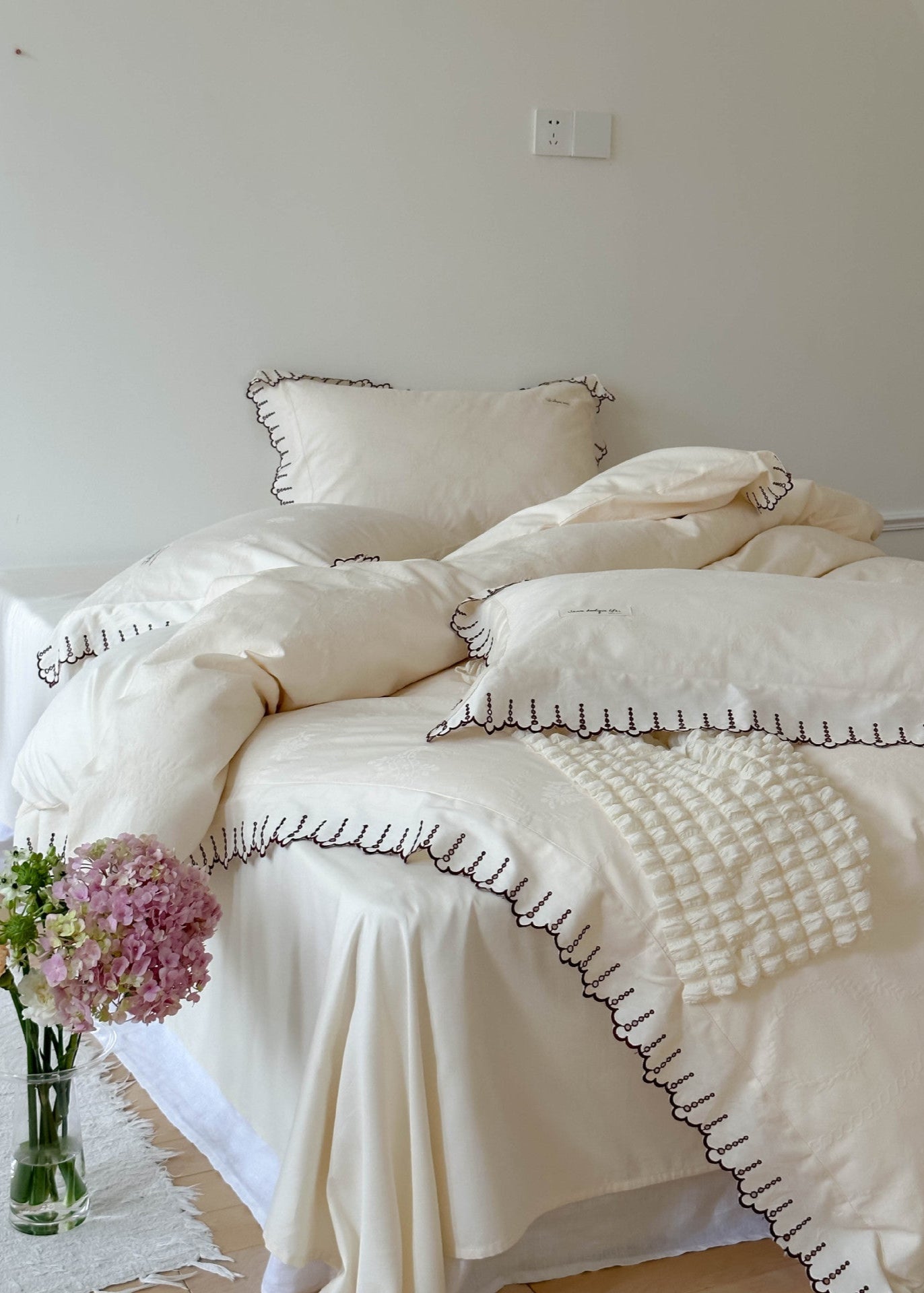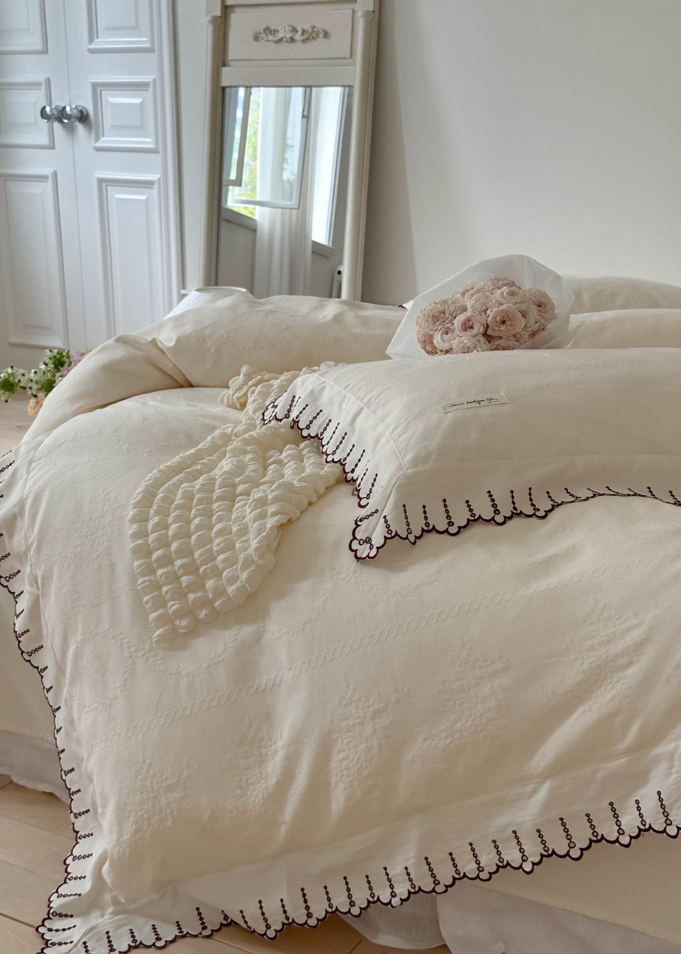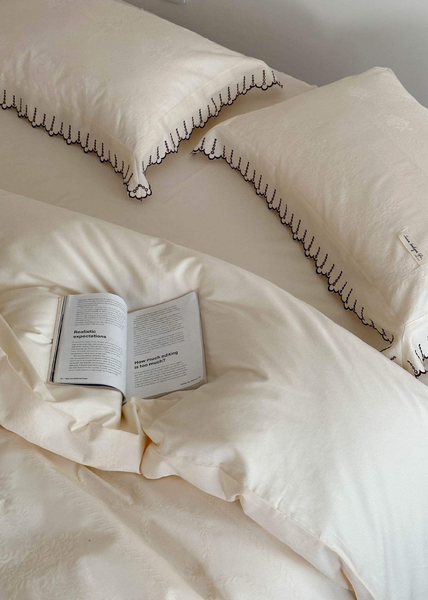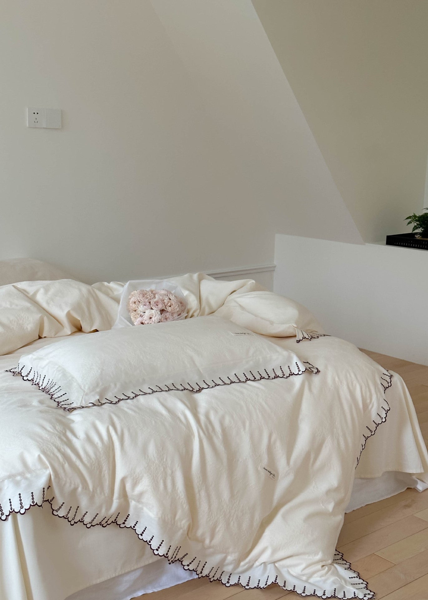 Add a graceful touch to your bedroom with the Magchic's Louisa Ruffle Floral Jacquard Bedding Set. The intricate jacquard floral weave pairs beautifully with soft ruffle edges. creating an effortlessly elegant look. Designed for both beauty and function. the duvet cover includes corner ties and a hidden zipper to keep your insert secure and your bed looking refined. A perfect blend of classic design and modern comfort.