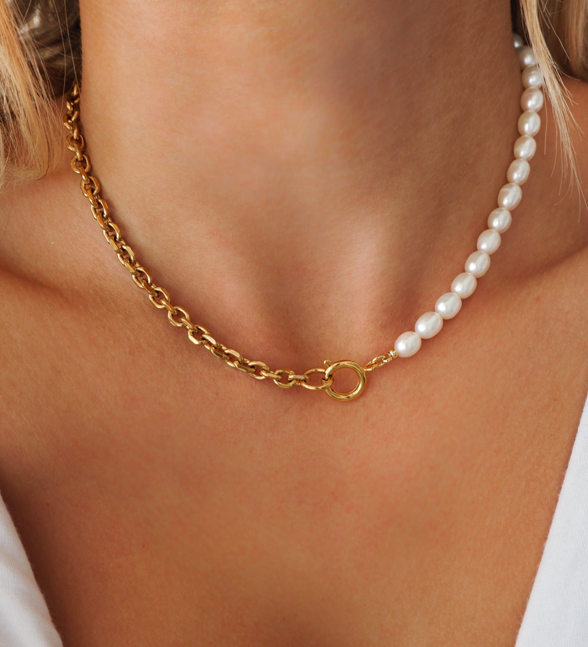 Collar de media cadena con perlas blancas de agua dulce y cierre de eslabones dorados