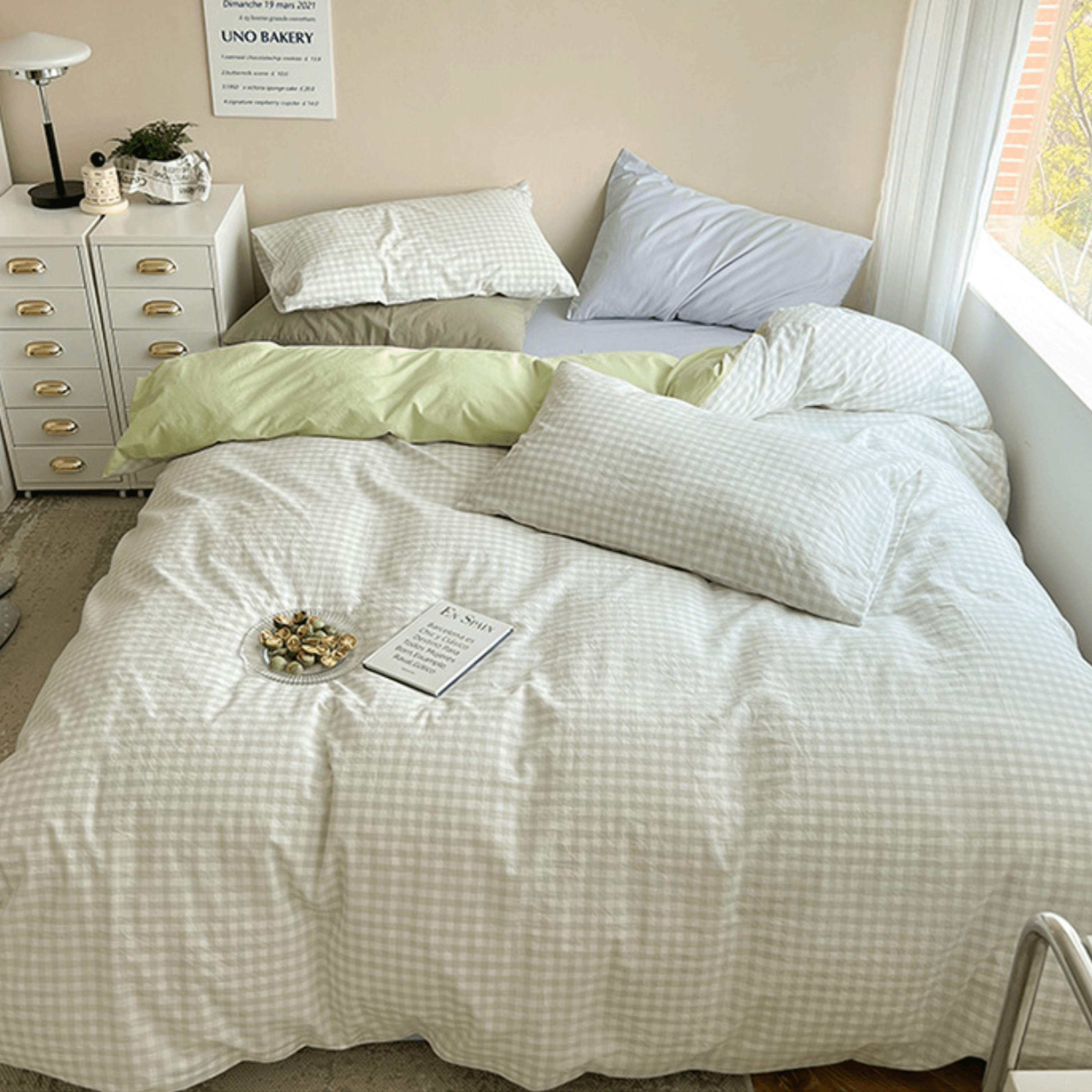 Introducing our new gingham bedding set with pastel shades and mixed pattern design. Made with 100% washed cotton that becomes softer with each wash. Duvet cover comes with 4 corner loops and hidden zipper to help keep your duvet insert clean.