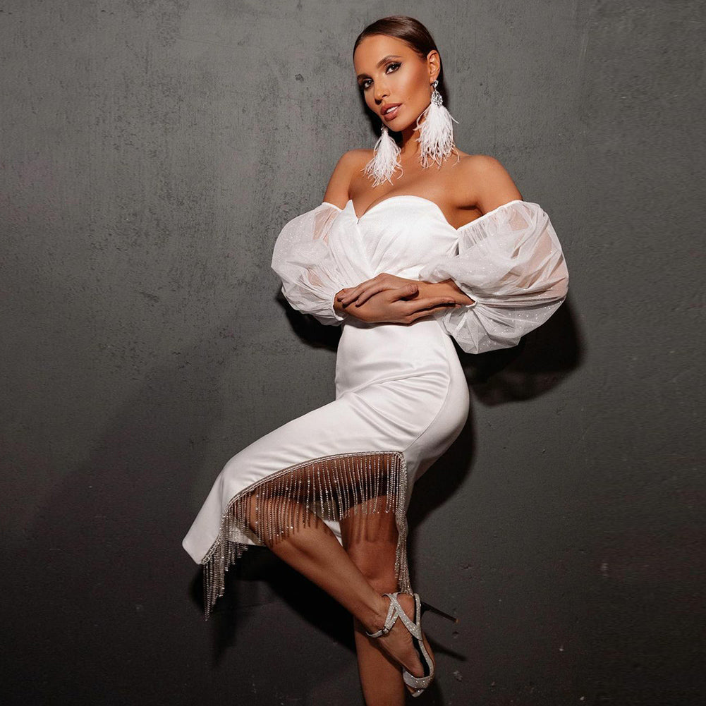Vestido midi ajustado con borlas, manga larga y hombros descubiertos