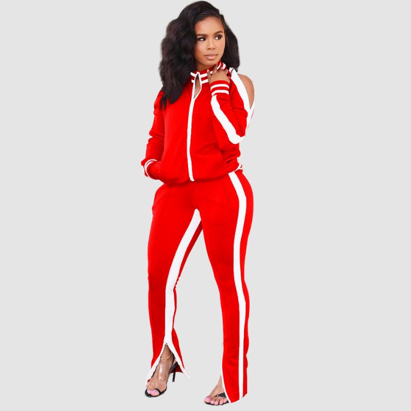 Características: Conjunto. Pantalones. Cuello en V. Solapa. Cremallera. Manga larga. Pantalón largo. Abertura. Hombros descubiertos. Diseño de rayas laterales. Cintura alta. Entallado. Color liso.