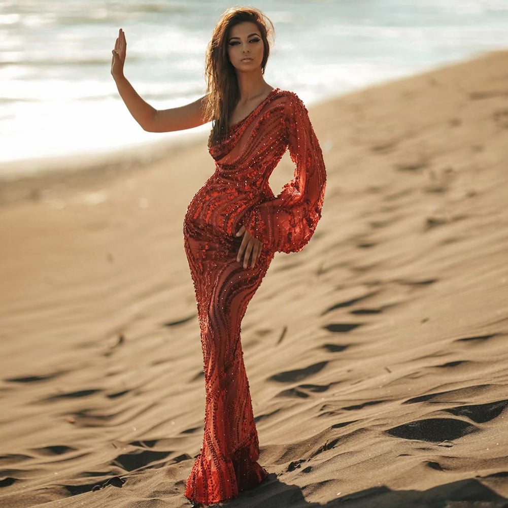 Vestido maxi ajustado asimétrico de manga larga con un solo hombro HT2597