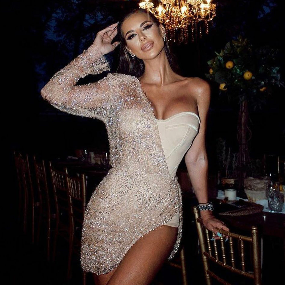 Vestido mini ajustado con lentejuelas, manga larga y un hombro