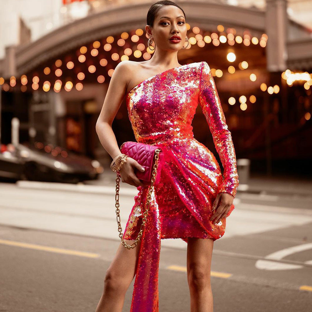 Vestido mini ajustado con lentejuelas, manga larga y un solo hombro HL9015
